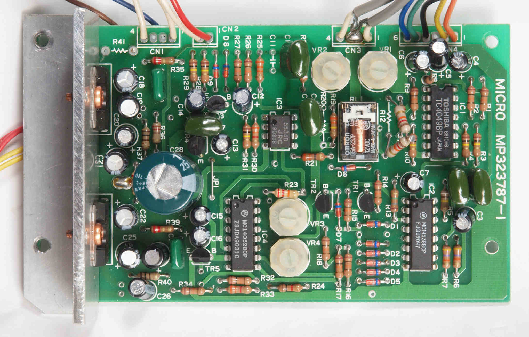 | C22. 修理後 モーターコントロール基板、 半固定VR4個、電解コンデンサー18個、モーター駆動AMP−IC.2個交換 |