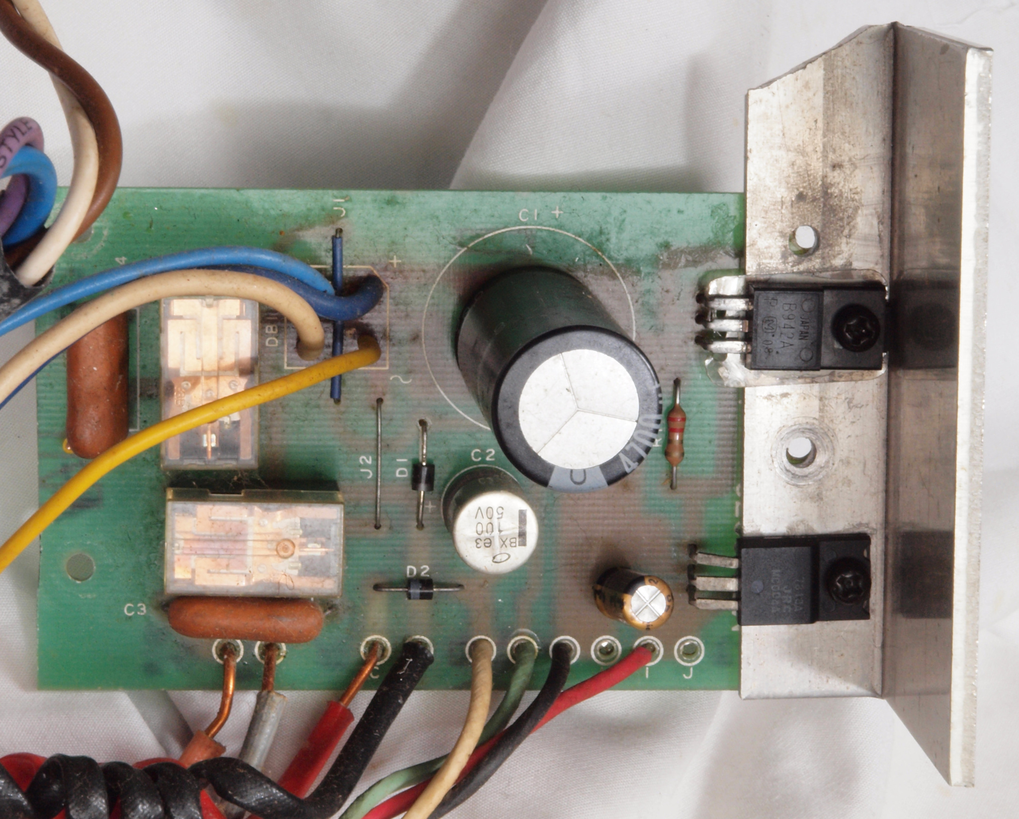 C12 .修理後 電源部整流基板。 電解コンデンサー3個、リレー2個、整流ブリッジダイオード1個、TR(トランジスター)1個交換。フイルムコンデンサー2個、整流ブリッジダイオードに放熱器追加。