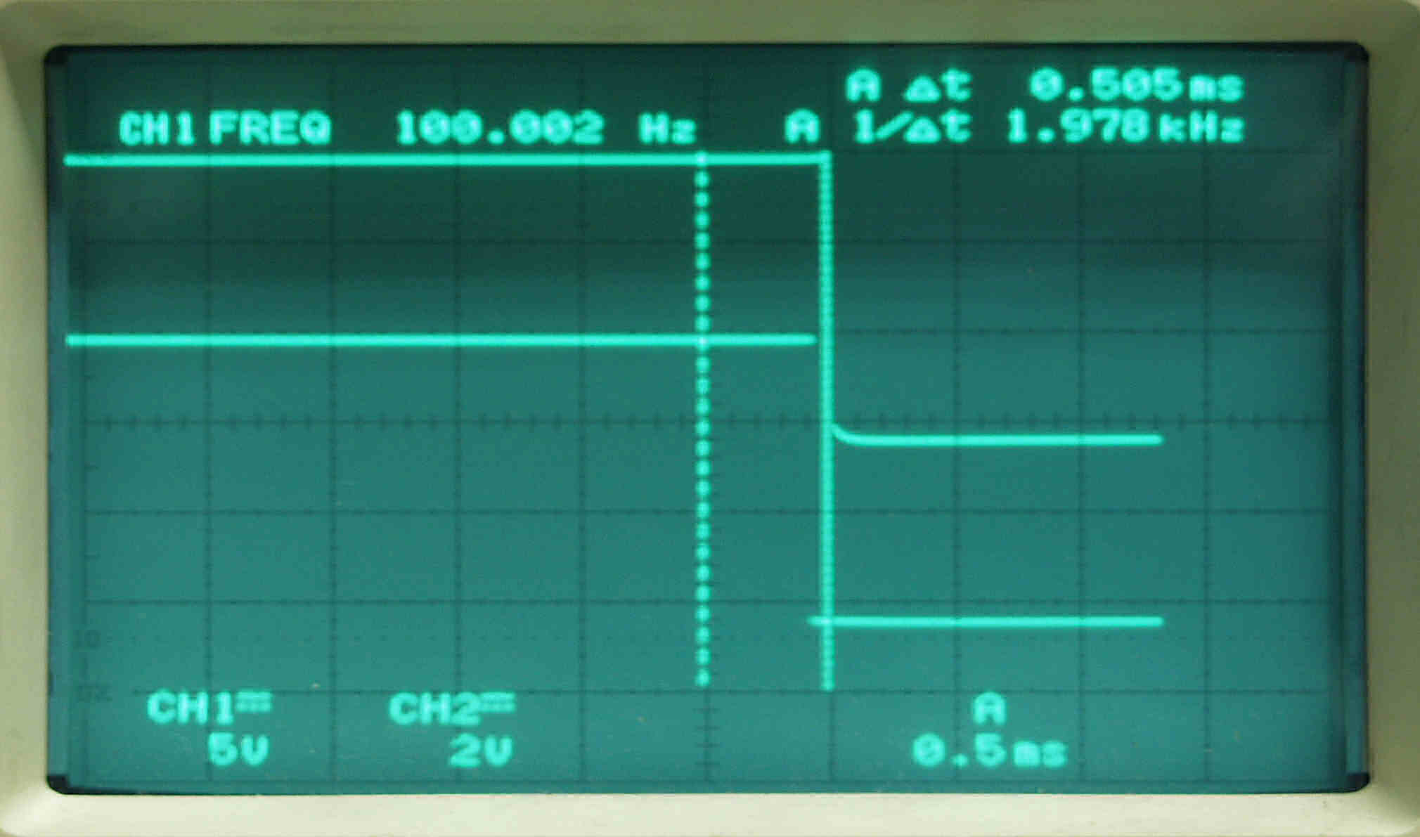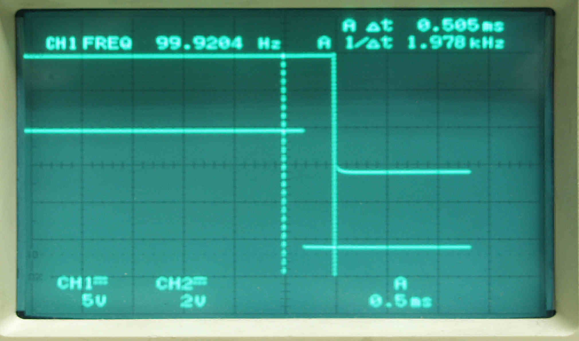 | AE22. 45回転測定。 上のが134HZ基準矩形波、下がタンテーブルの回転矩形波。 差が最大時。 上下の点線のスケール間が、仕様書規定許容値の0.5ms、十分に規格内 |