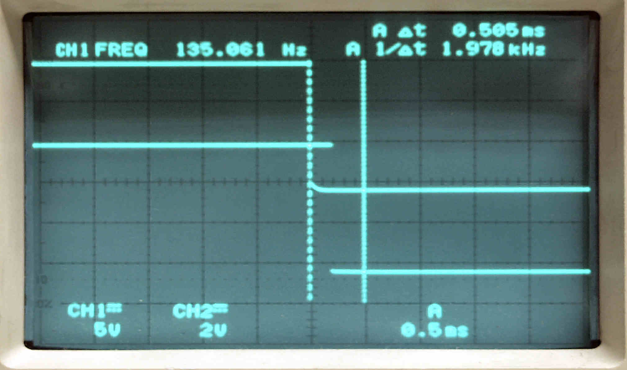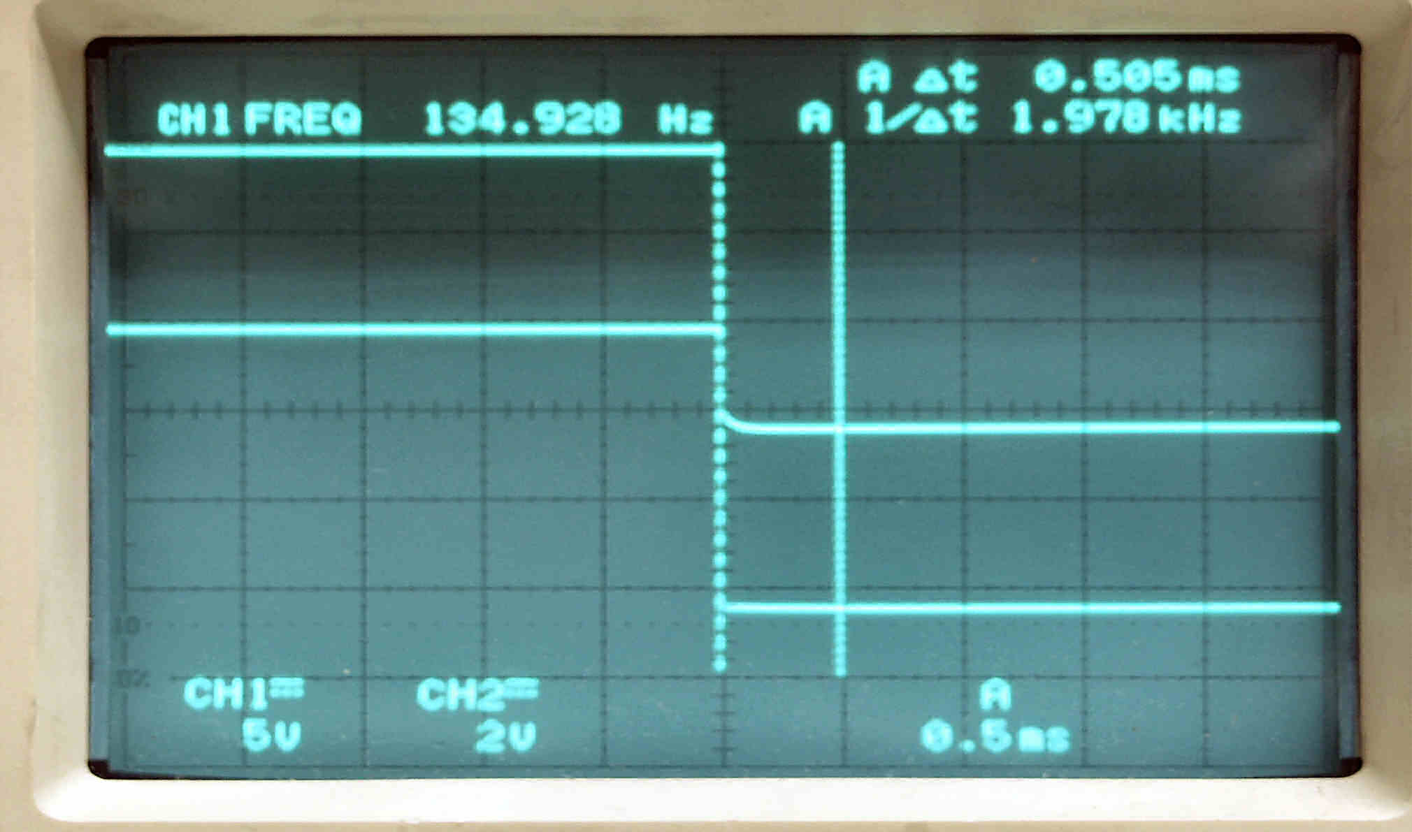 | AE21. 45回転測定。 上のが134HZ基準矩形波、下がタンテーブルの回転矩形波。 差が最小時。 上下の点線のスケール間が、仕様書規定許容値の0.5ms。 |