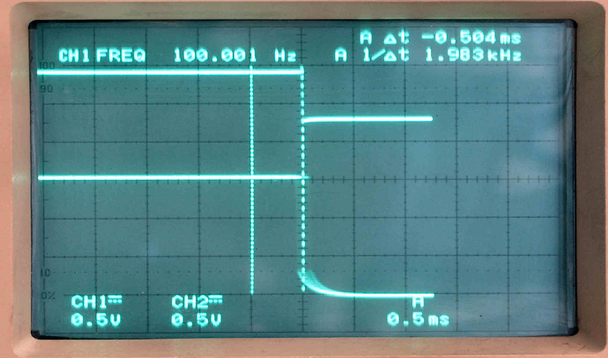 | AE. 仮修理での測定 AE11. 33回転測定。 上のが100HZ基準矩形波、下がタンテーブルの回転矩形波。 差が最小時。 上下の点線のスケール間が、仕様書規定許容値の0.5ms |