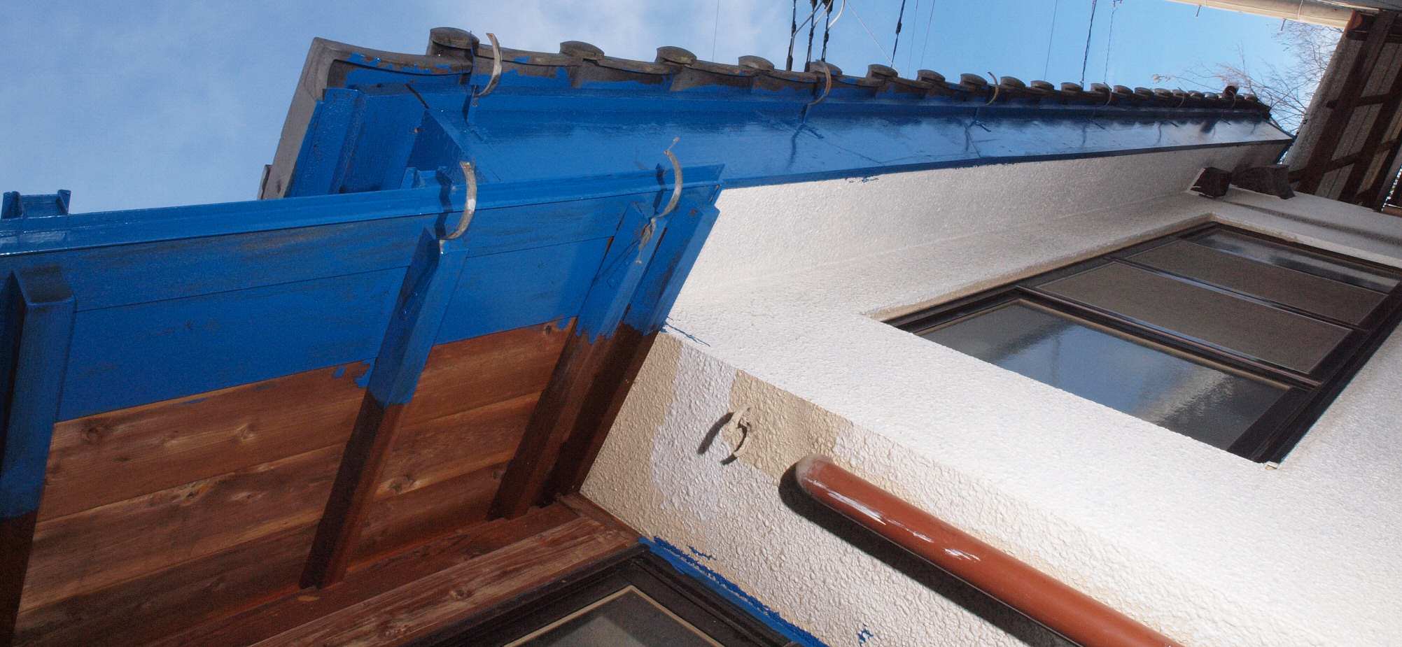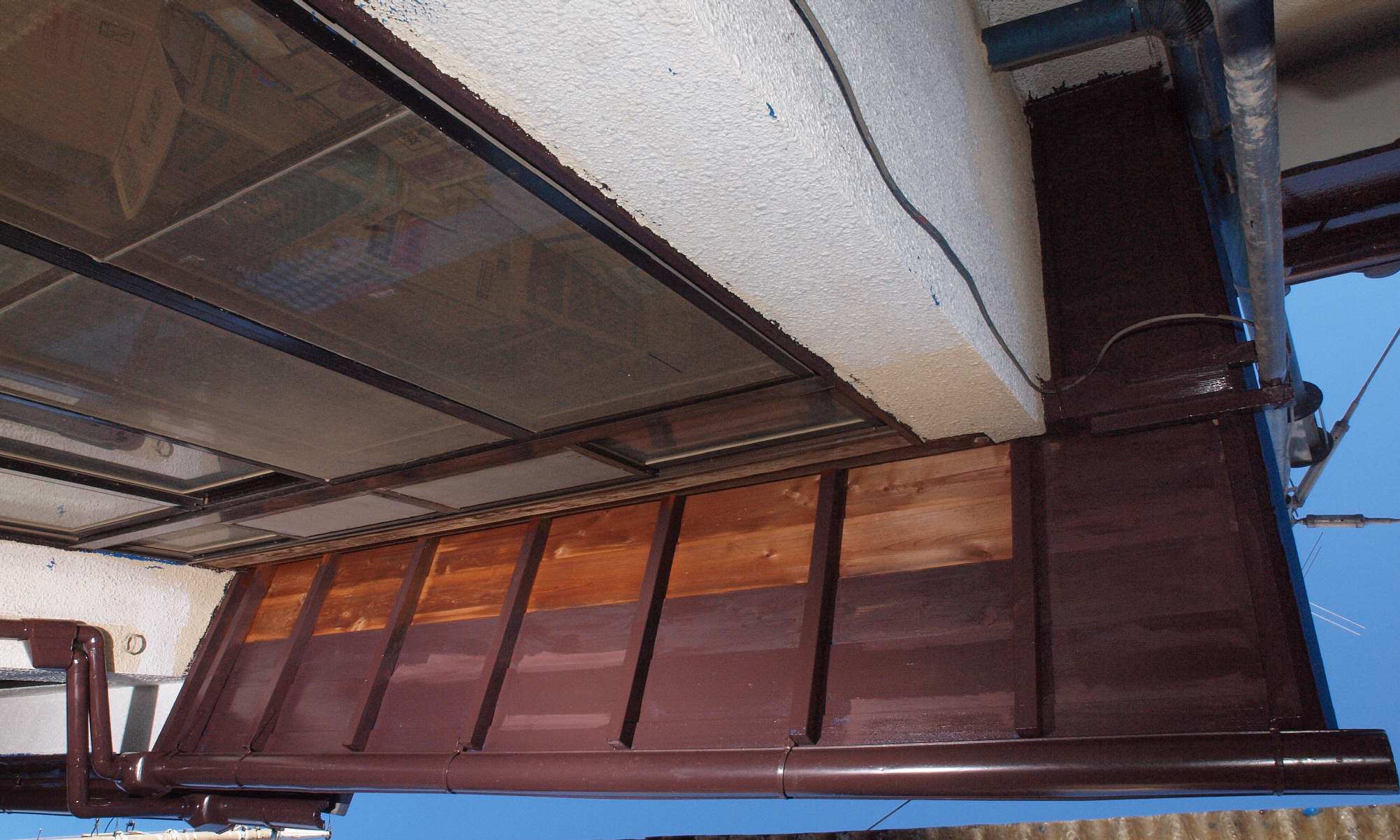 | 42. 修理中 1F台所 北側軒天・鼻隠板、東側から。 1回目の塗装終了。 |