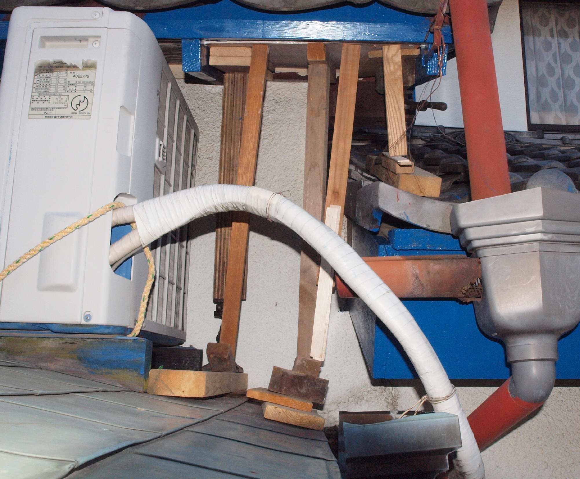 | 11. 修理中 1F茶室 北側軒天。 エアコン室外機の影響で軒天ベニヤが腐食。 |