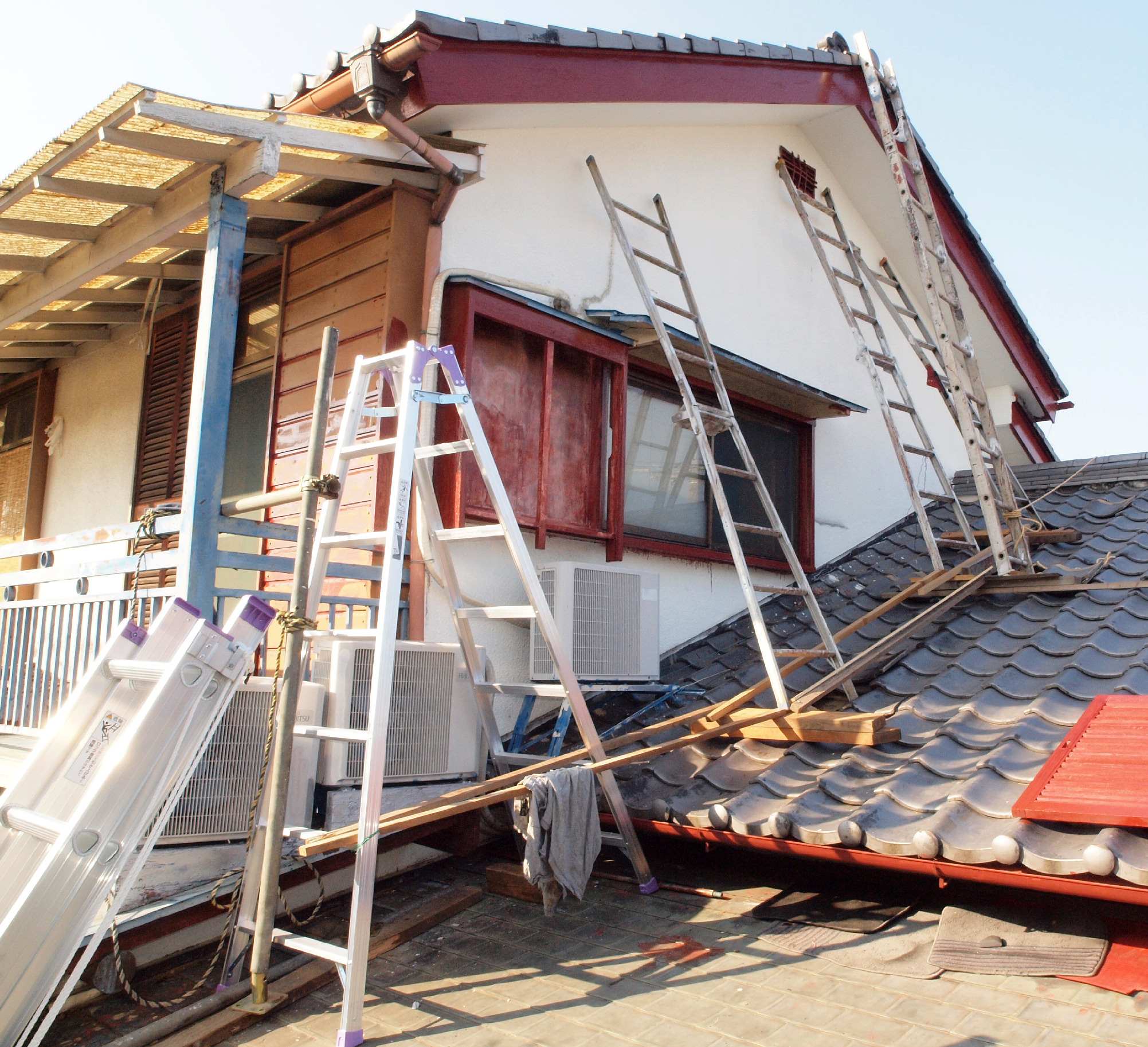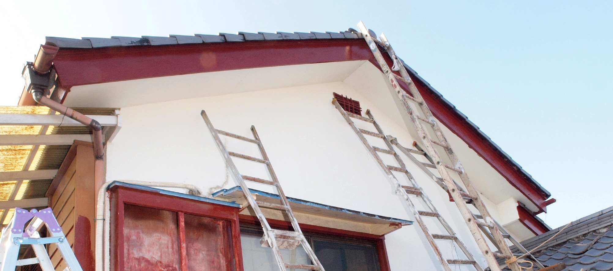 | 4. 平成29年修理中 軒天塗装。 破風下端も塗装する。 |