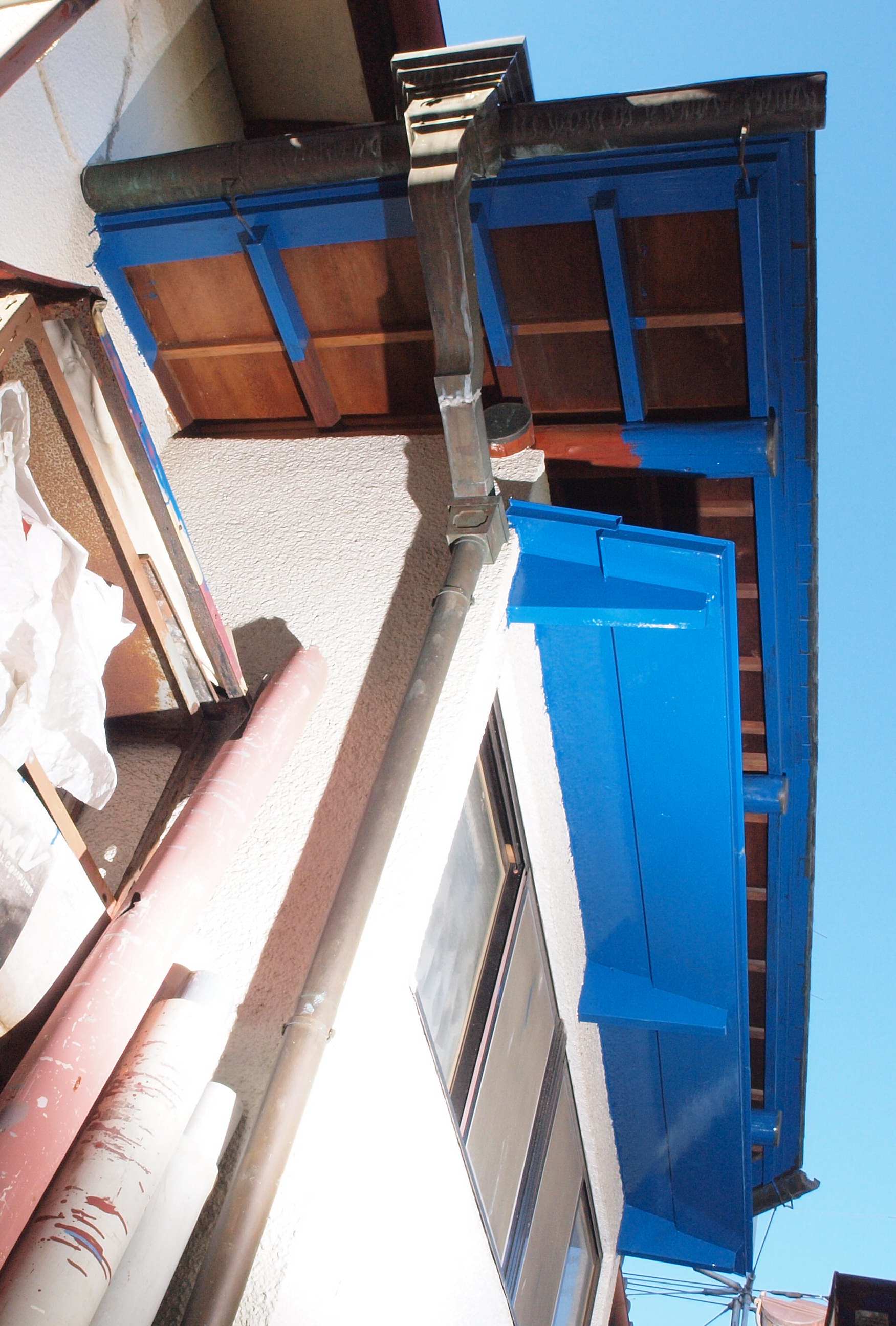 32. 塗装中 西側軒天、1回目の塗装終了。