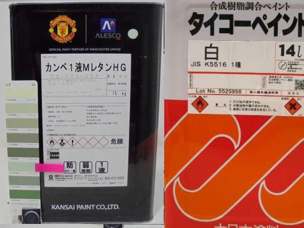 A1. 平成29年使用塗料。 左=竹用2缶、右=1部裏側に使用。