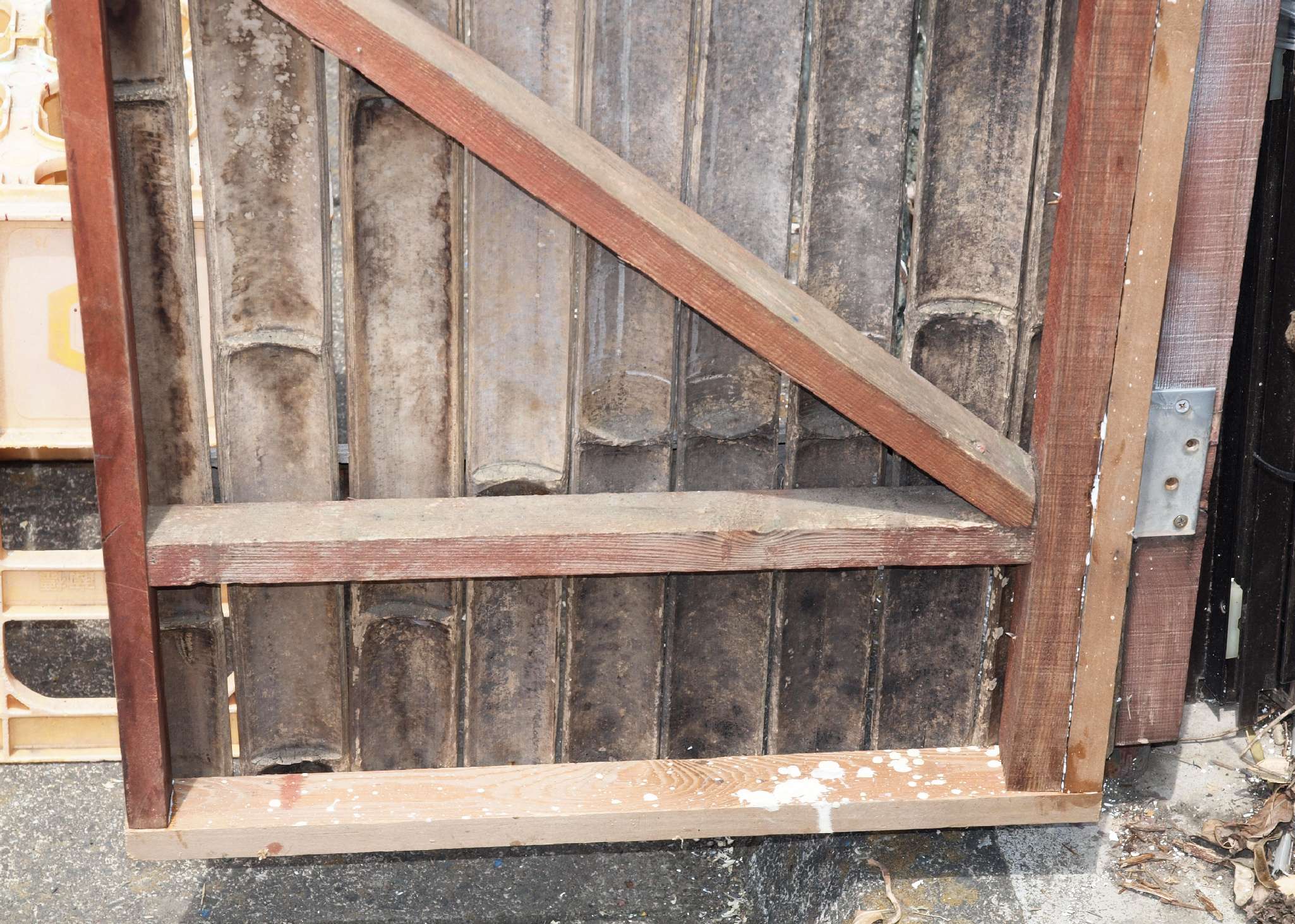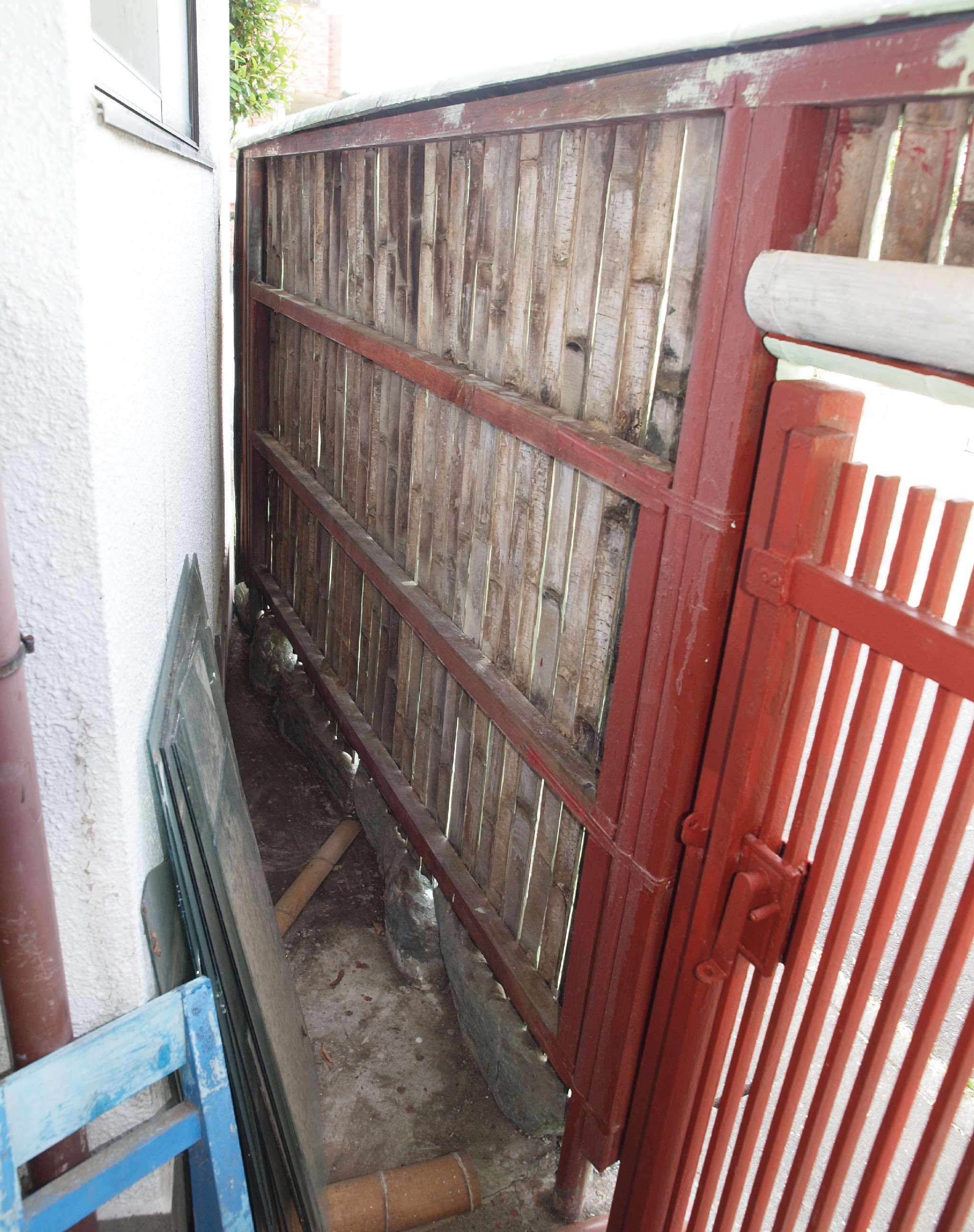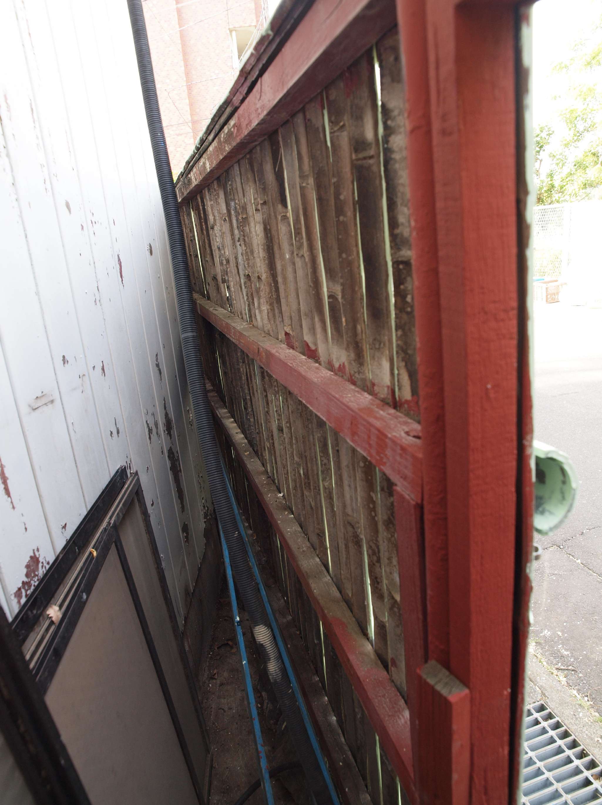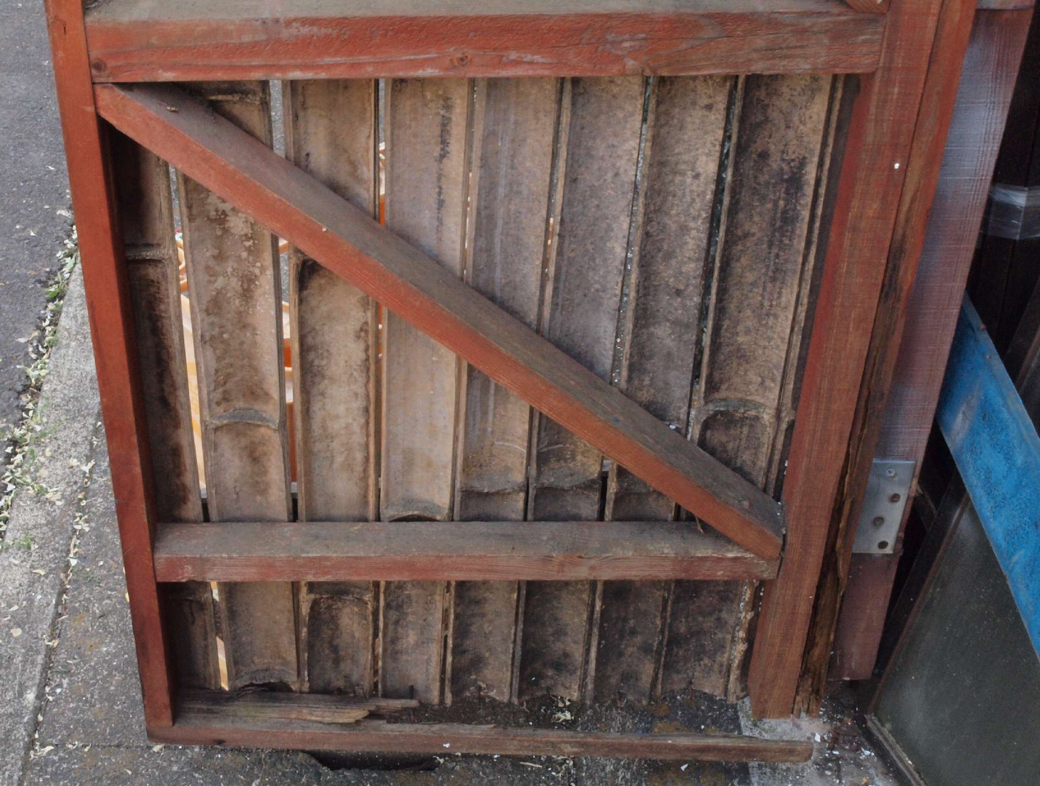 72. 修理前 西側建仁寺垣、扉裏側。下部分の桟木が腐っている。