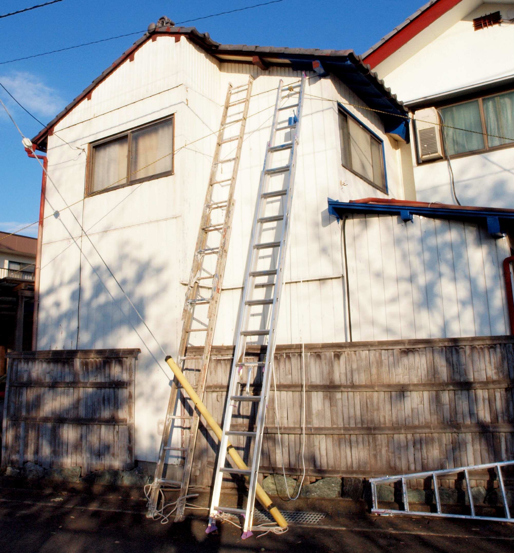 | C1. 平成25年塗装中 2段ハシゴは2方向にトラを取る。念の為、足も固定する。 |