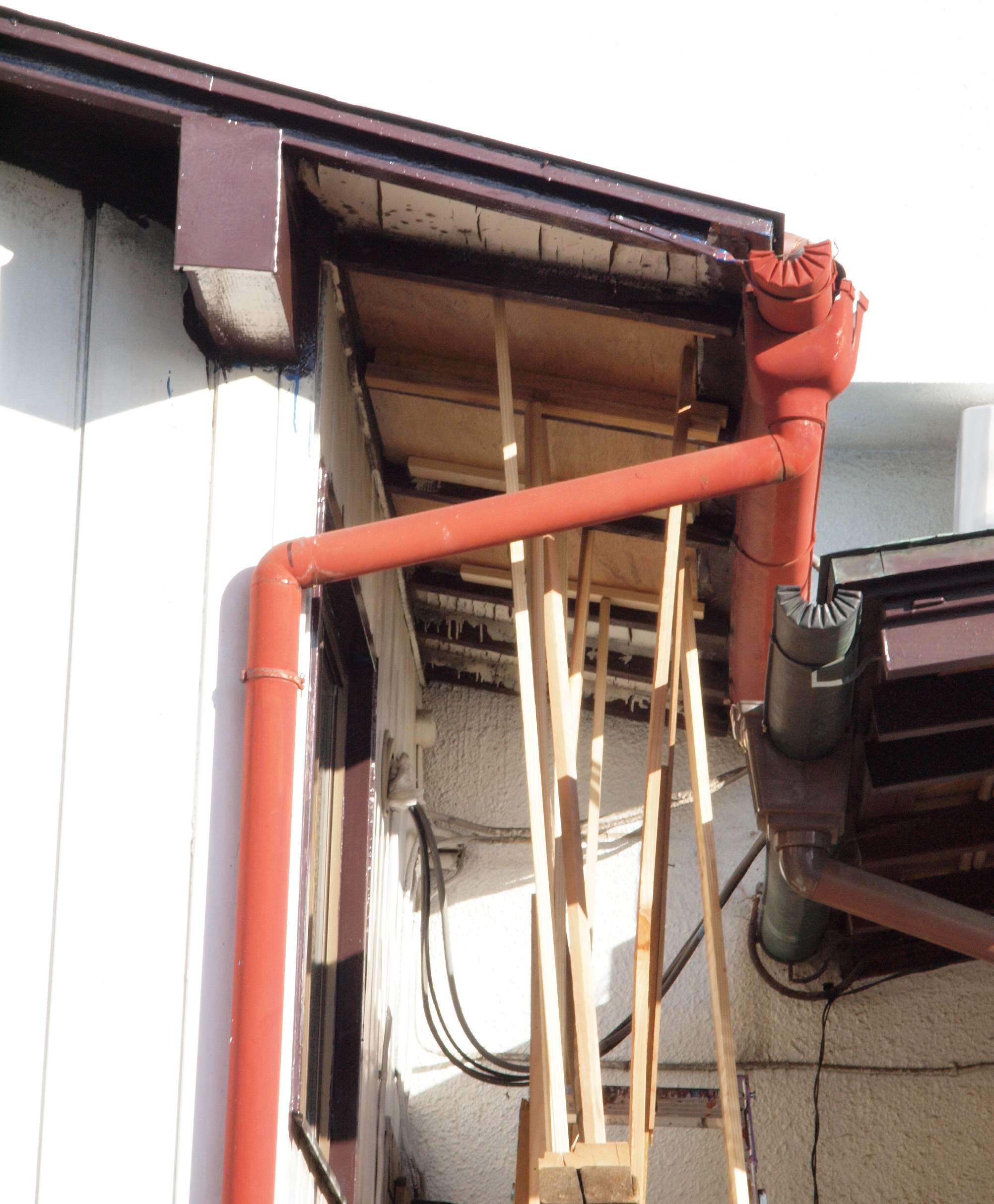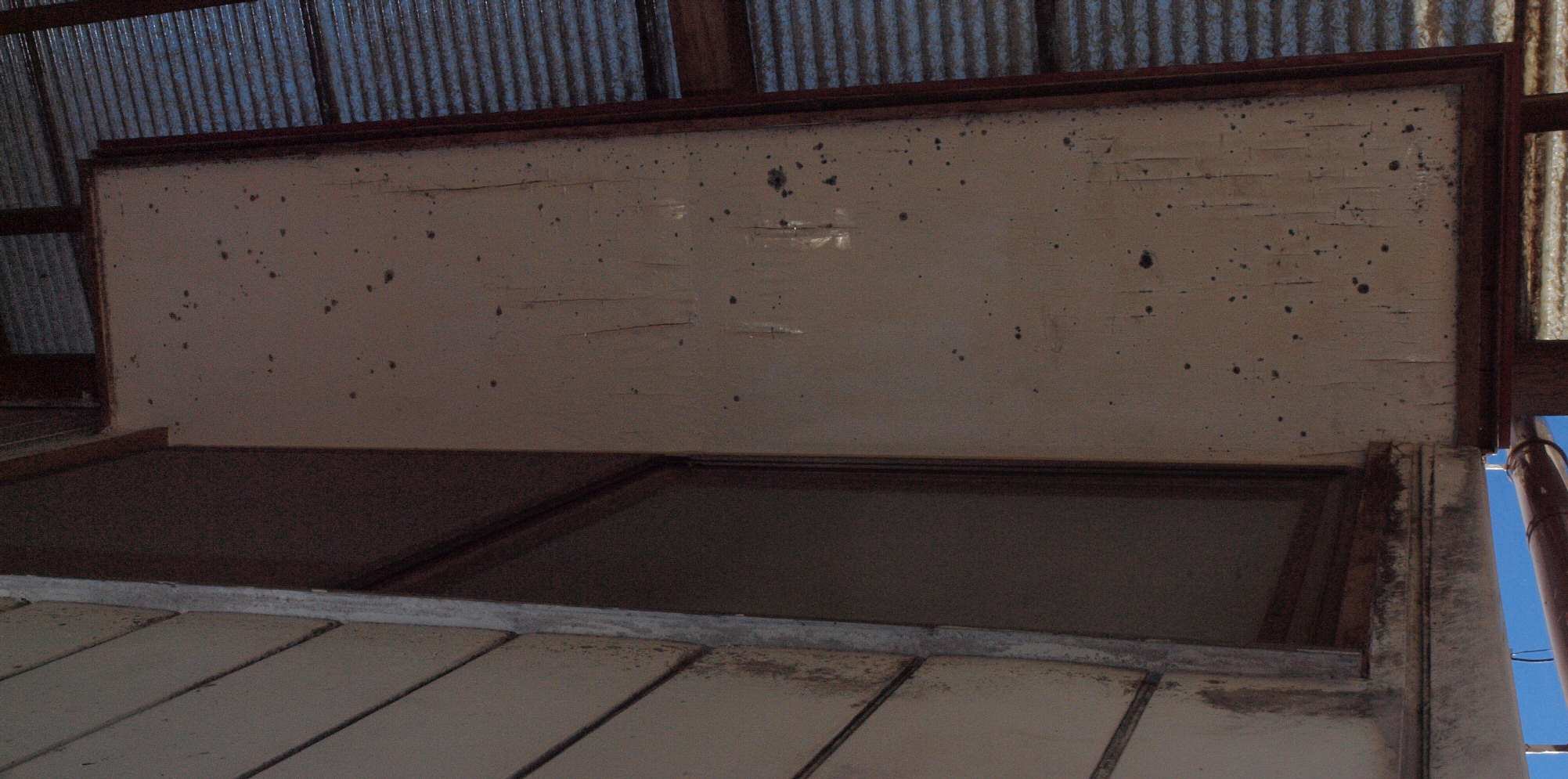 | 82. 平成25年修理中 1階南側軒天。4mmベニヤをボンドとビスで固定し、下から押し上げて接着。 |