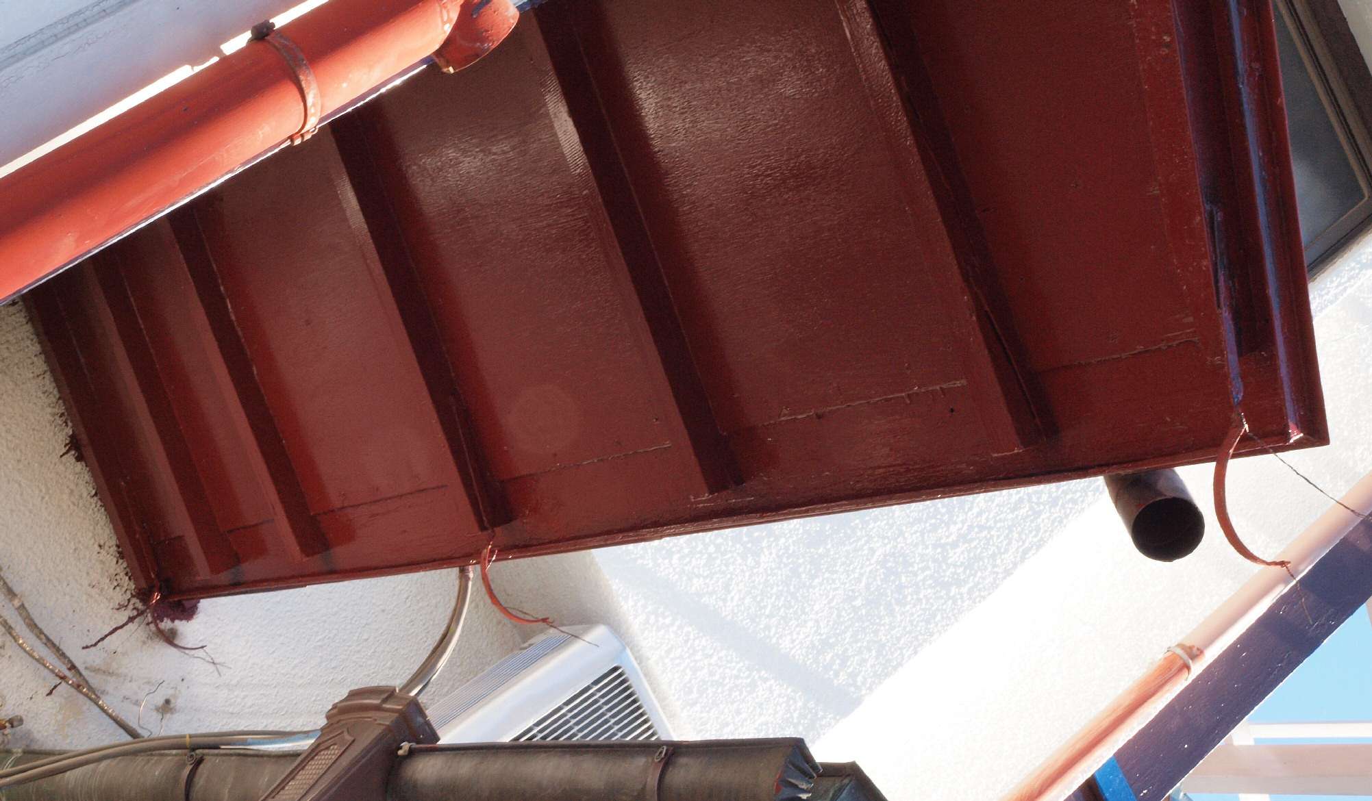 | 85. 平成25年塗装中 1階南側軒天。 広小舞、水切り鉄板を塗装。 |