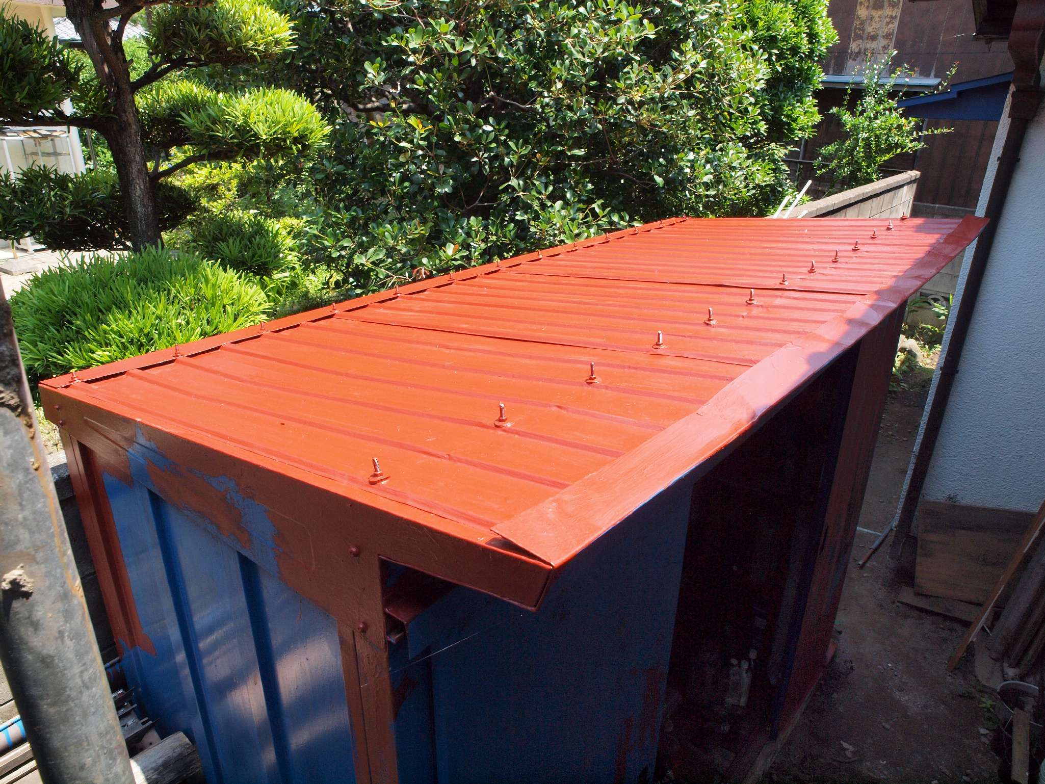 11. 修理中 大雪で屋根の波板前の部分が曲がってしまったので、修理後錆止め塗装終了。