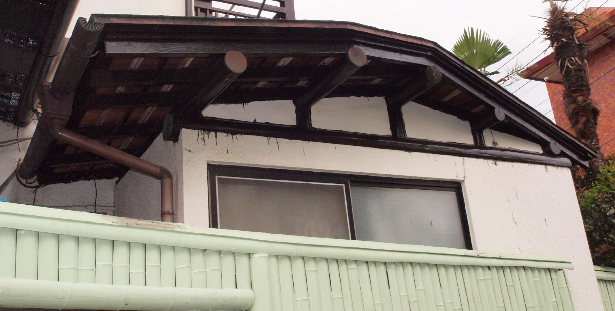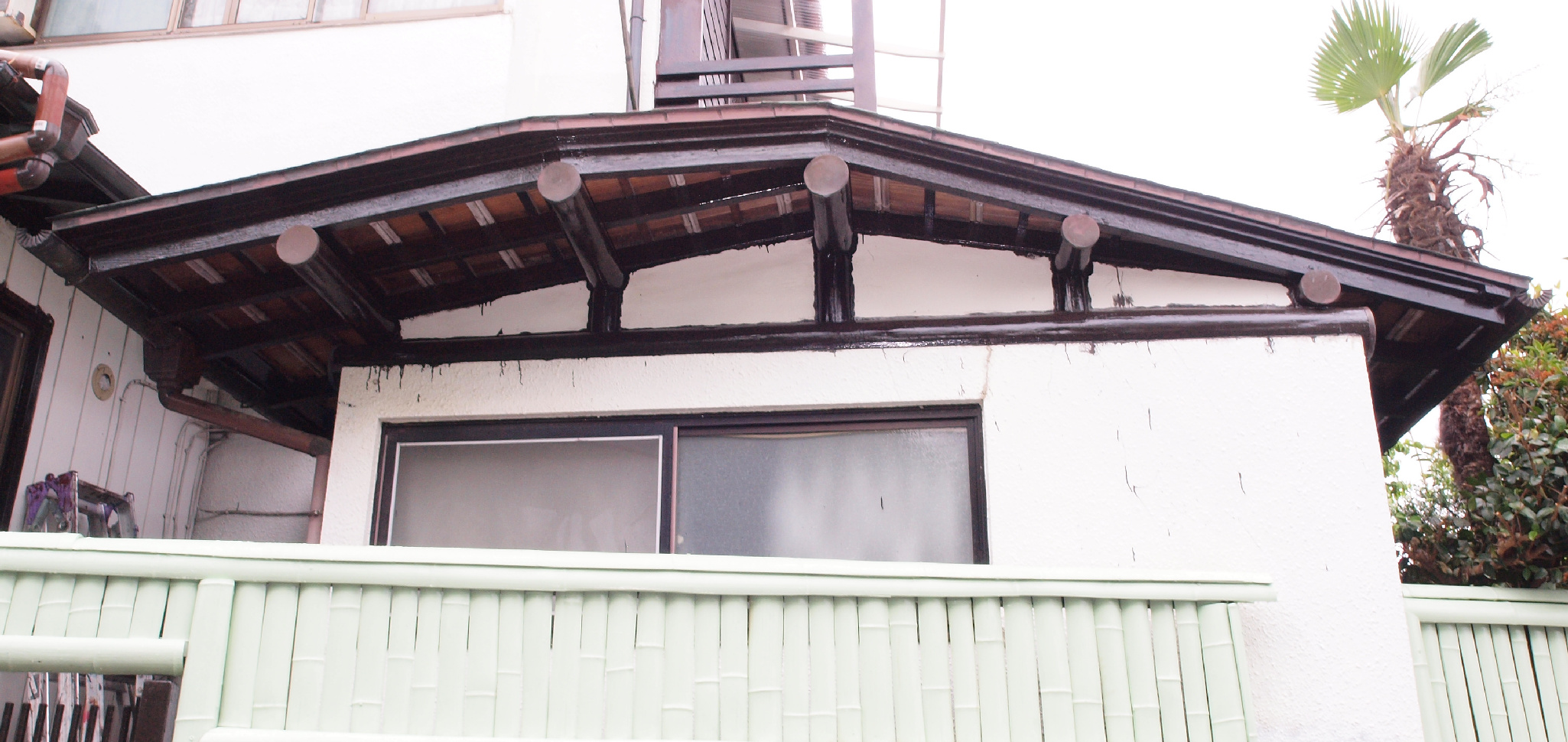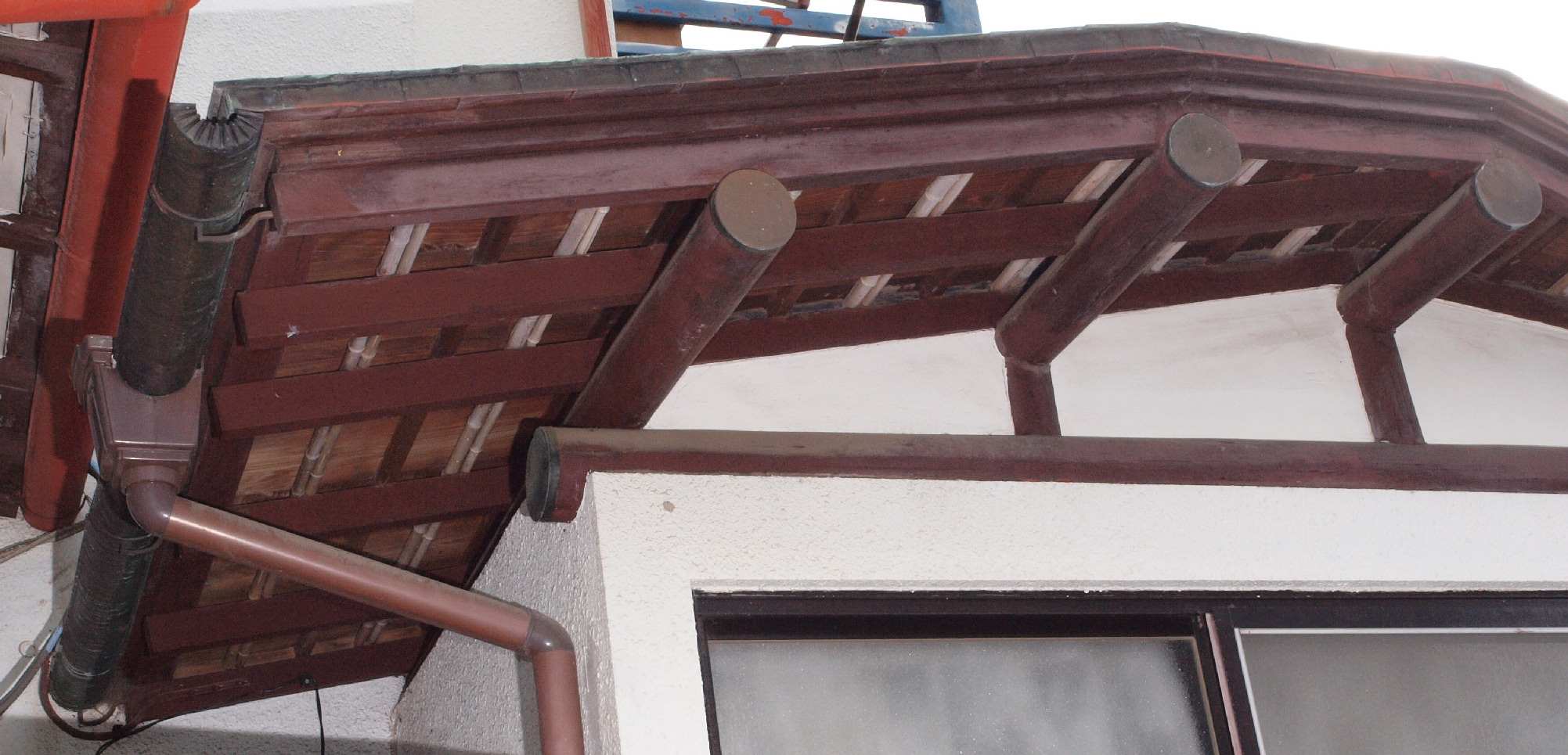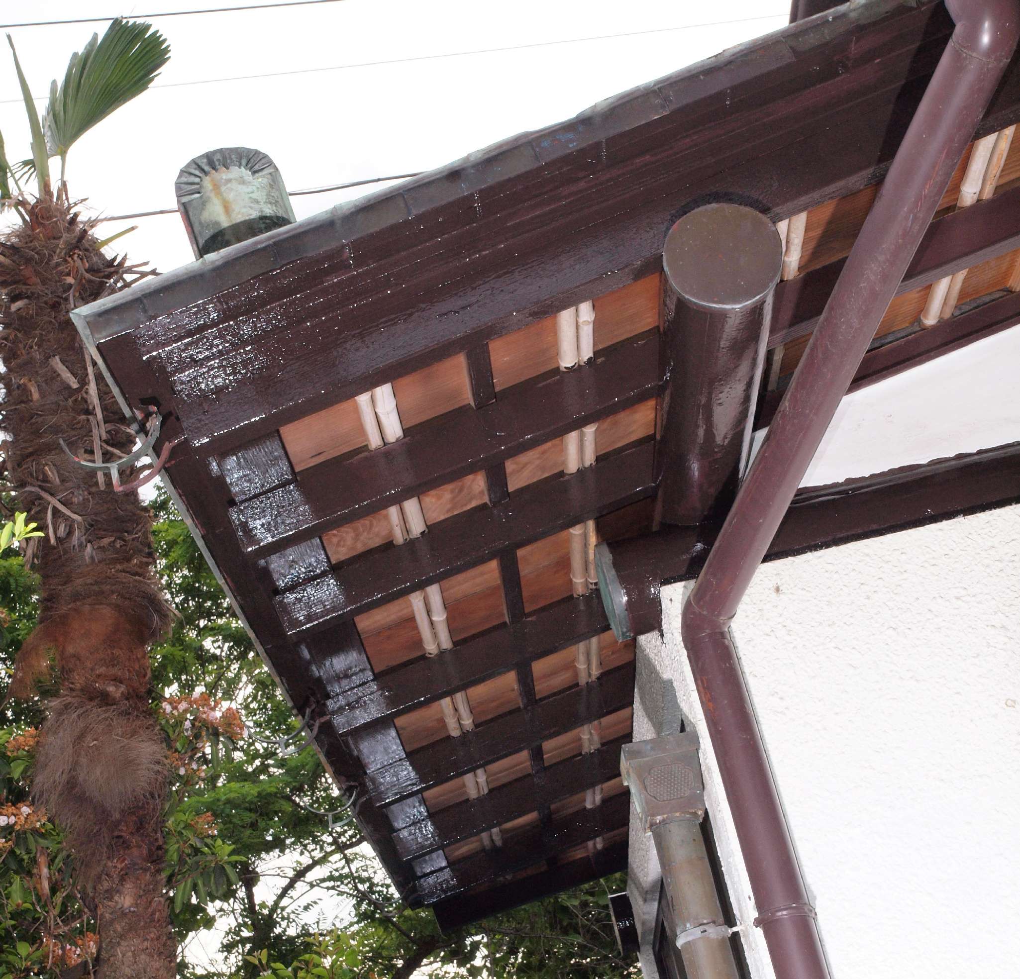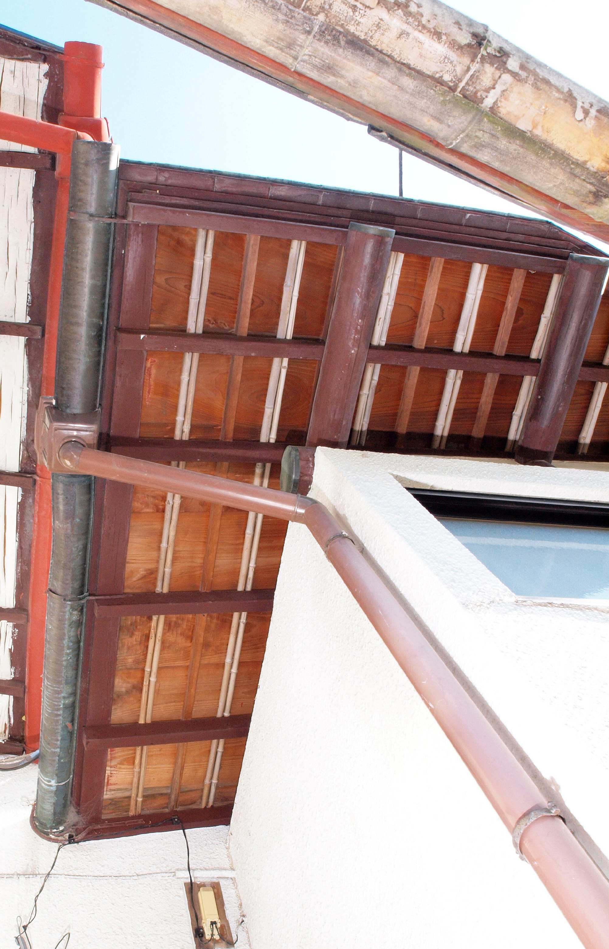42. 平成29年塗装中 南側軒天、東側から。 樋を外し塗装する。