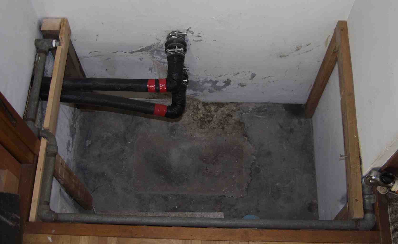 82.床張り工事。 ガス栓をとり、「メクラ」にする。床板を支える貫を造る。 下から十分支える事。