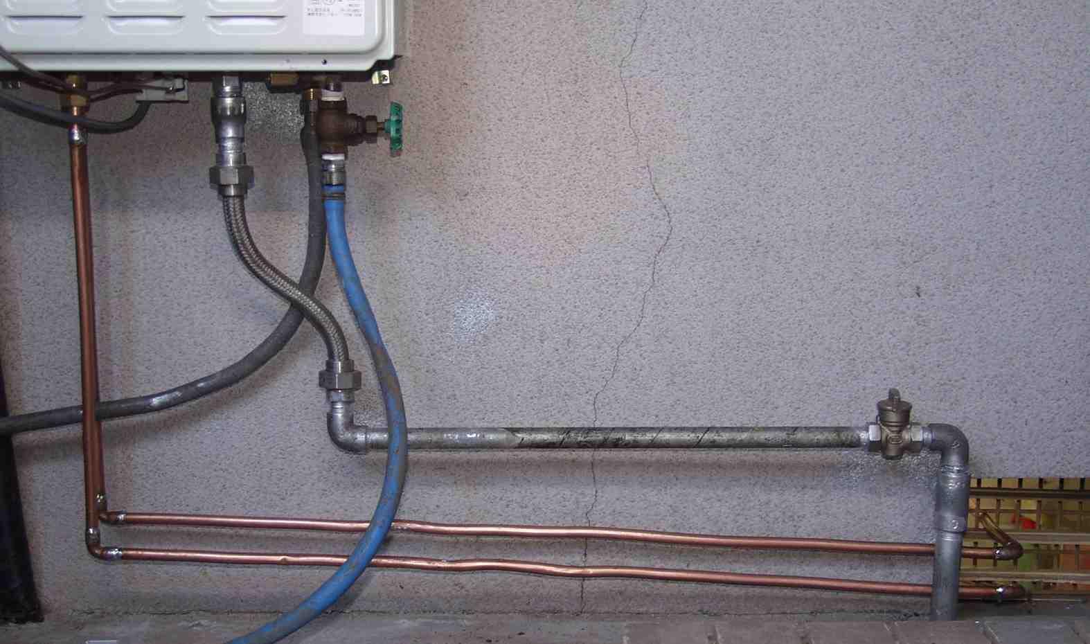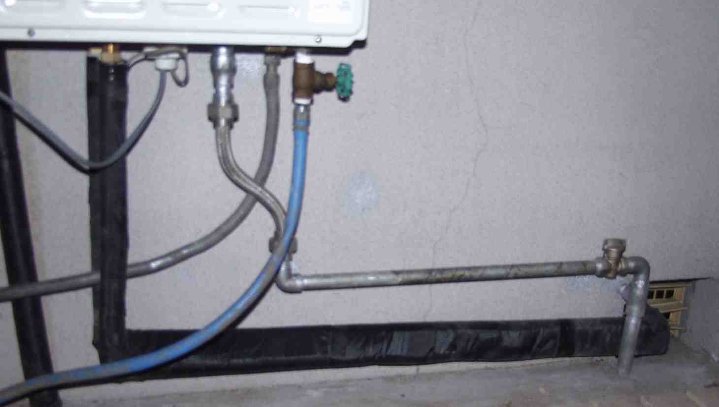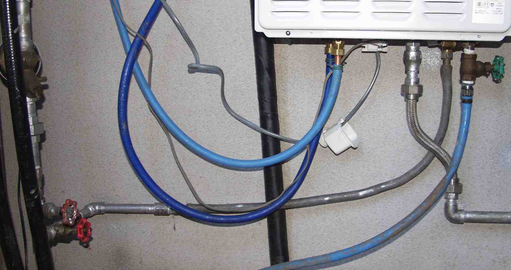 左配管=ガス 中配管=給水 右配管=温水出口=足し湯+追い炊きのみなので使用せず、バラブ止め