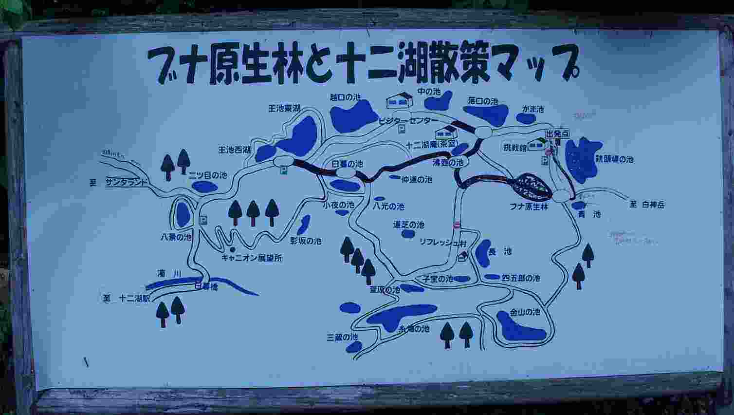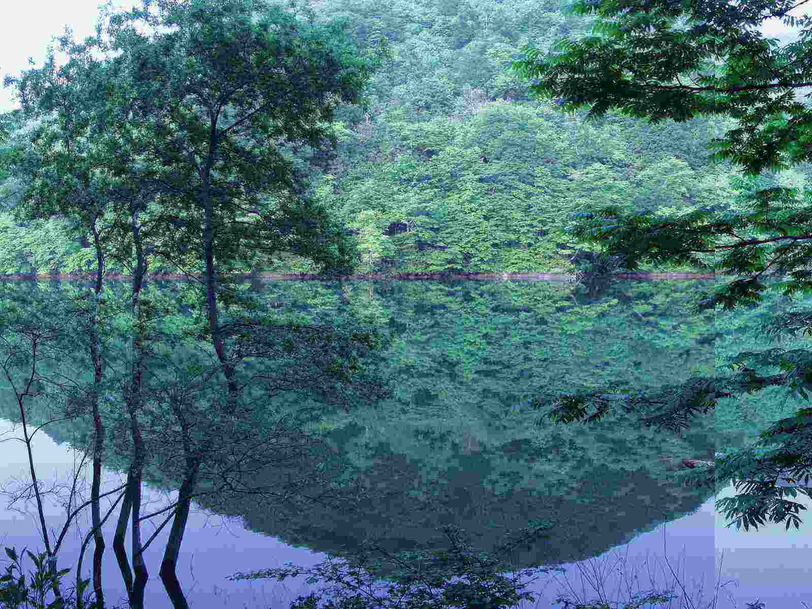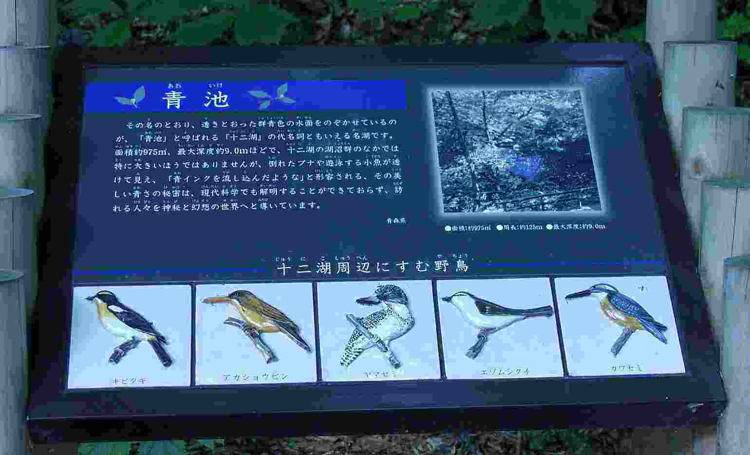 | 日本海沿岸に近い白神山地西方に大小33の湖沼の総称です。 十二湖の名前については、湖沼の中央東端にある大崩山から見ると12の湖が見える説と、面積が1平方キロメートル以上の湖沼が12ある説という、両説あります。 十二湖の誕生の原因については、宝永元年(1704)4月の大地震により大規模な山崩れが発生し、この堰止めにより湖が多数形成されたと言われています。 その他、氷河説、侵食盆地説、土砂崩れによる堰止湖説などがあります。 いずれにしろ、過去の大地震に関連した崩壊現象と断層という地質構造、崩れやすい構成岩石の組み合わせによってできた大規模な地すべり地形ではないかと考えられています。 十二湖最初の湖、八景の池です。つづいて王池、日暮の池、越口の池、中の池、落口の池、鶏頭場の池、青池などが姿をあらわします。いずれもうっそうと茂るブナ、ミズナラなどの広葉樹の深い原生林に囲まれて、波静かな湖です。 |