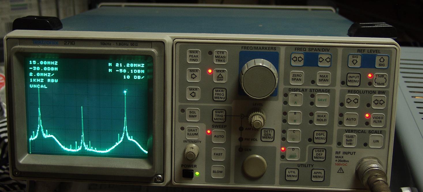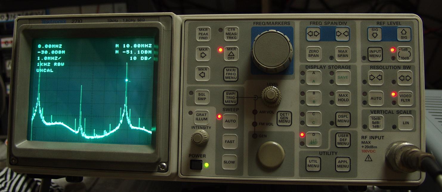 | 6−1. スペアナによる測定 3.5MHZ20W出力 左=基本波 真ん中=2倍高調波 右=3倍高調波 |