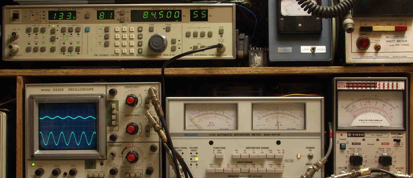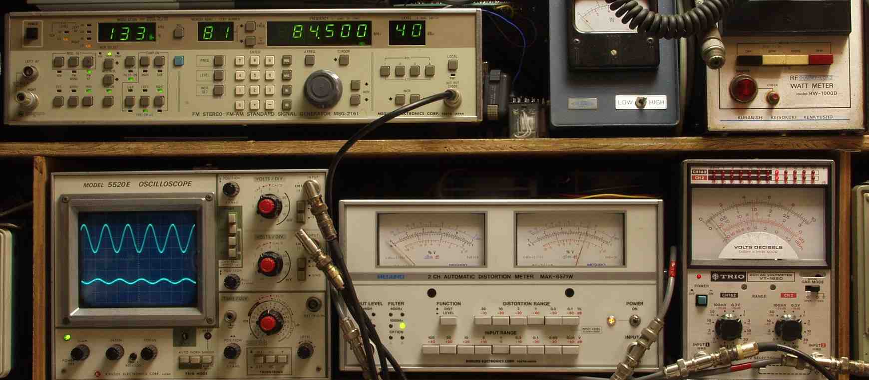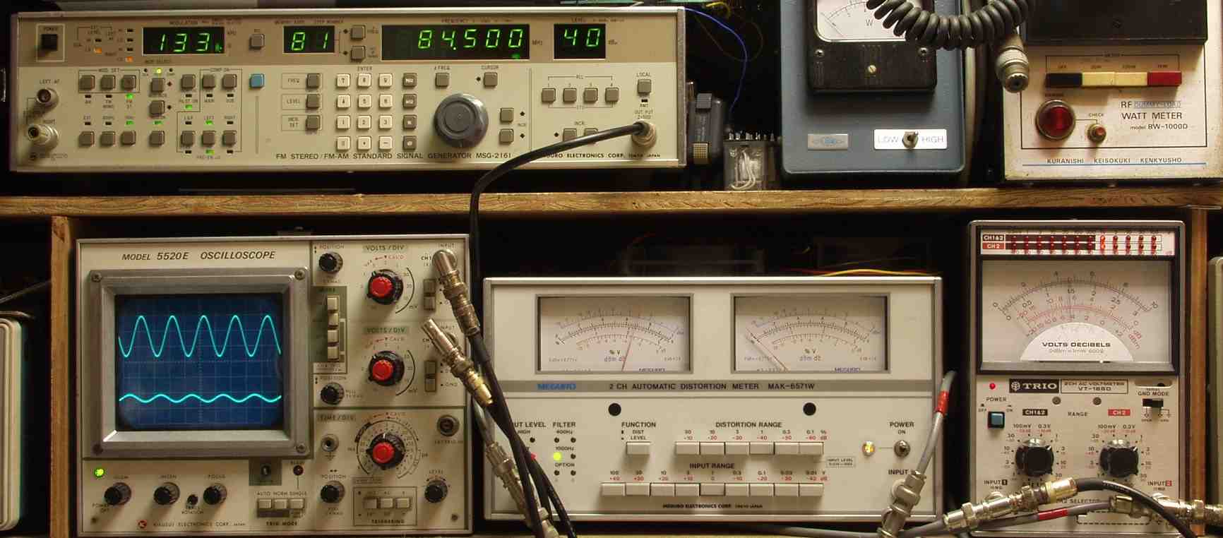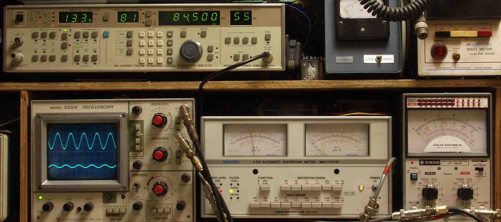 | E2A. FM 感度、RL分離測定調整 R側 見方 上のFMステレオ信号発信器より 84.5MHZで 1KHZの Rのみ変調信号を 40dBで出す これを受信し出力を測定する、 下中=歪み率計=0.8%、左メータ=L出力、右メータ=R出力(最大1%レンジ) 下右=電圧測定器、赤針=R出力=0.45V、黒針=L出力(最大1Vレンジ) 下左=出力波形 上=R出力、下=L出力。 |