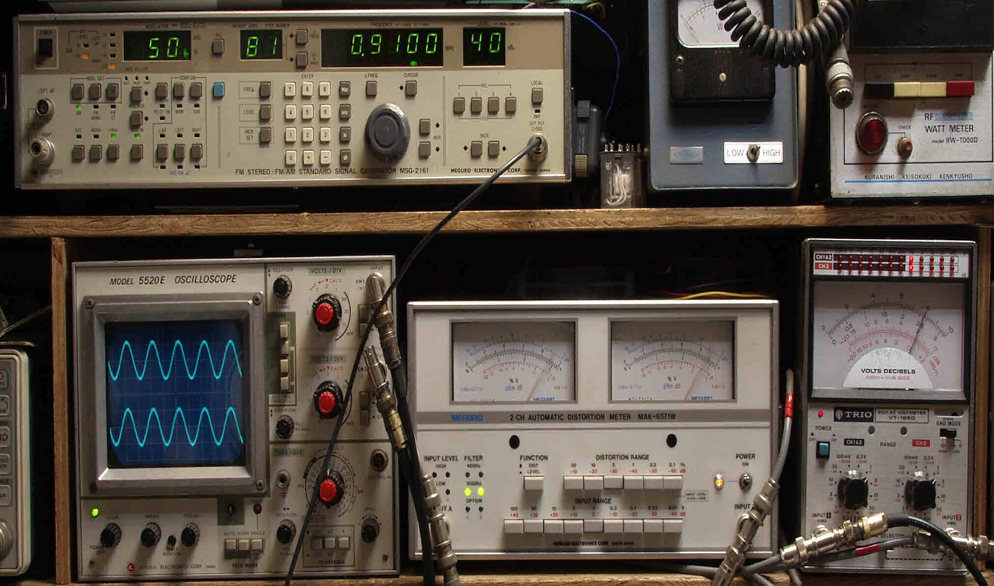 | E4B. AM 感度測定調整 見方 上のAM信号発信器より 910KHZで 1KHZの 50%変調信号を 55dBで出す これを受信し出力を測定する、 下中=歪み率計=1%、左メータ=L出力、右メータ=R出力(最大1%レンジ) 下右=電圧測定器、赤針=R出力=1V、黒針=L出力(最大1Vレンジ) 下左=出力波形 上=R出力、下=L出力。 |