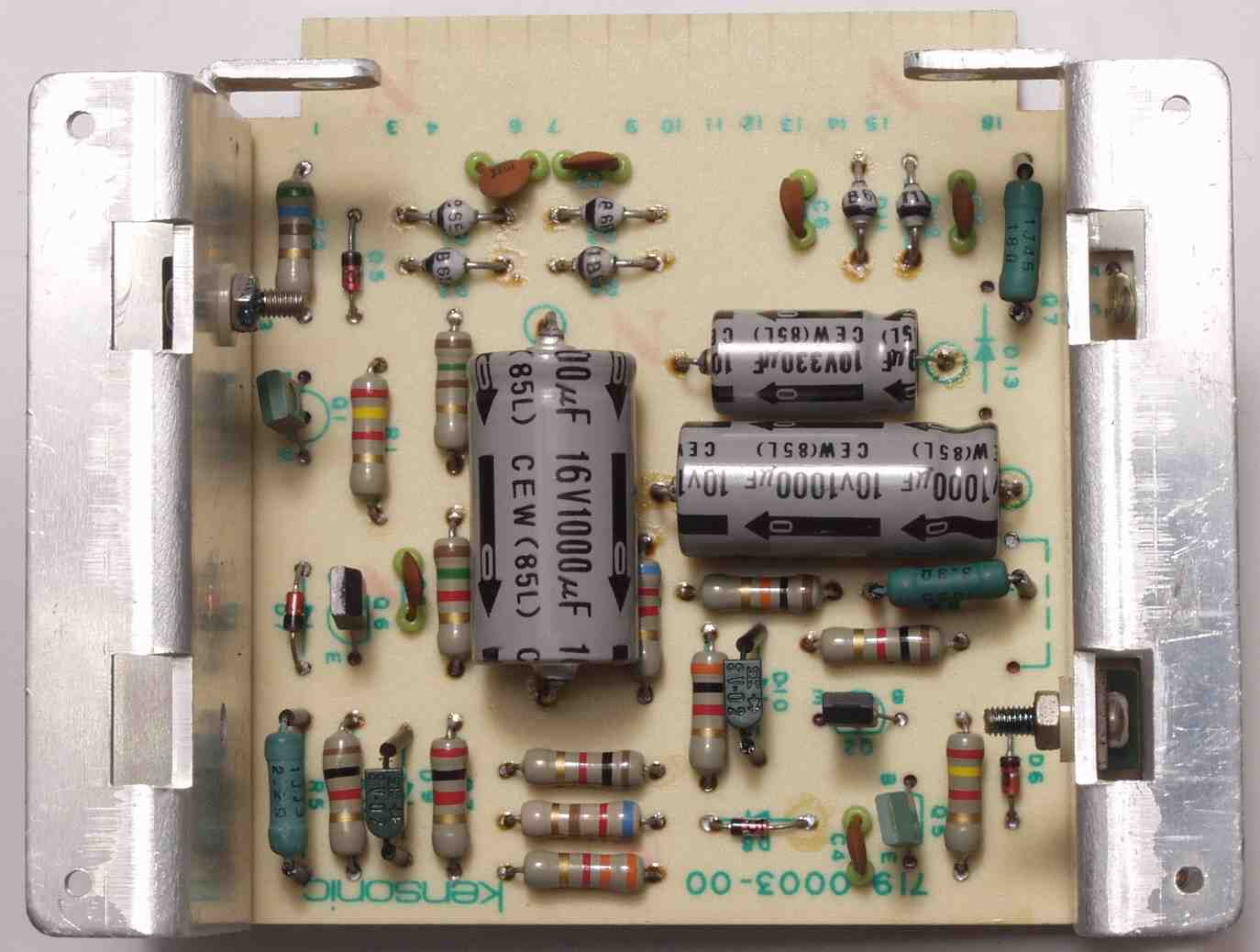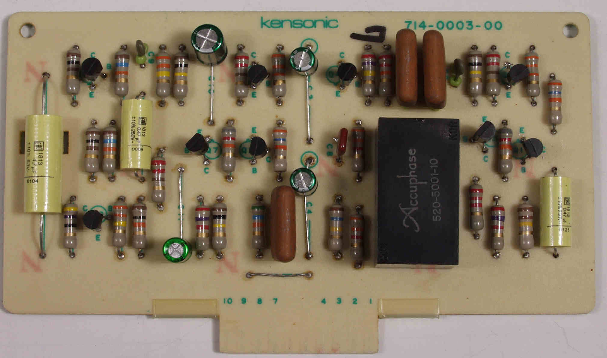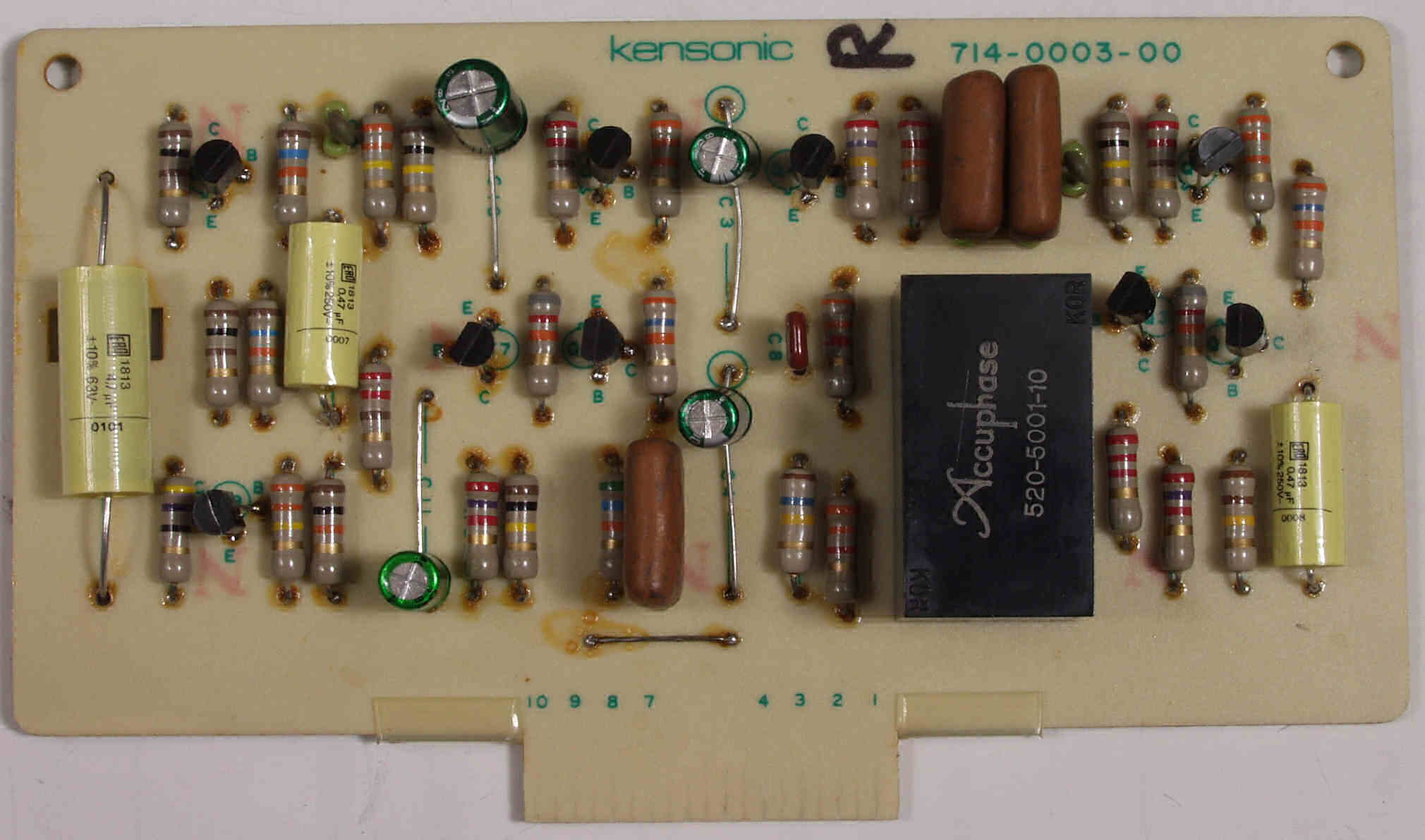| C72. 修理後 R出力AMP基板 電解コンデンサー4個、フイルムコンデンサー4個、TR(トランジスタ−)9個交換 |