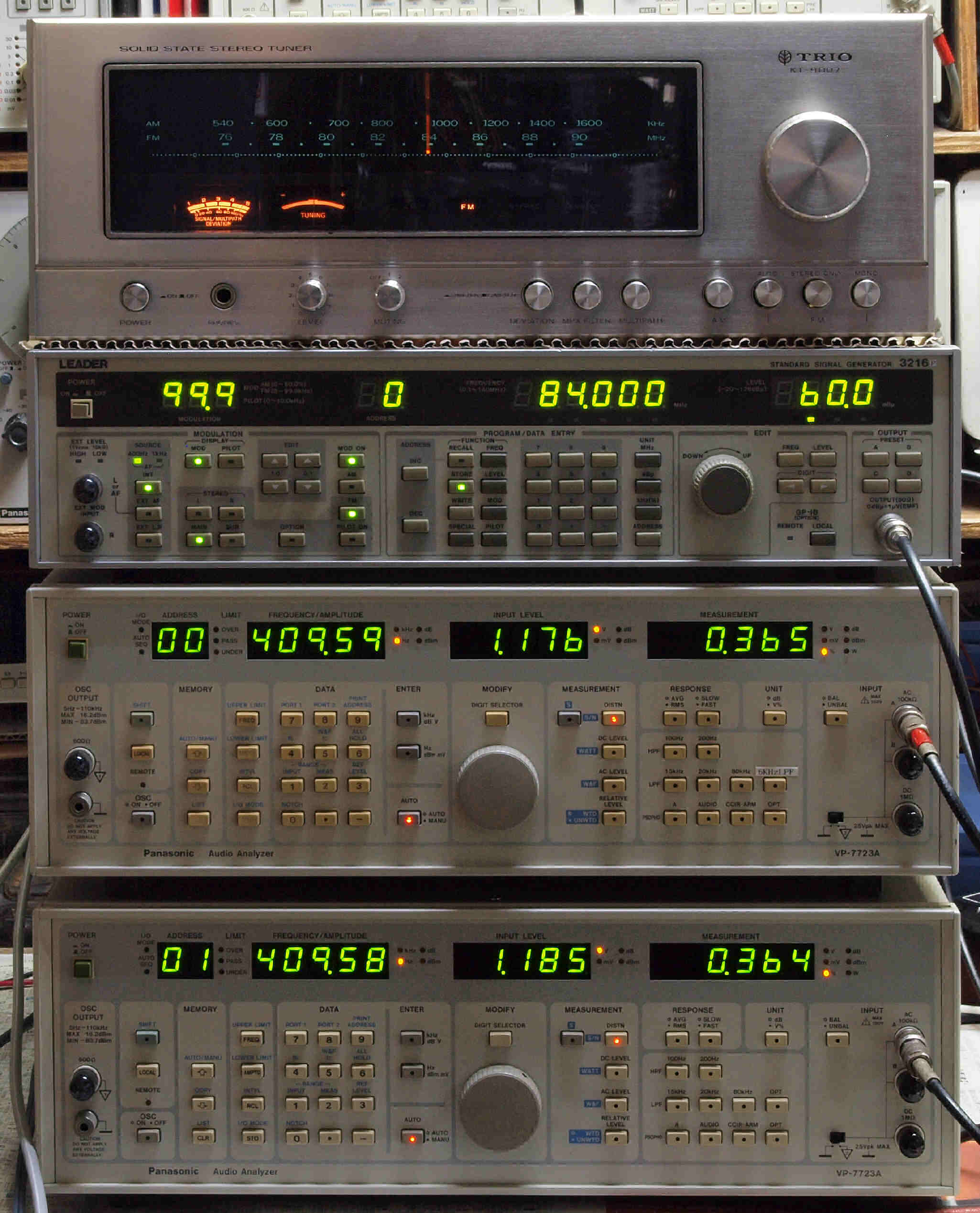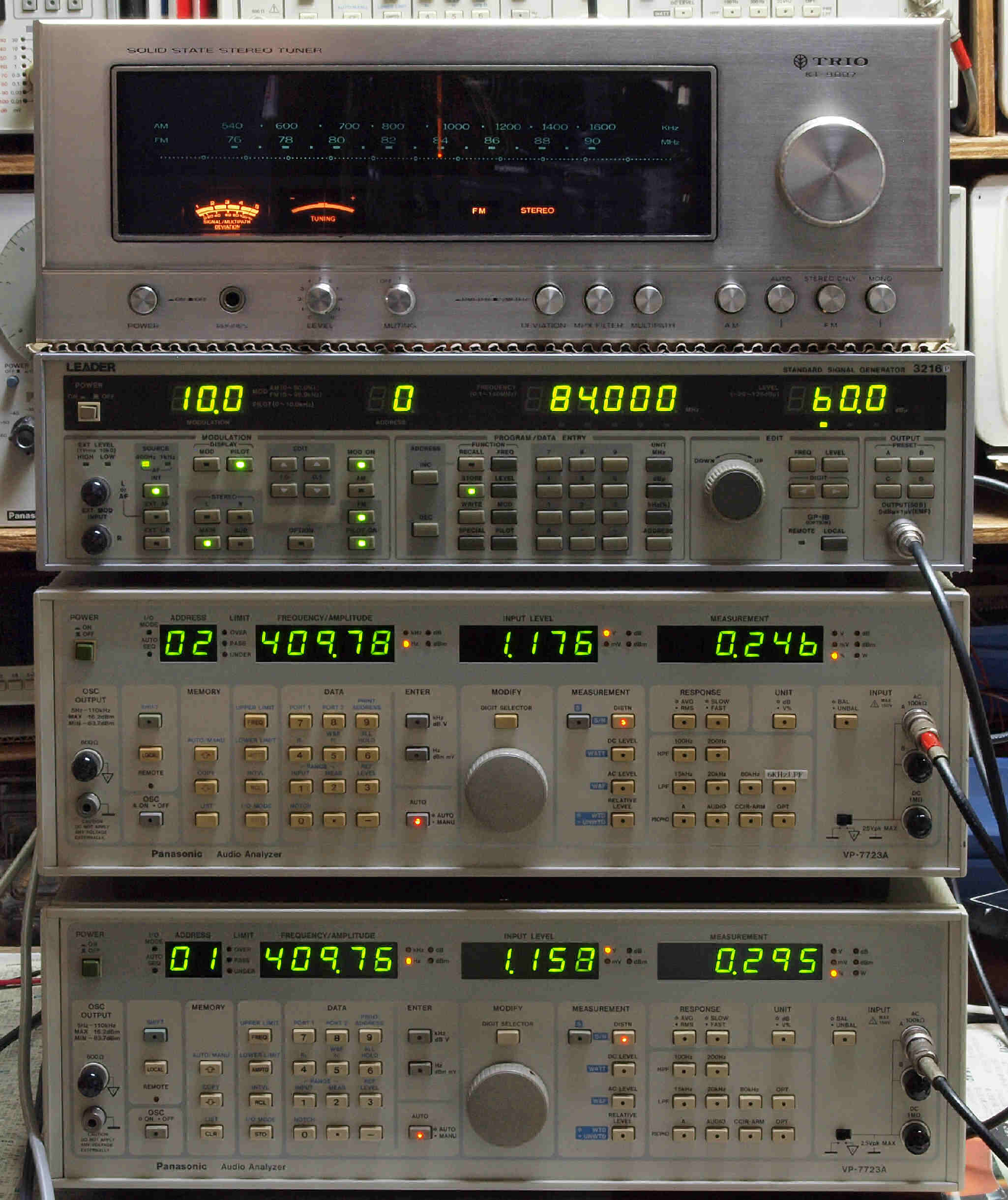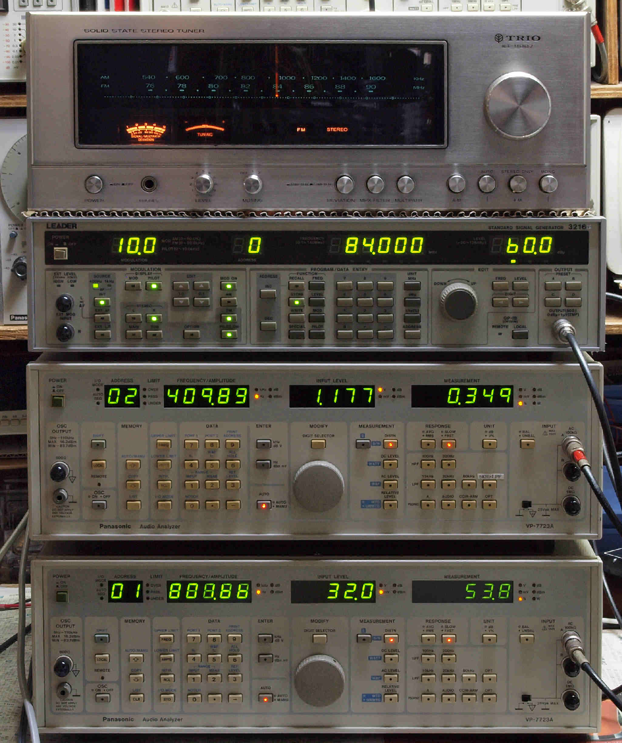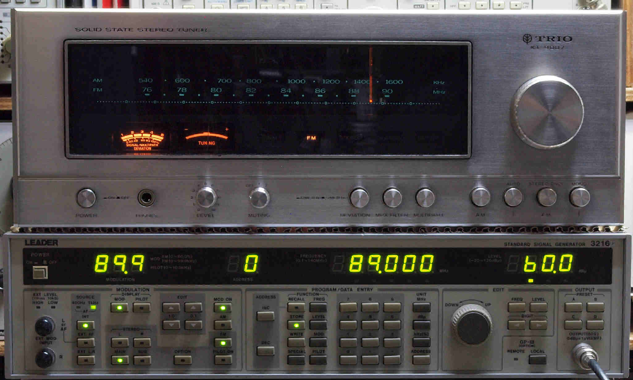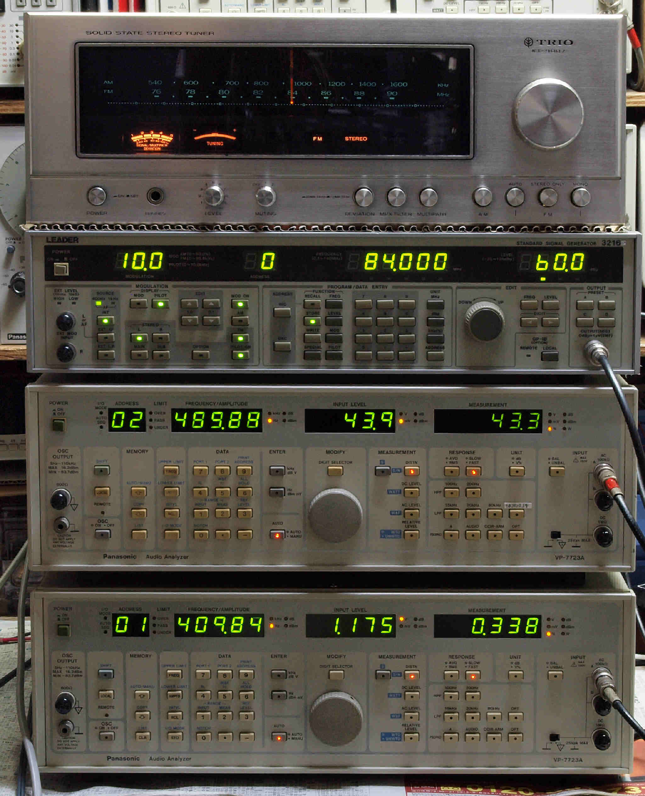 中上の「LEADER 3216P FM ステレオ信号発信器」より信号を出す。 これを受信し出力を測定する。