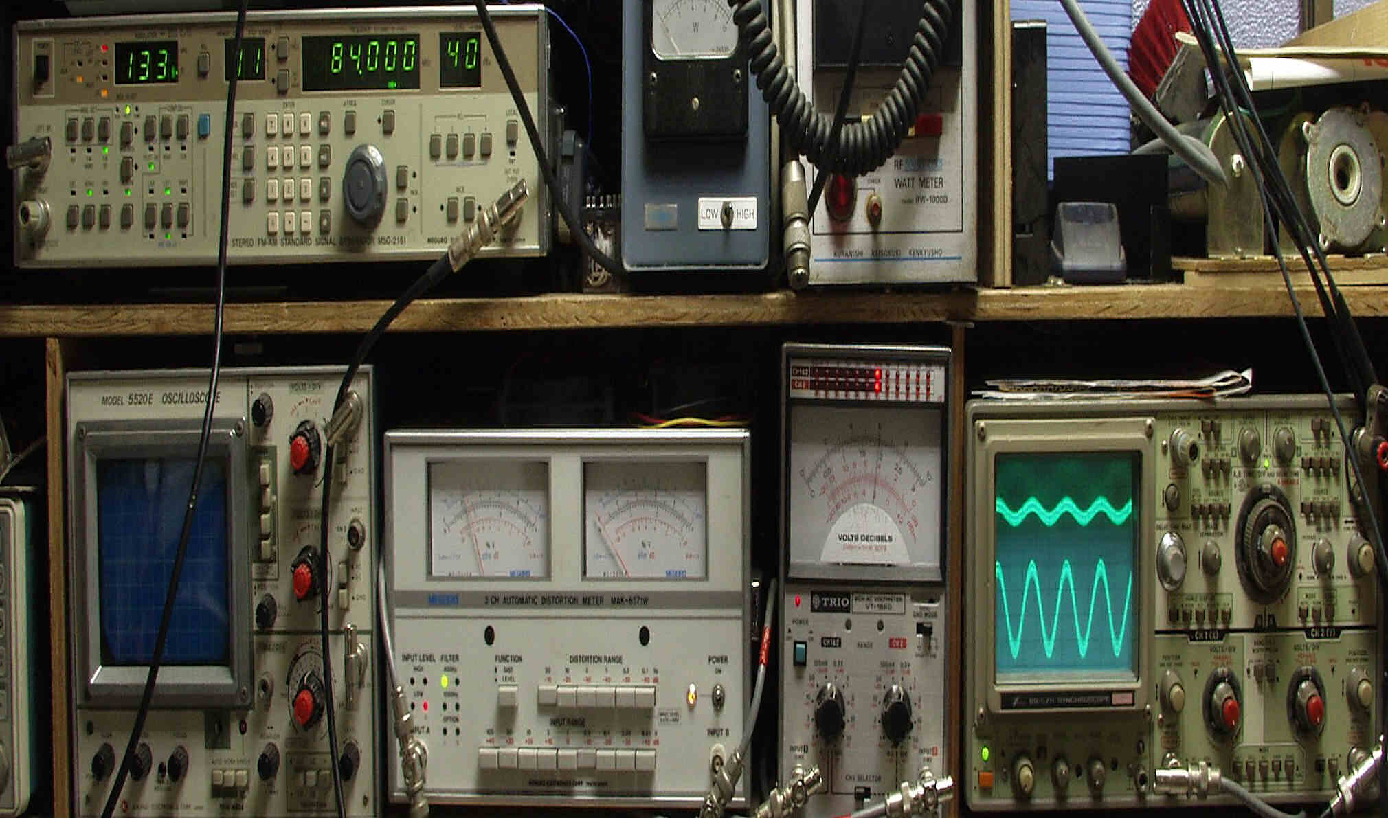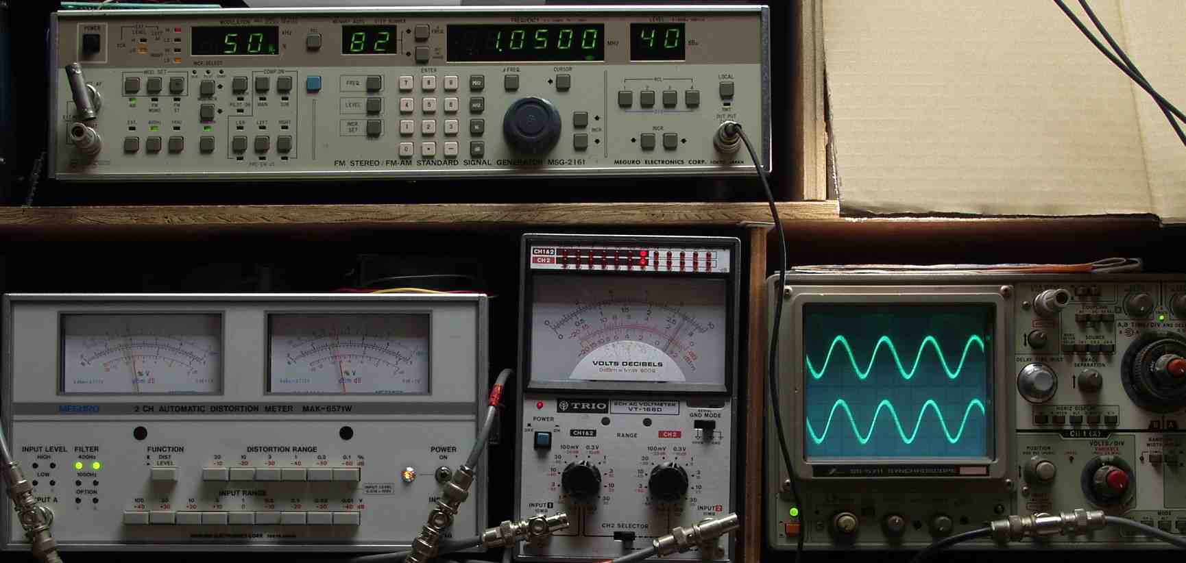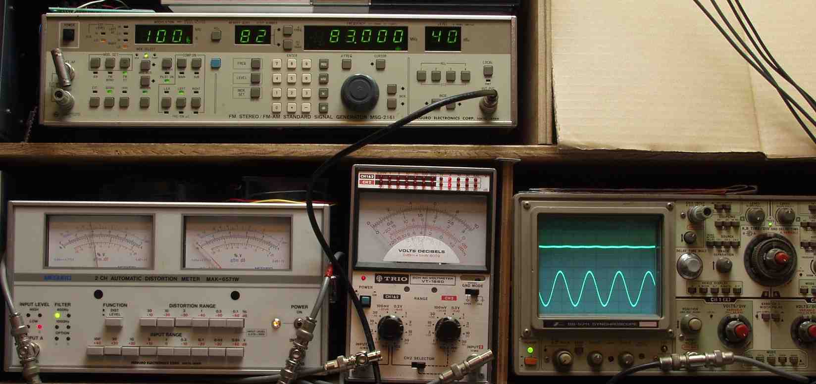 下左側の歪み率計=4%、左メータ=L出力、右メータ=R出力(最大10%レンジ)