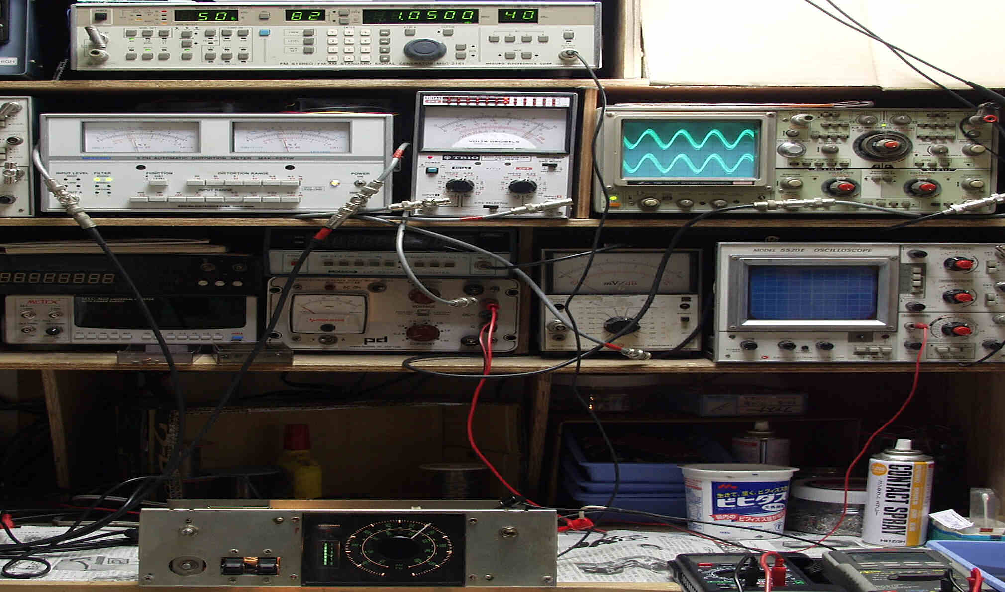 真ん中電圧測定器、赤針=R出力、黒針=L出力(最大0.3Vレンジ)
