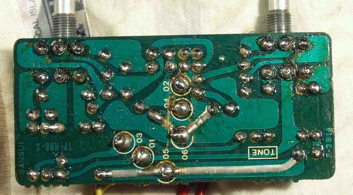 C−5F. 修理(半田補正)後 プリメインRCA端子裏 太いケーブルを付けるのでRCA端子は十分に半田盛る