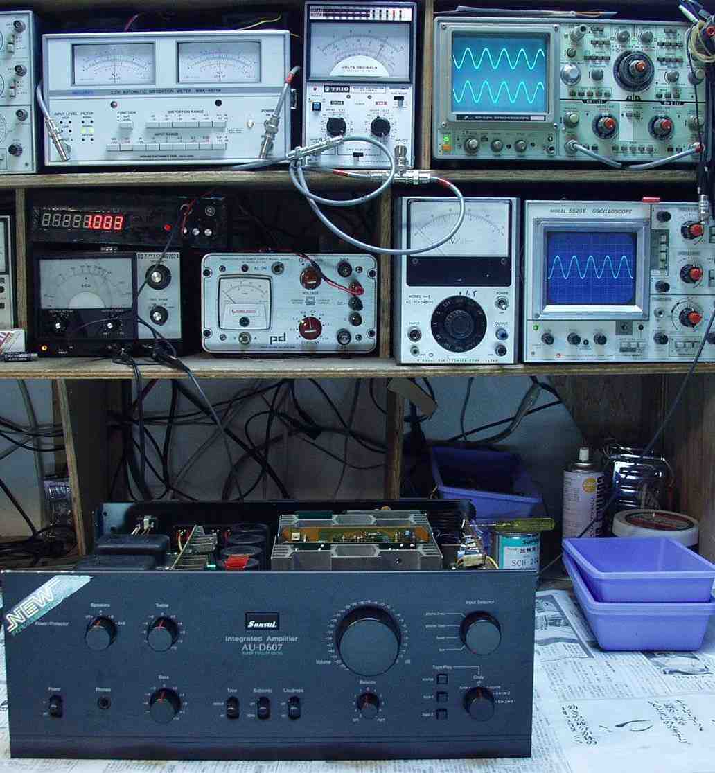 E−2A. 出力/歪み率測定・調整  出力=25V=78W 歪み率0.05% at=1000HZ AUX端子入力
