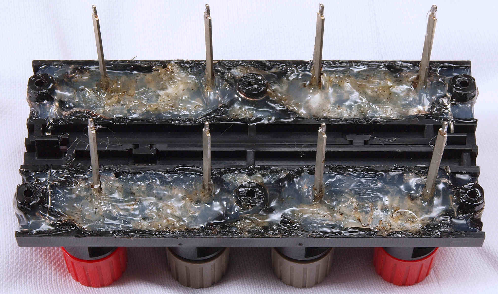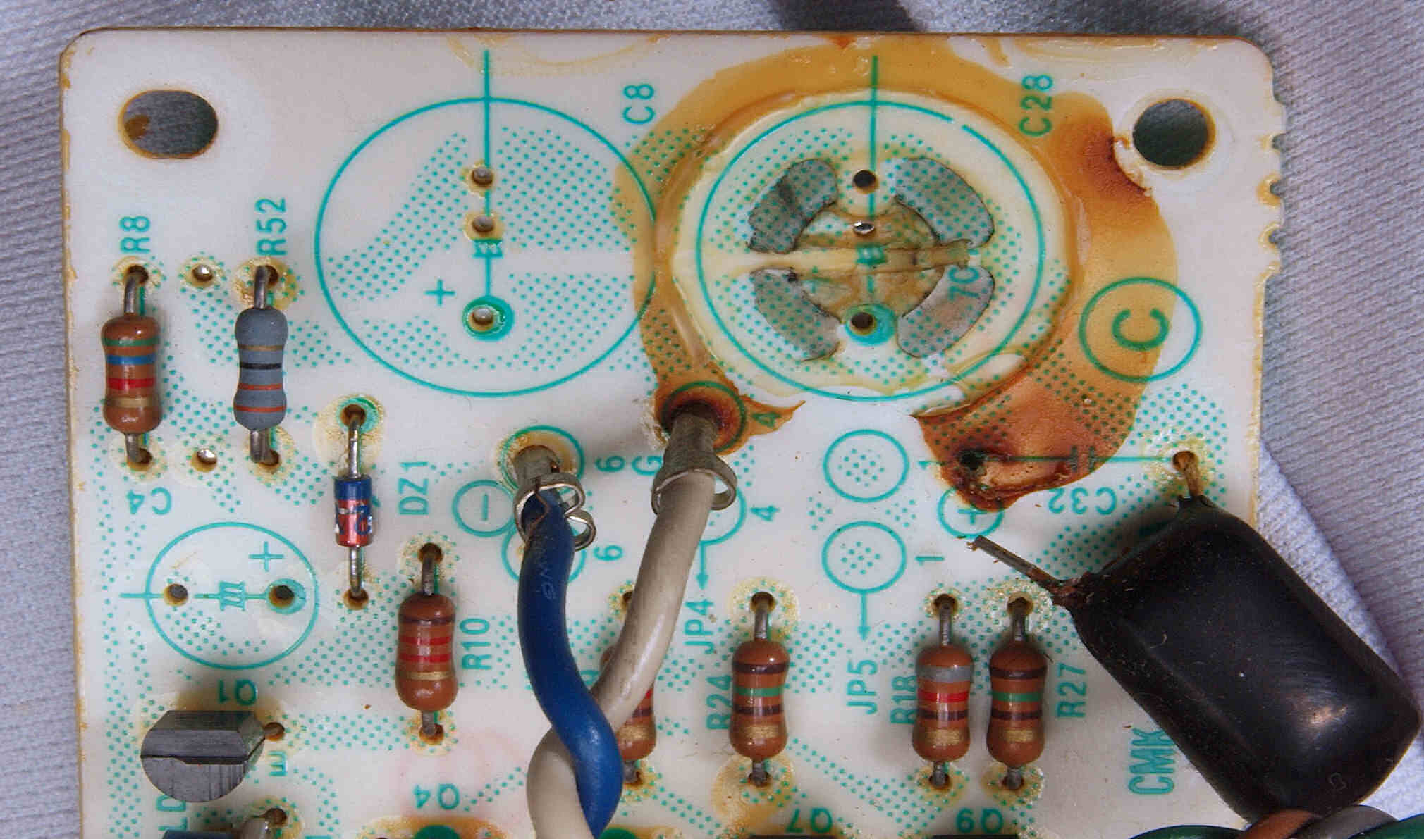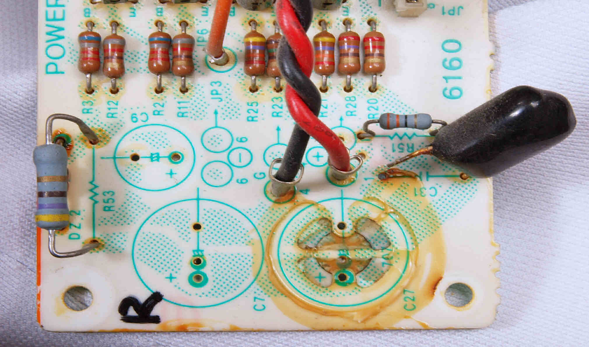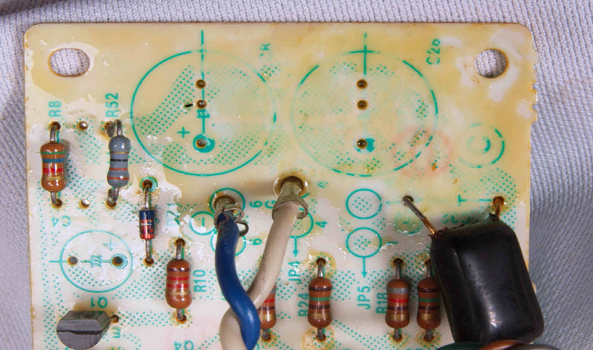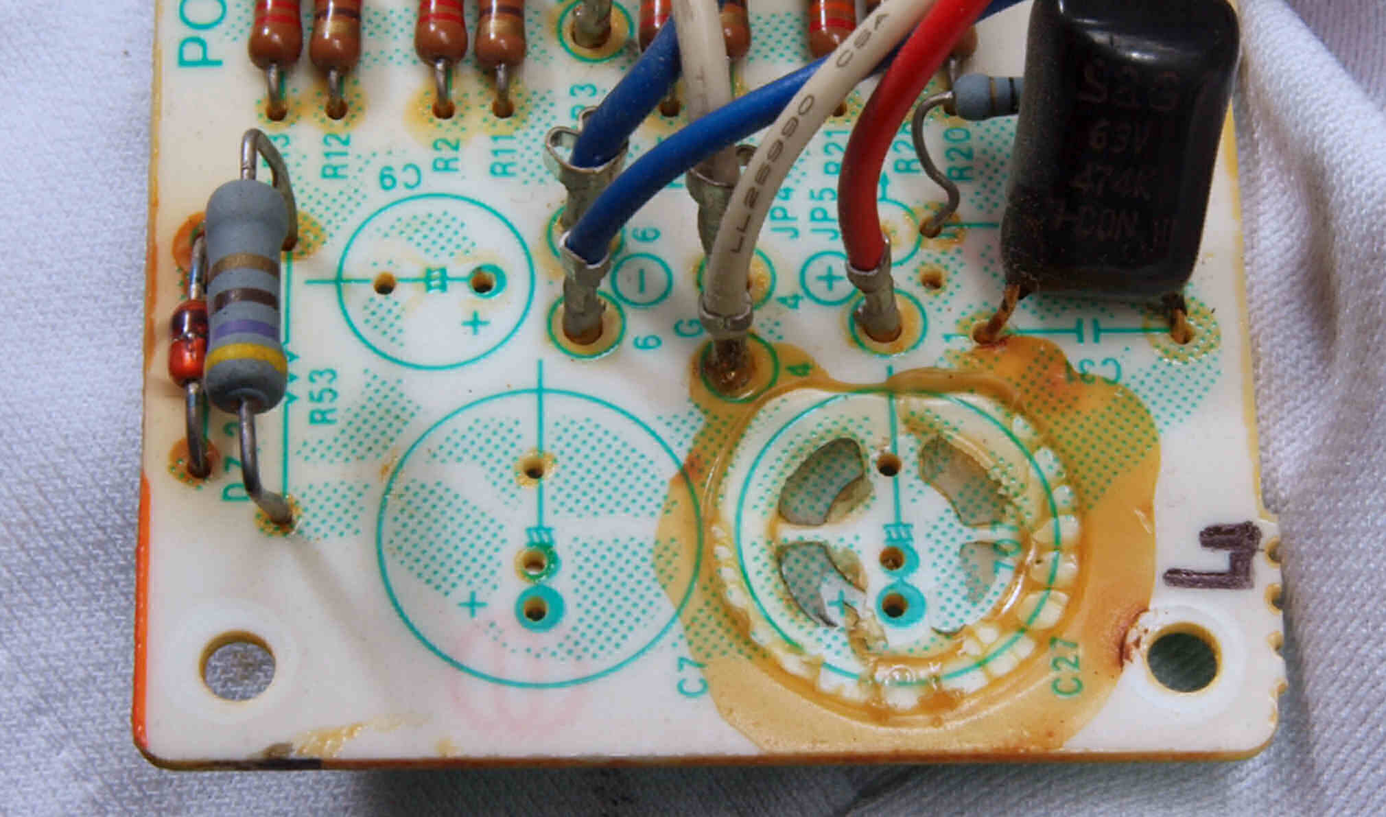 C264. 修理前 R側・ドライブAMP基板、電解コンデンサー固定用の接着材、当時は溶媒にトルエンが使用されており、銅を腐食する。