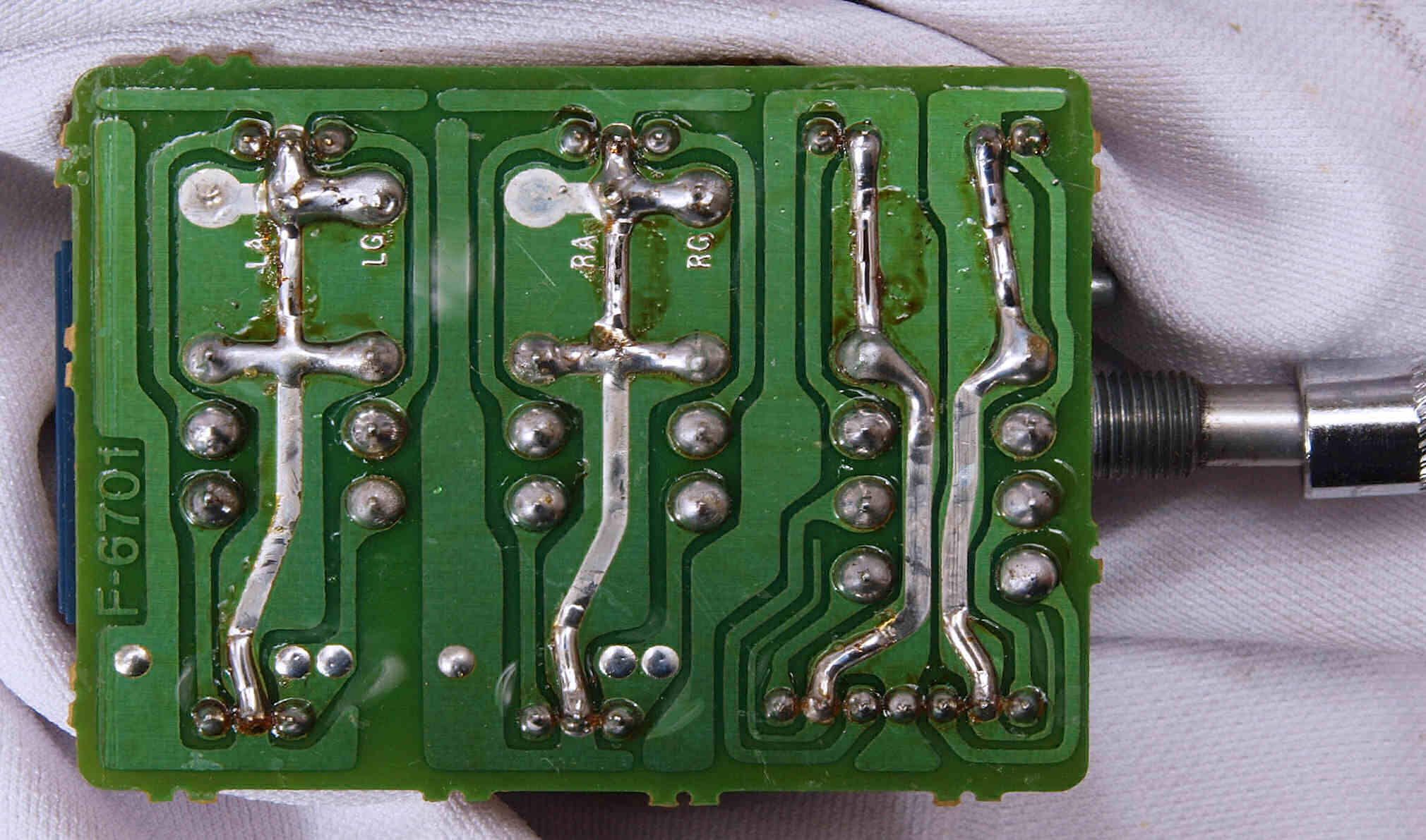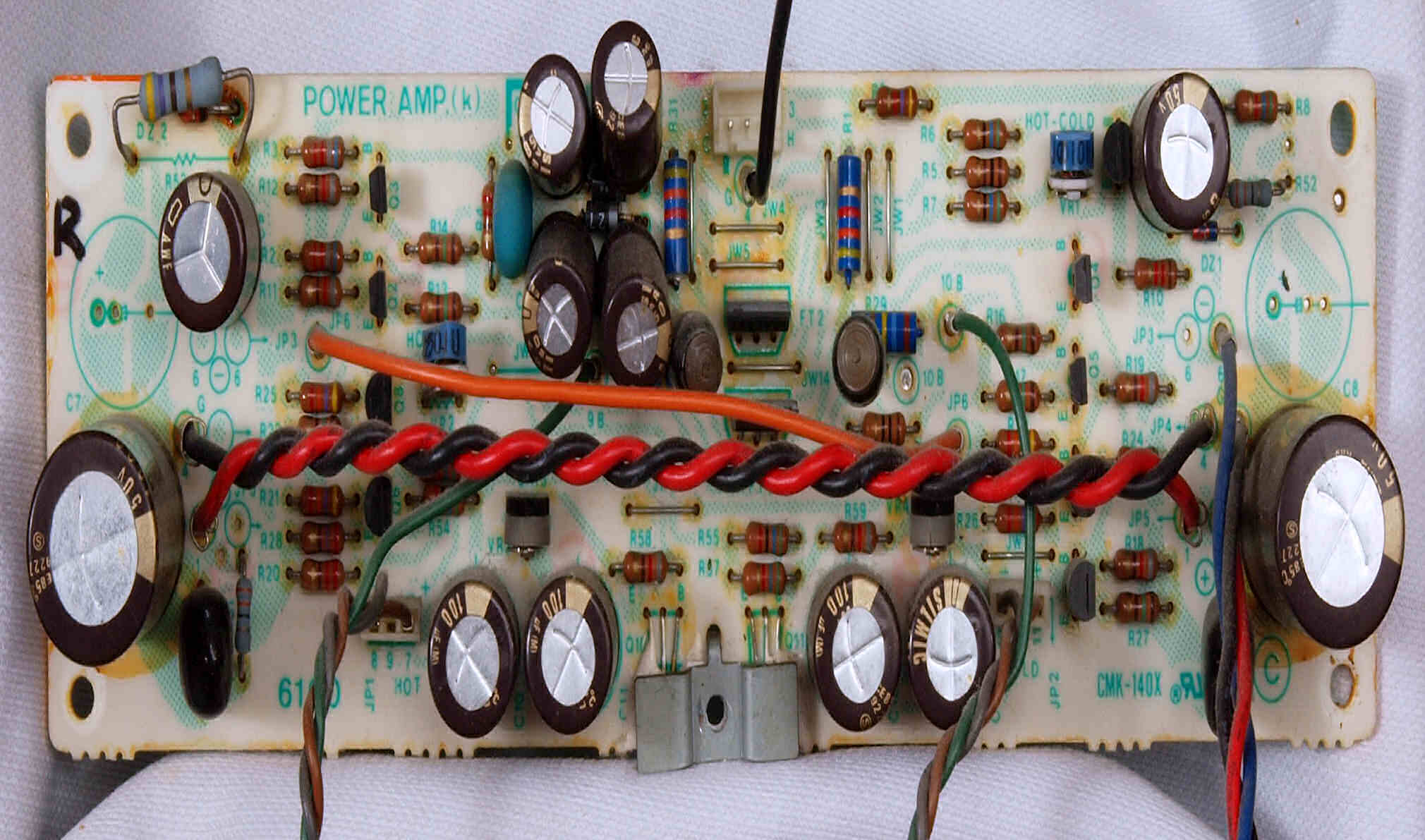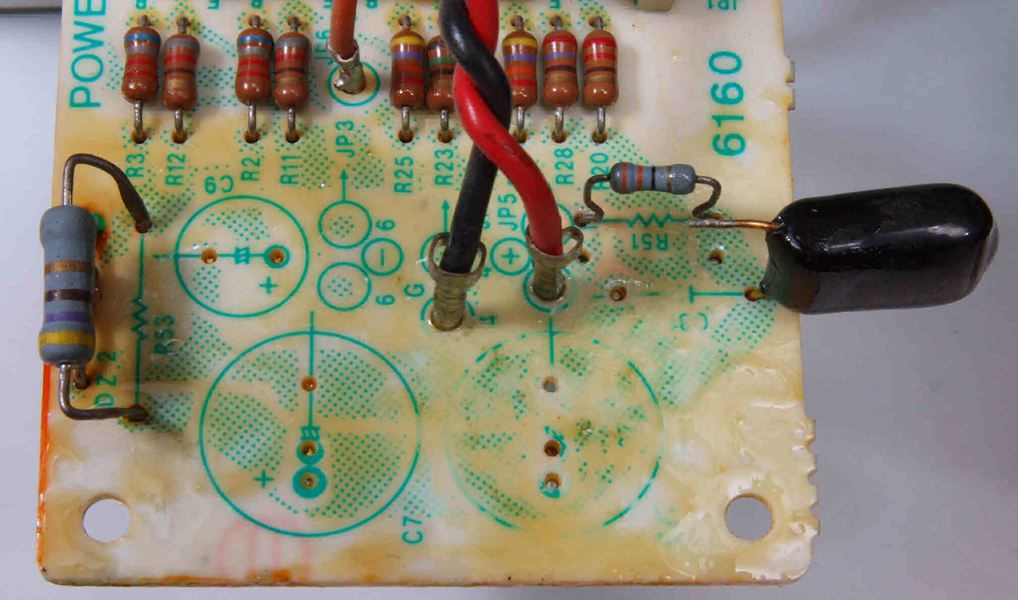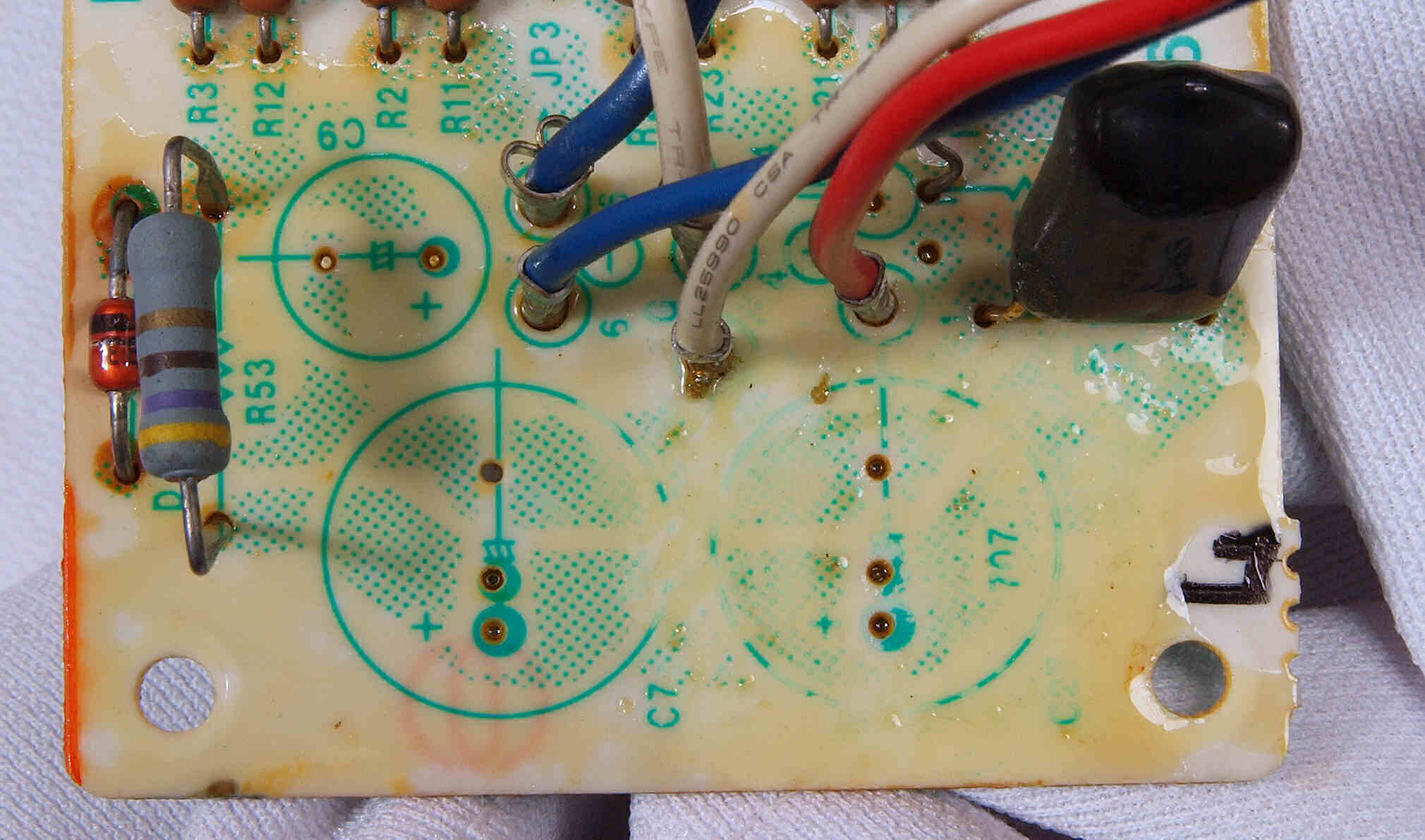 C262. 修理前 R側・ドライブAMP基板、電解コンデンサー固定用の接着材、当時は溶媒にトルエンが使用されており、銅を腐食する。