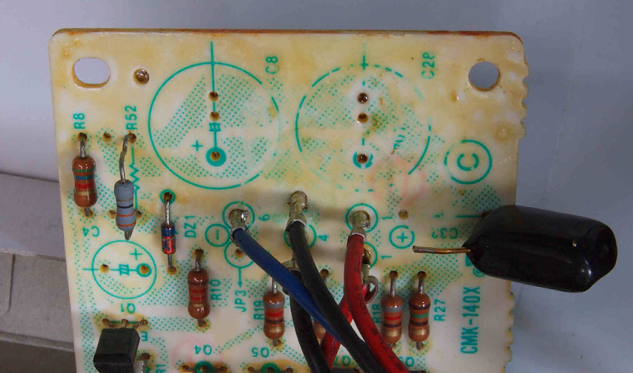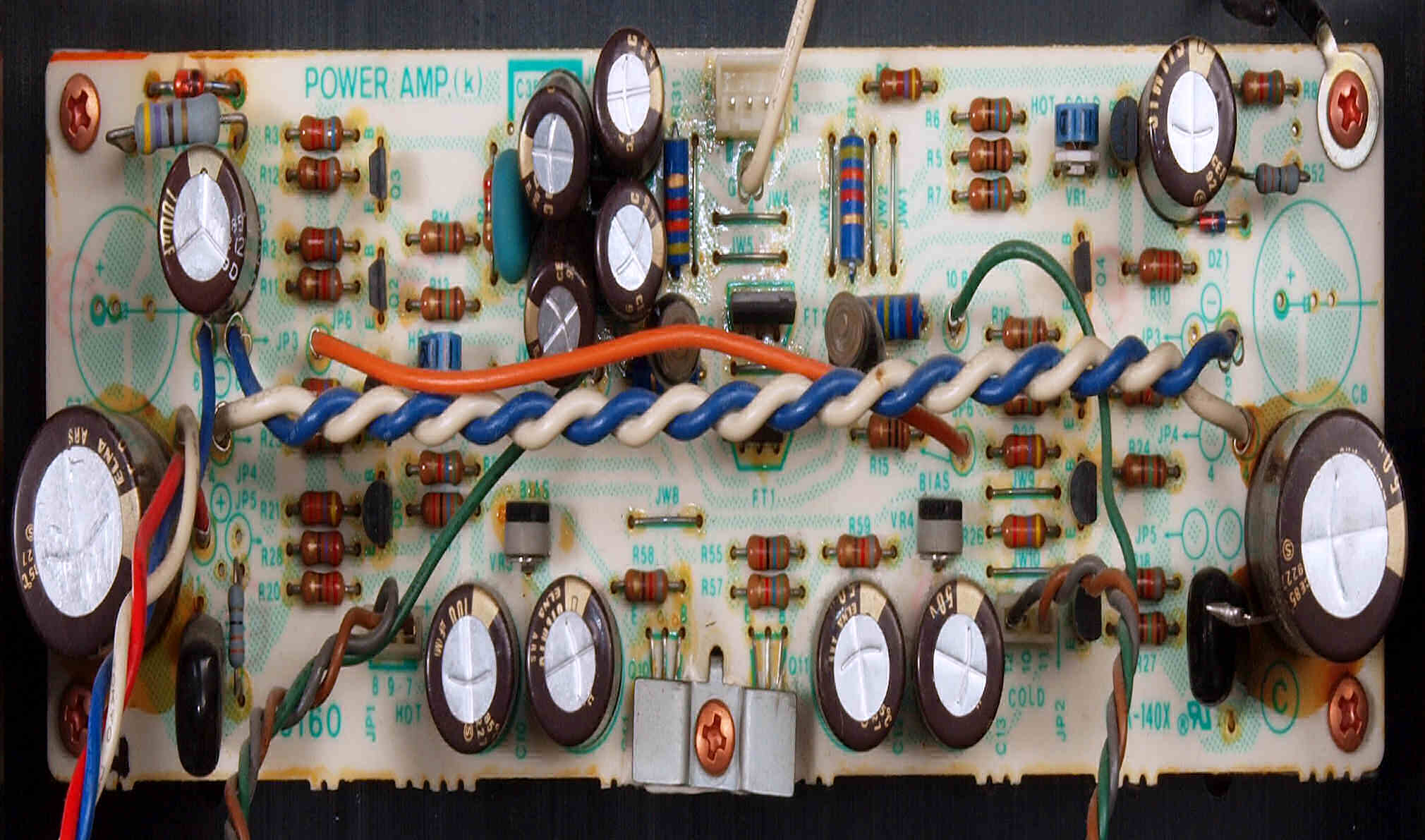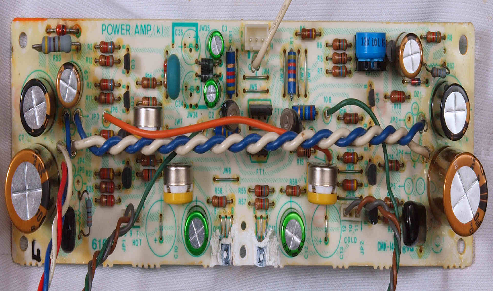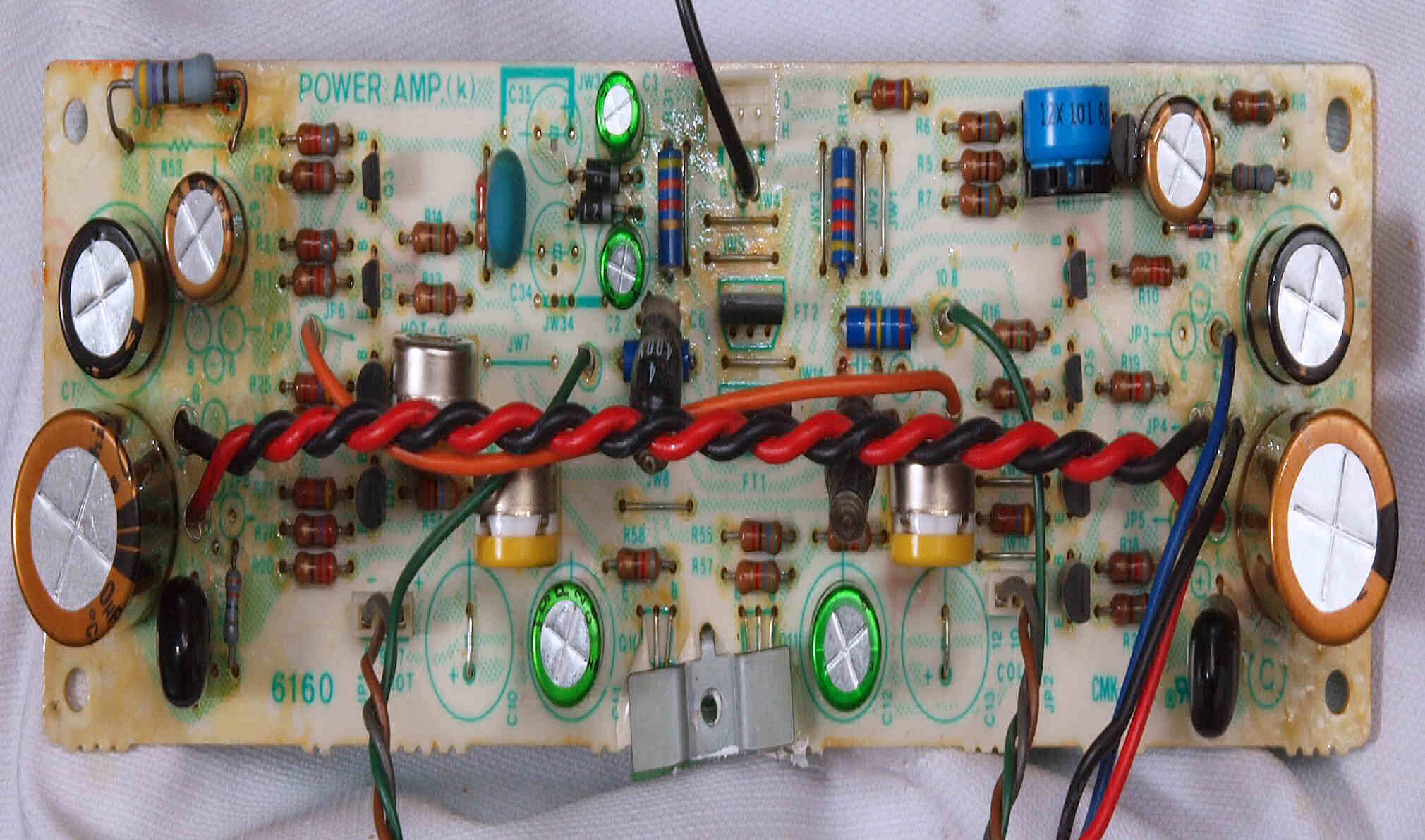 C262. 修理前 R側・ドライブAMP基板、電解コンデンサー固定用の接着材、当時は溶媒にトルエンが使用されており、銅を腐食する。