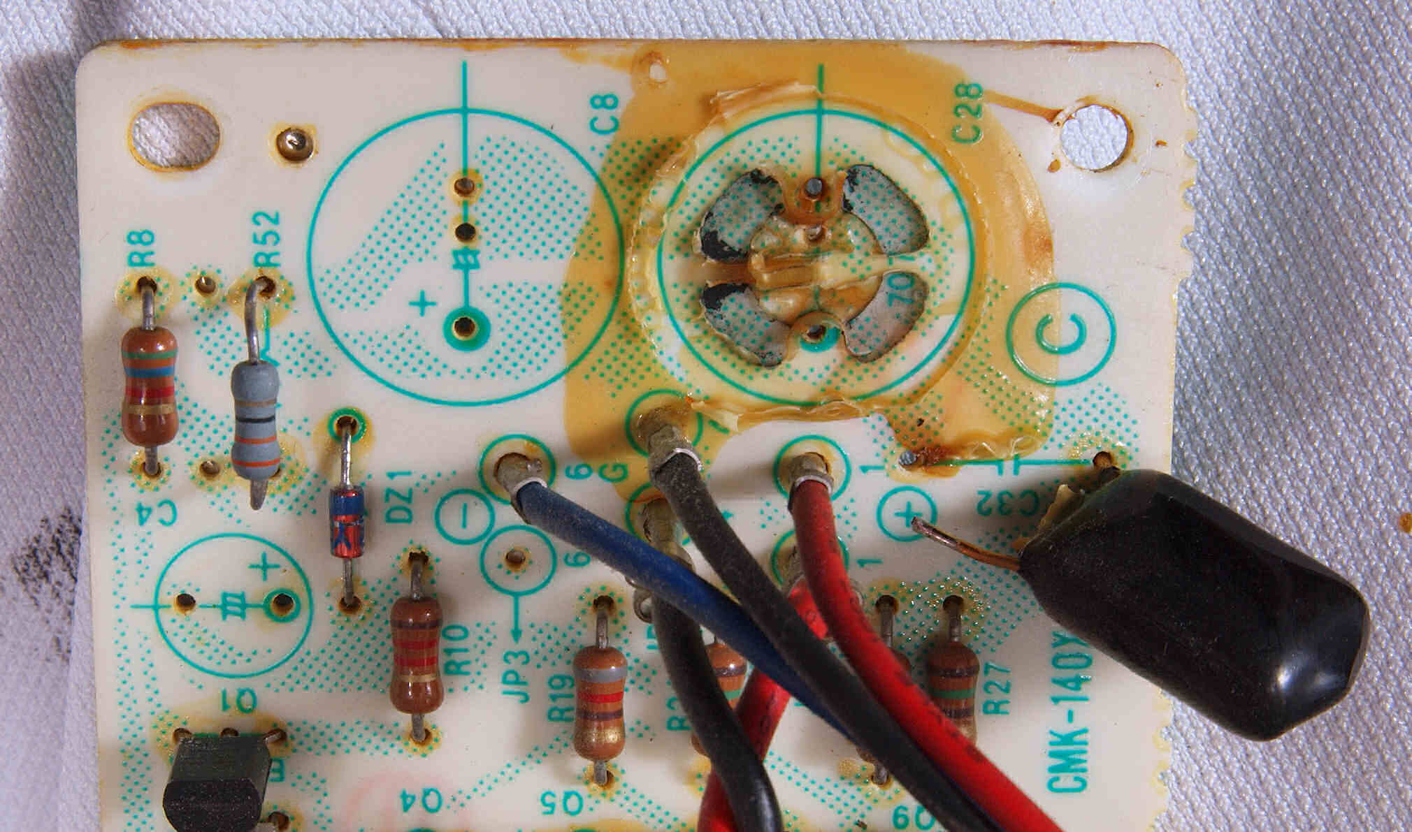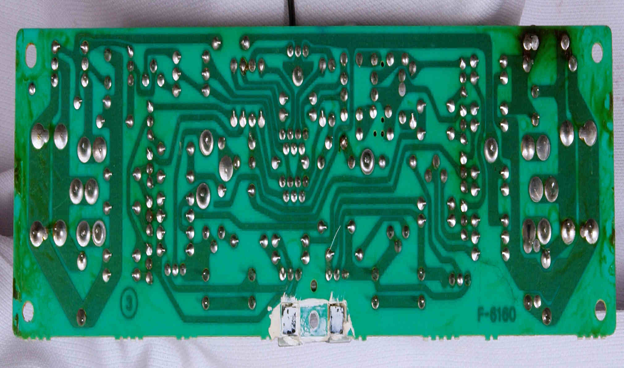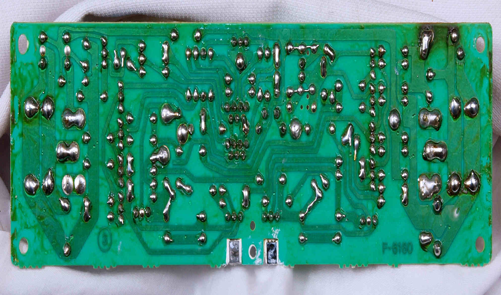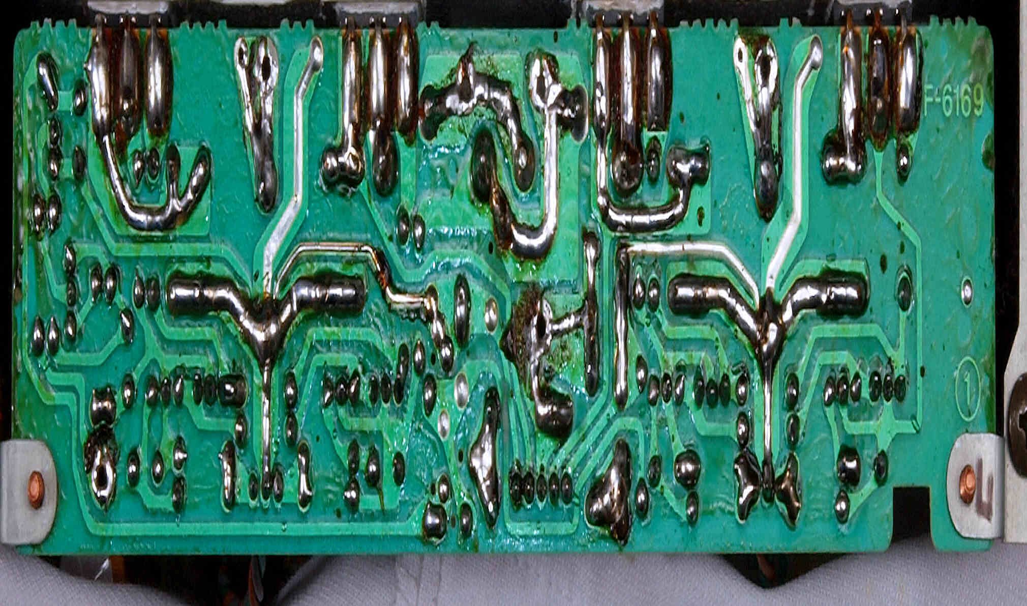C362. 修理前 L側・ドライブAMP基板、電解コンデンサー固定用の接着材、当時は溶媒にトルエンが使用されており、銅を腐食する。