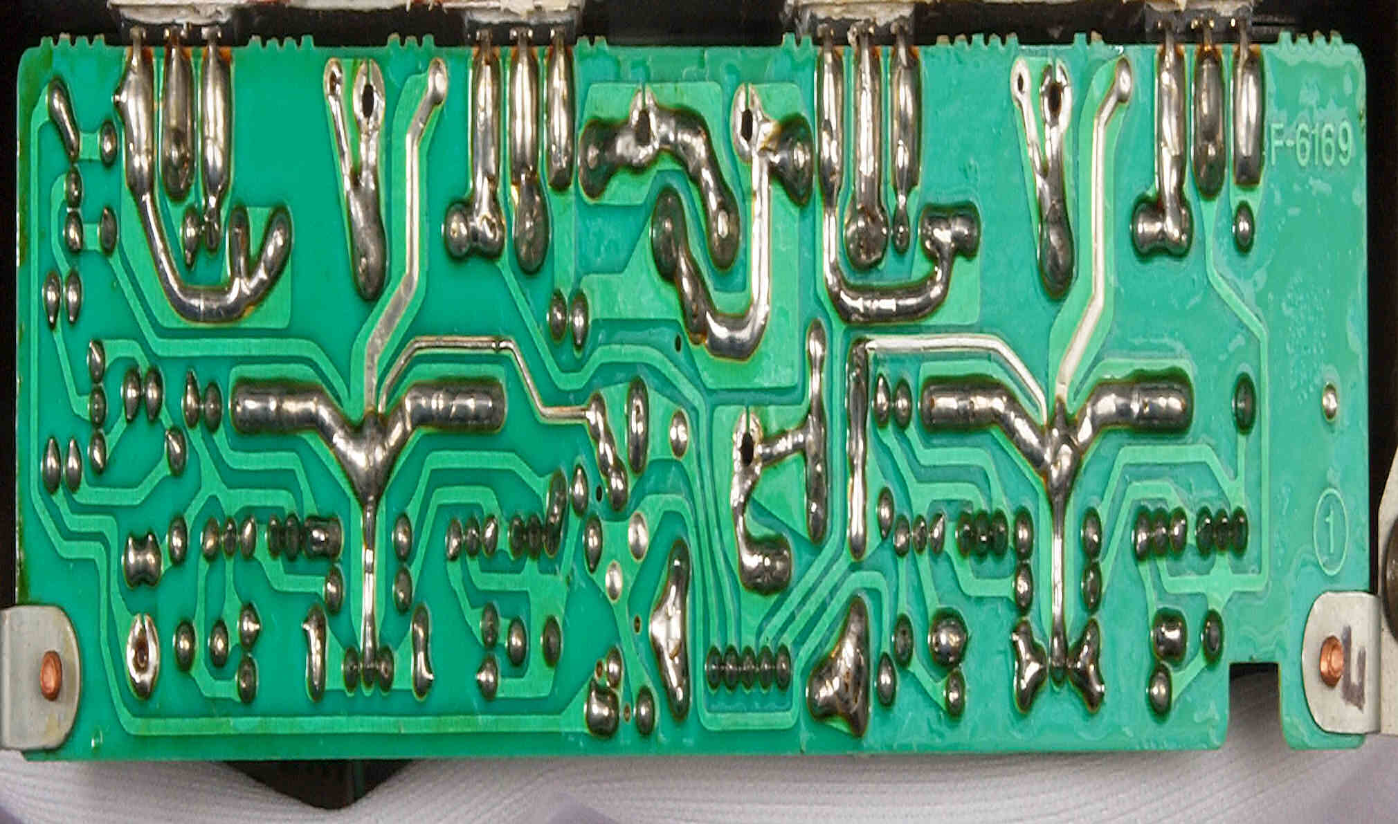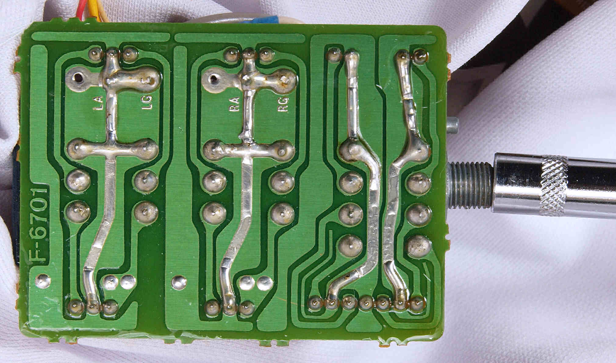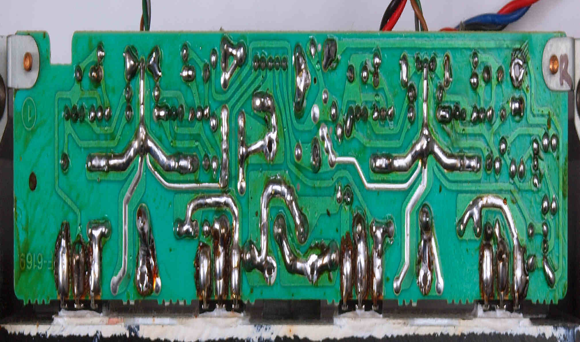 C34. 修理(半田補正)後 L側・ドライブ終段TR(トランジスター)基板裏、 全半田やり直し。