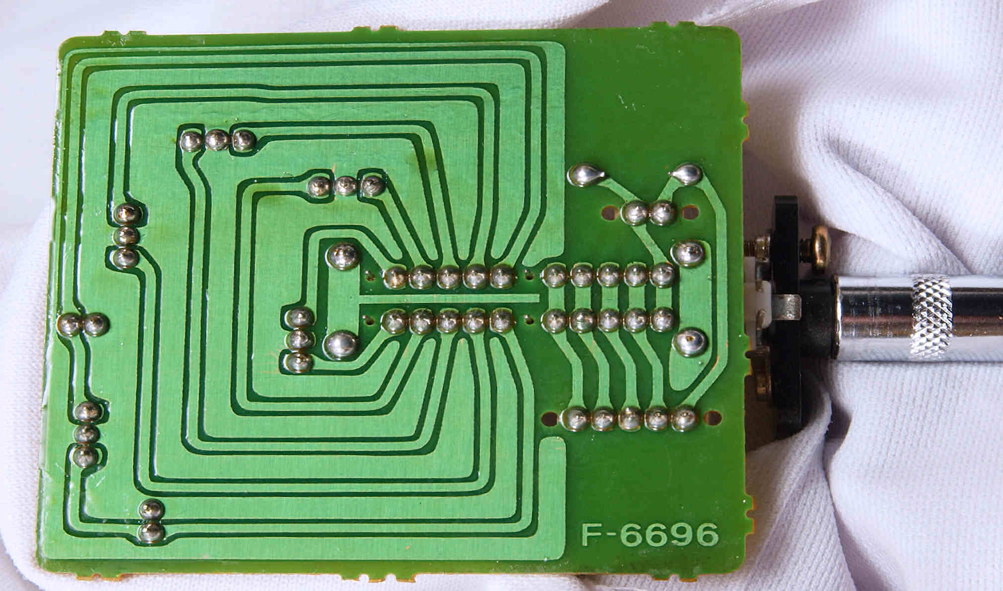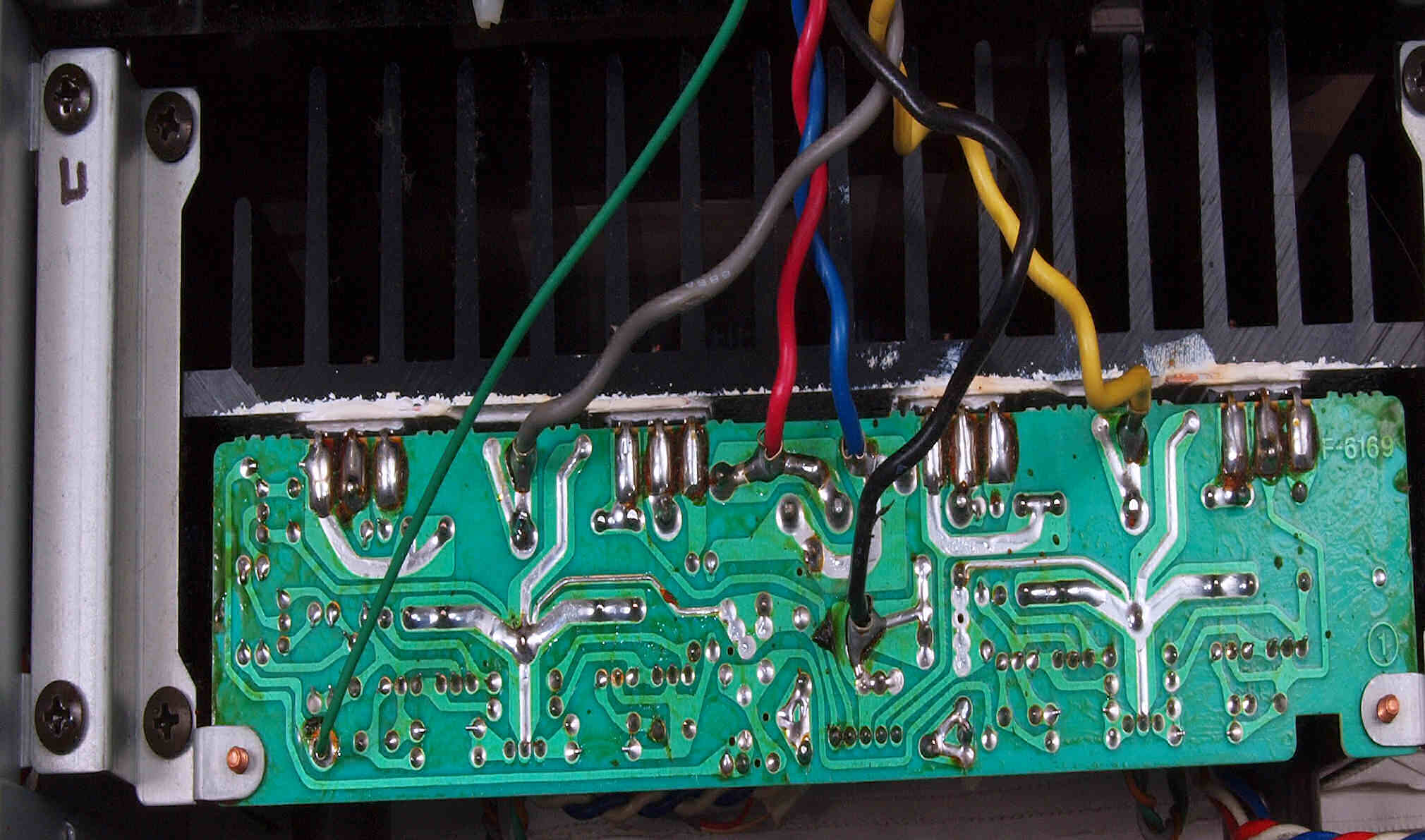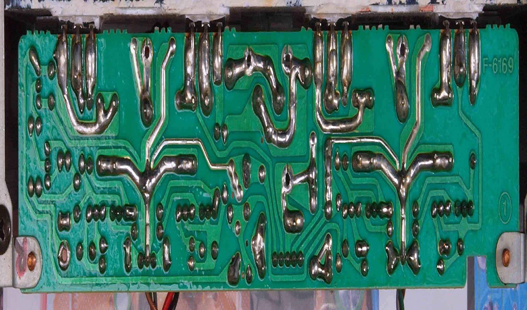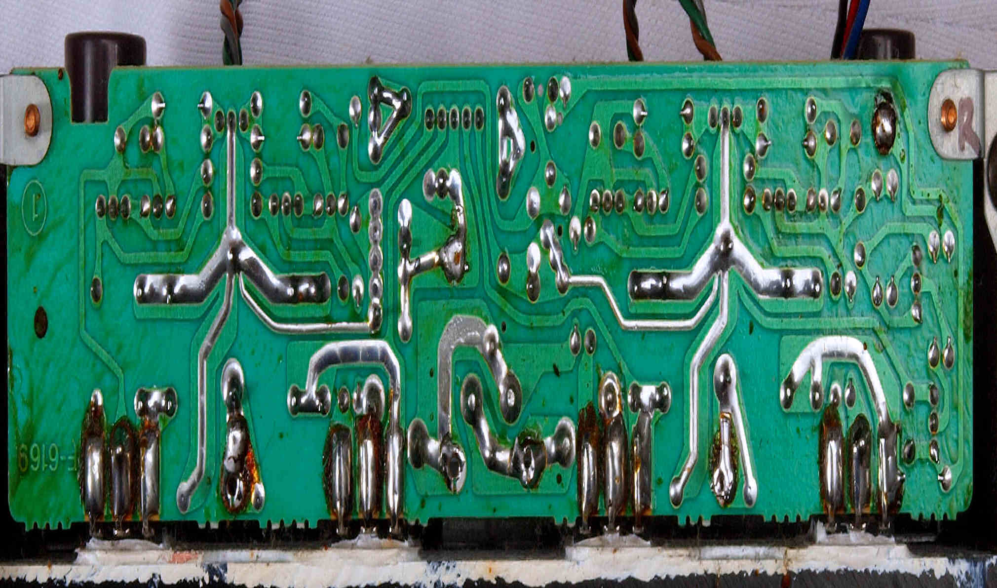 C34. 修理(半田補正)後 L側・ドライブ終段TR(トランジスター)基板裏、 全半田やり直し。
