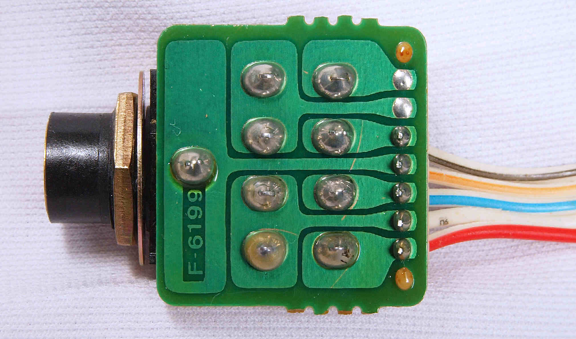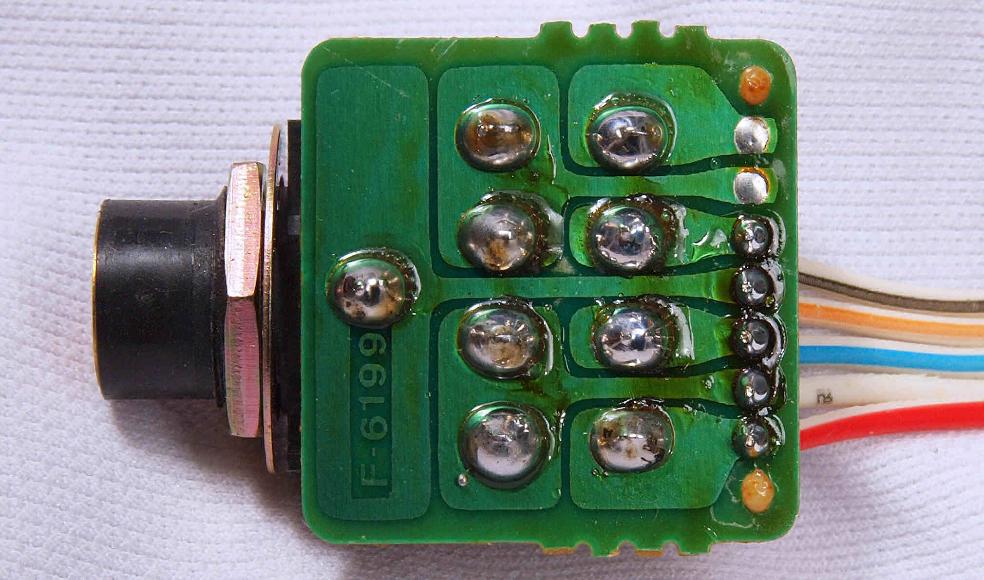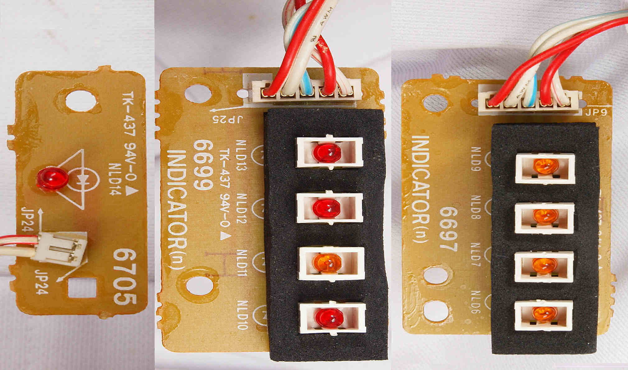 表示LED、 左端=メモリーNo、 中左=周波数測定、 中右=出力電圧測定、 右端=歪み率測定。