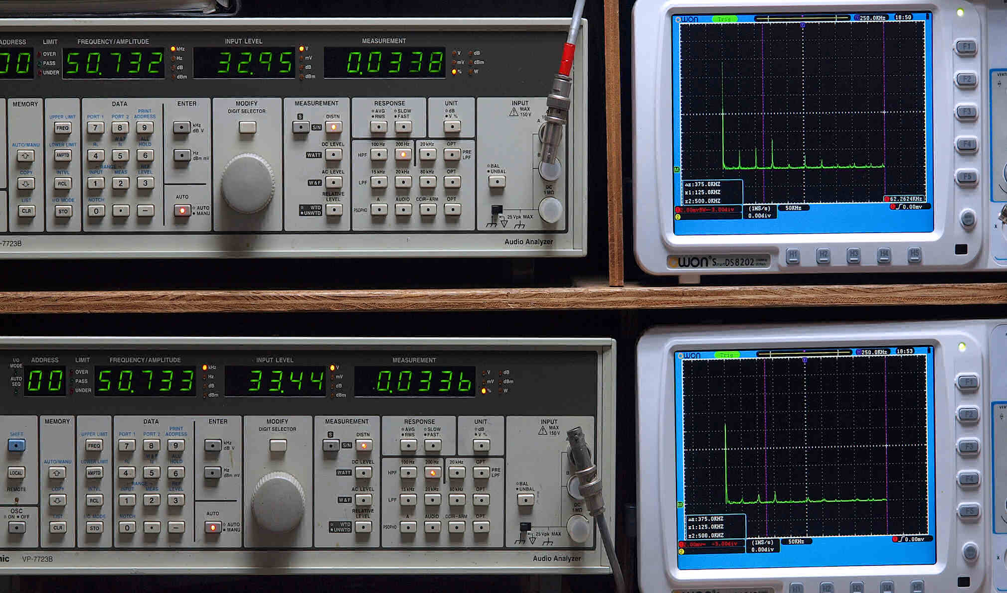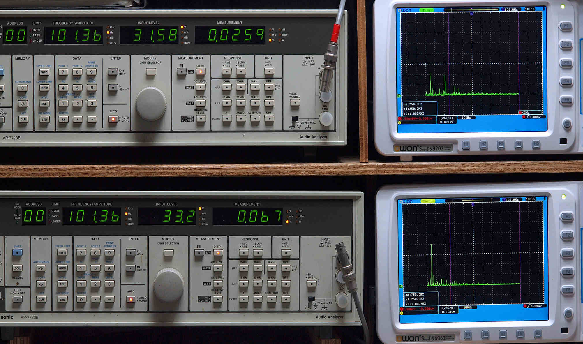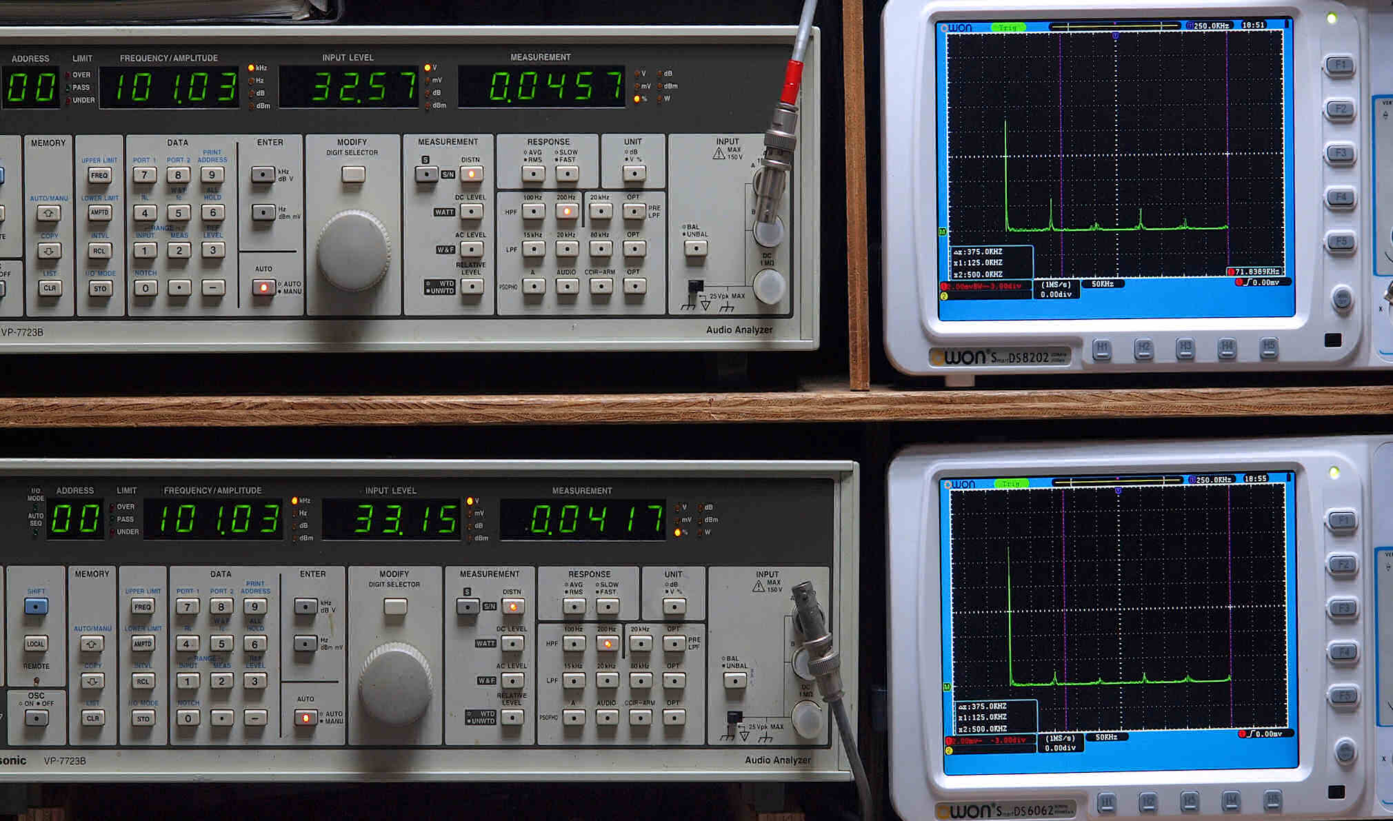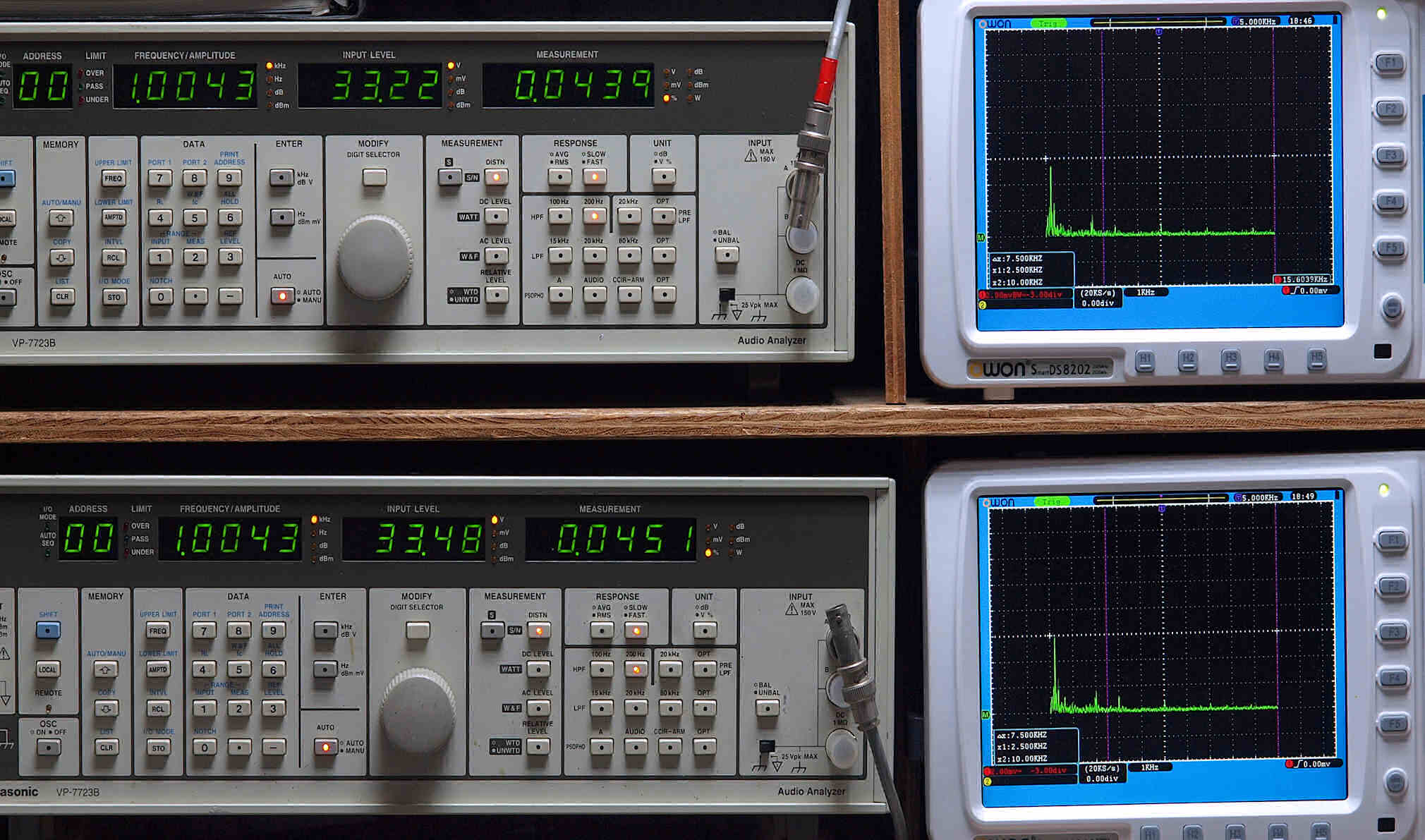 よって、ダイアル設定出力レベルより低くなります。測定機器の仕様や整備の様子はこちら、「VP−7723B」「VP−7201A」。 FFT画面の見方はこちら。