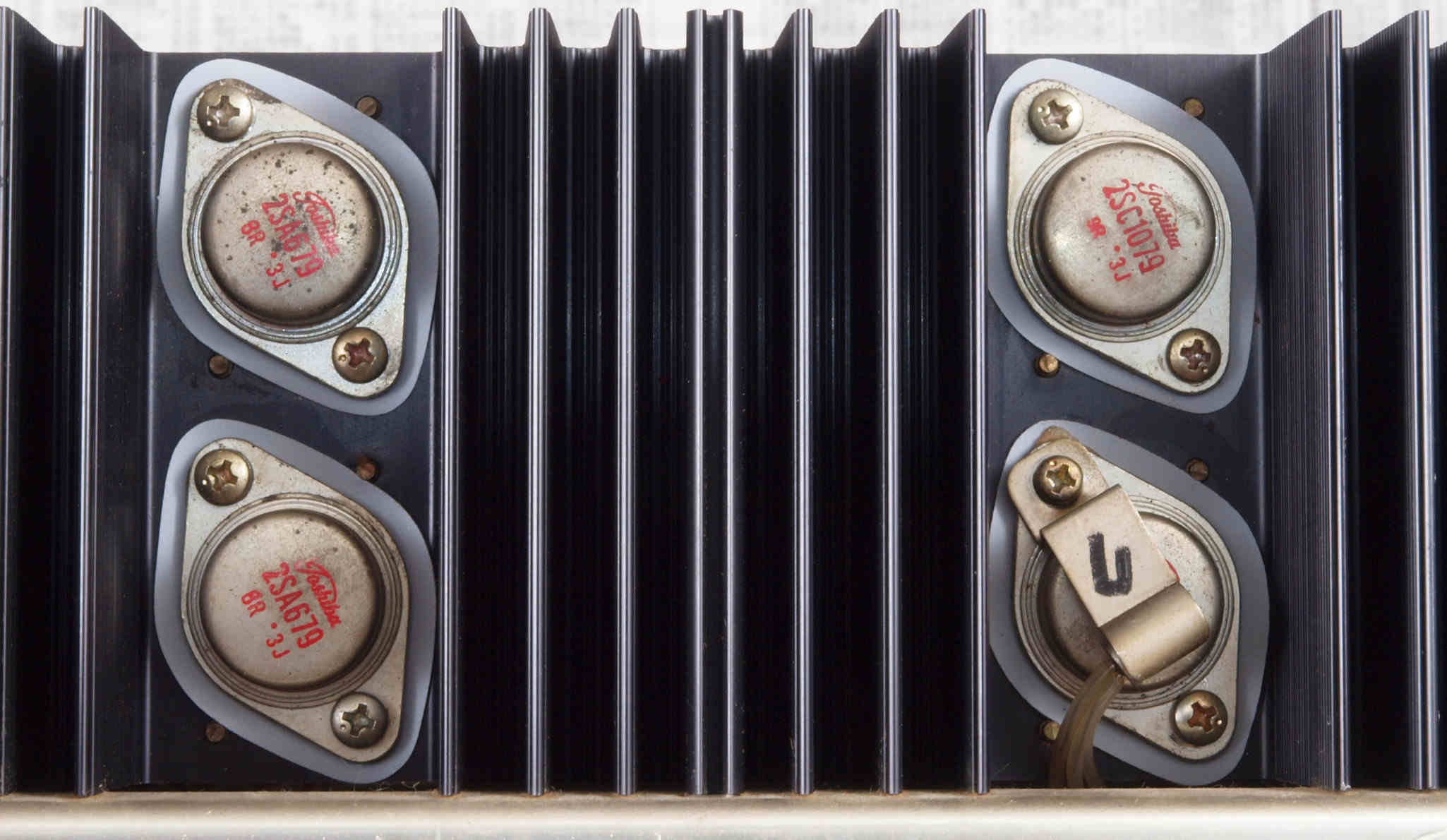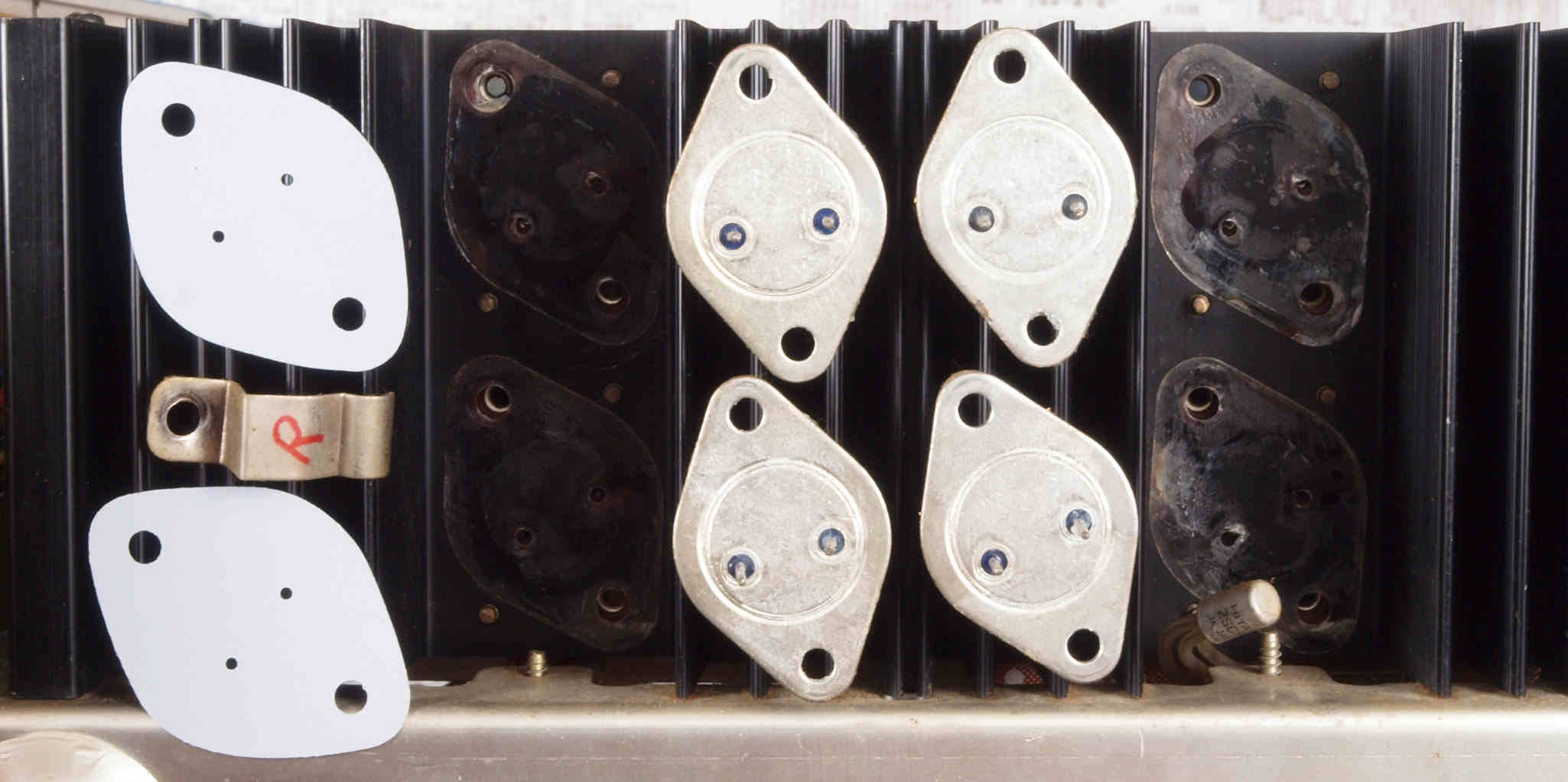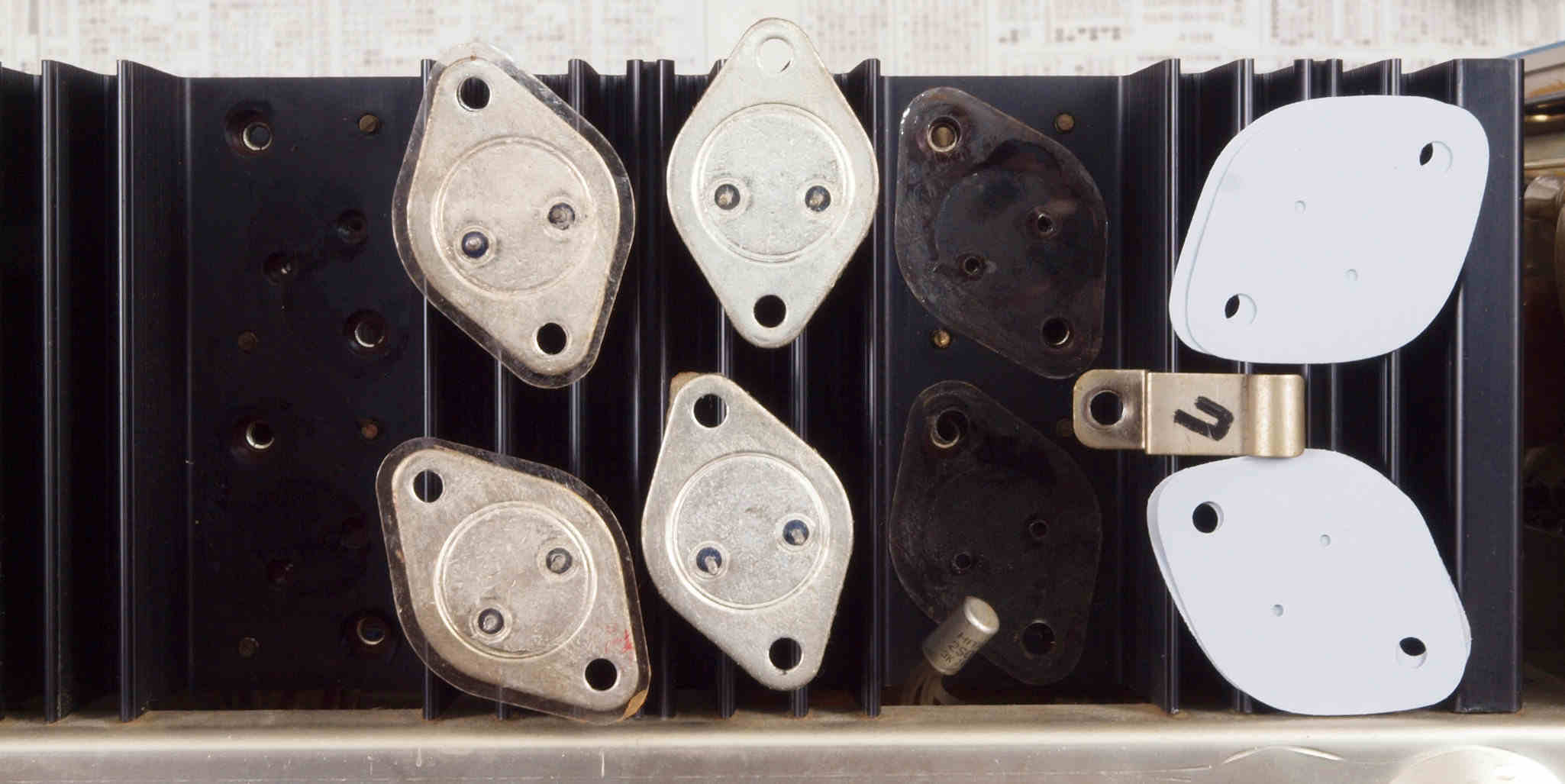 | C12. 修理中 R側 終段トランジスター。 熱でシリコングリスが流れ出し殆ど無い、テフロンシートに交換する。 | ||||||||||||||||||||||||||||||||||||||||||