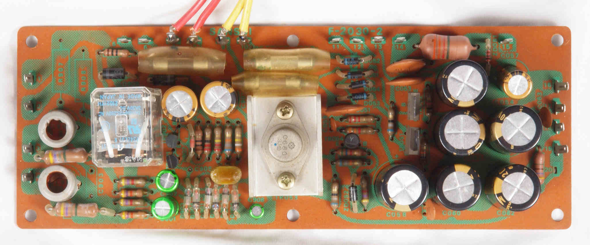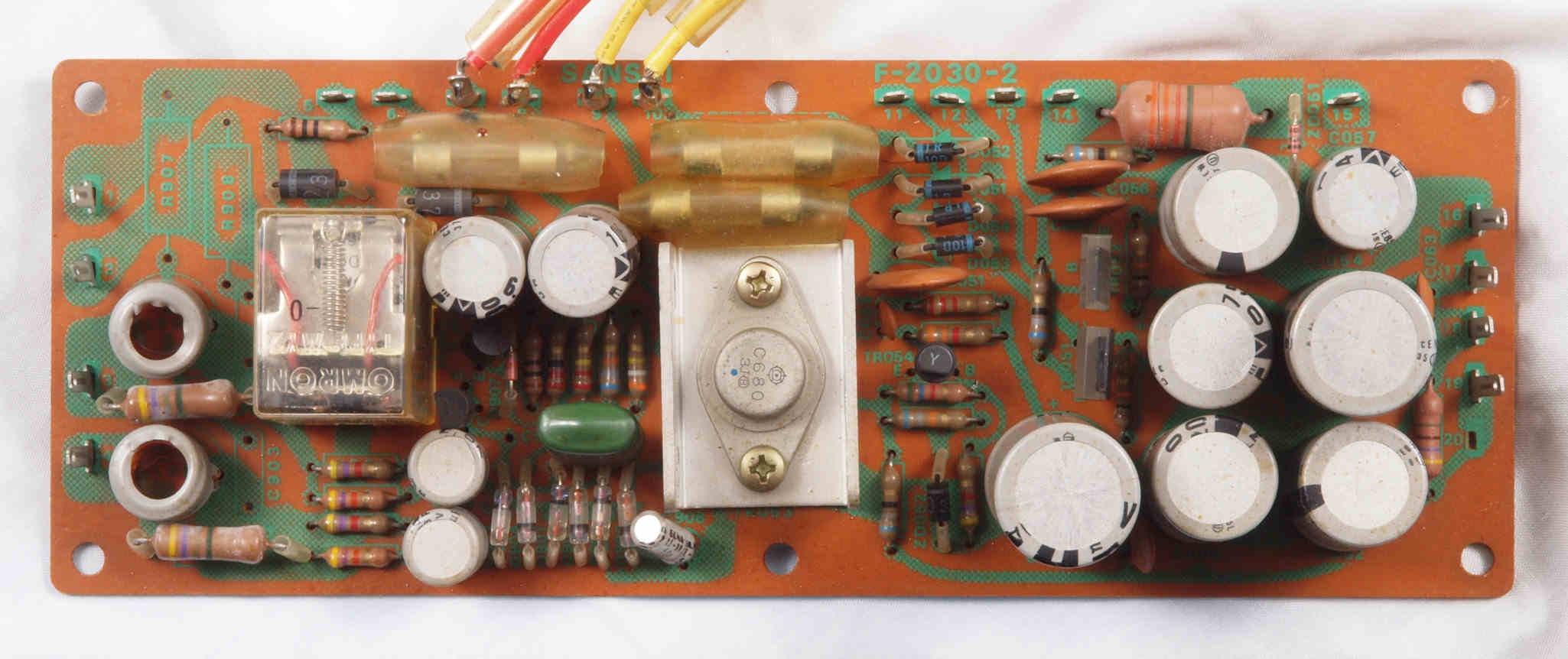 | C42. 修理後 整流・プロテクト基板 SP接続リレー、電解コンデンサー12個、フイルムコンデンサー1個交換 | ||||||||||||||||||||||||||||||||||||||||||