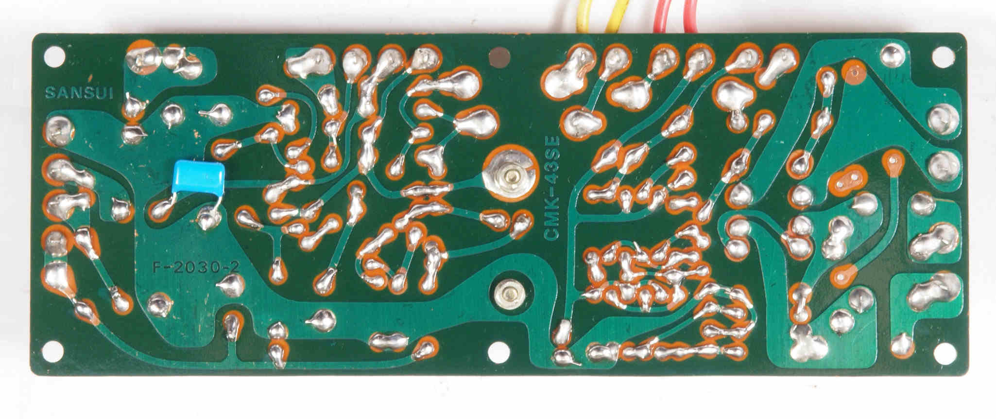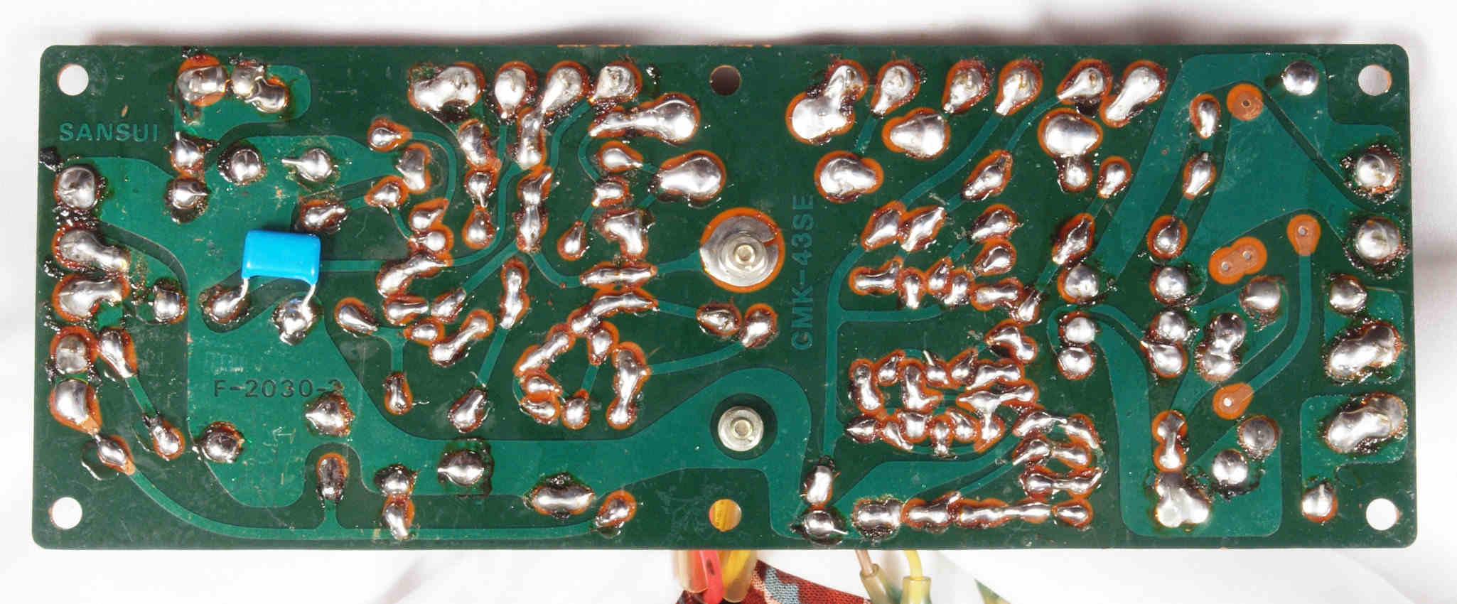| C44. 修理後(半田補正)後 整流・プロテクト基板裏 全ての半田をやり直す。フイルムコンデンサー1個追加。 | ||||||||||||||||||||||||||||||||||||||||||