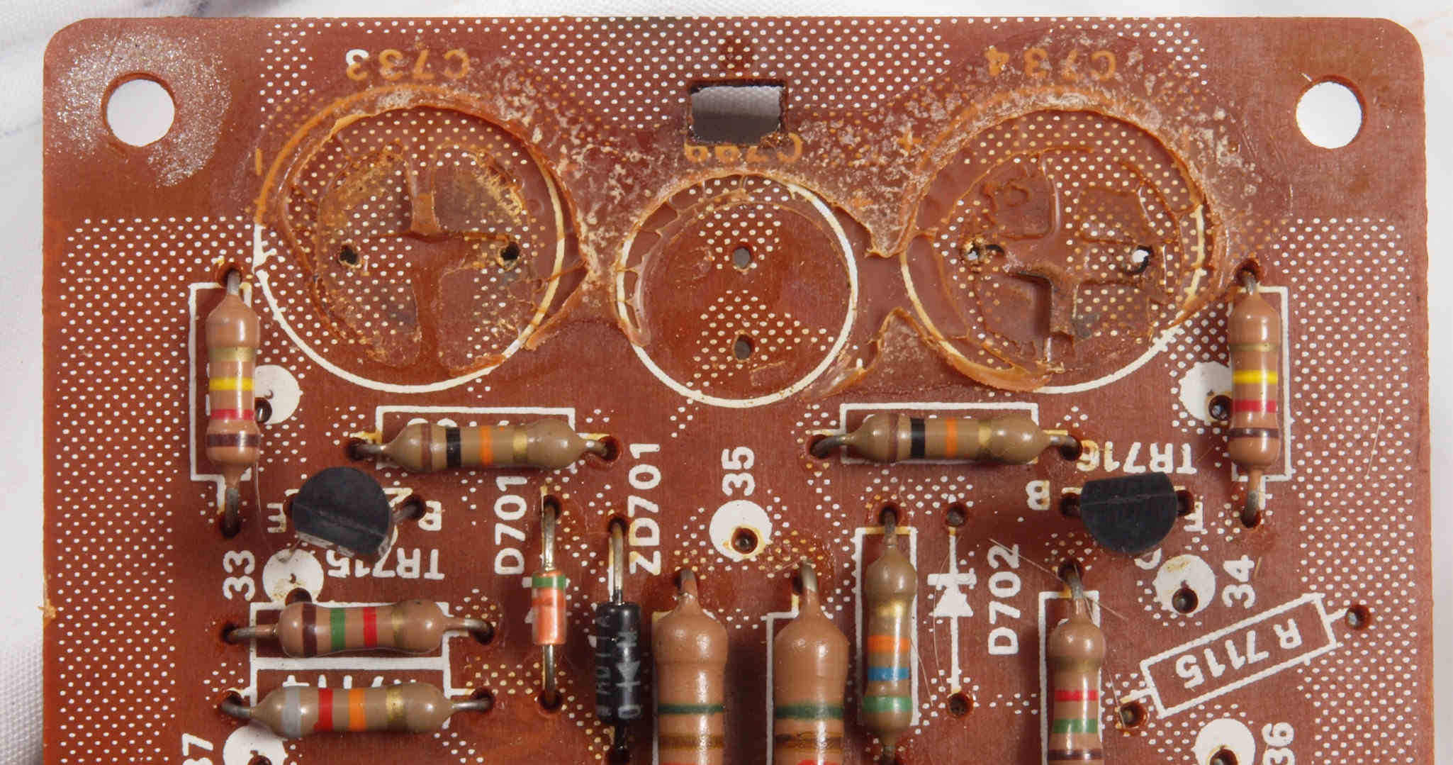 | CG1. 修理前 電源ブロック電解コンデンサー下周り。 | ||||||||||||||||||||||||||||||||||||||||||