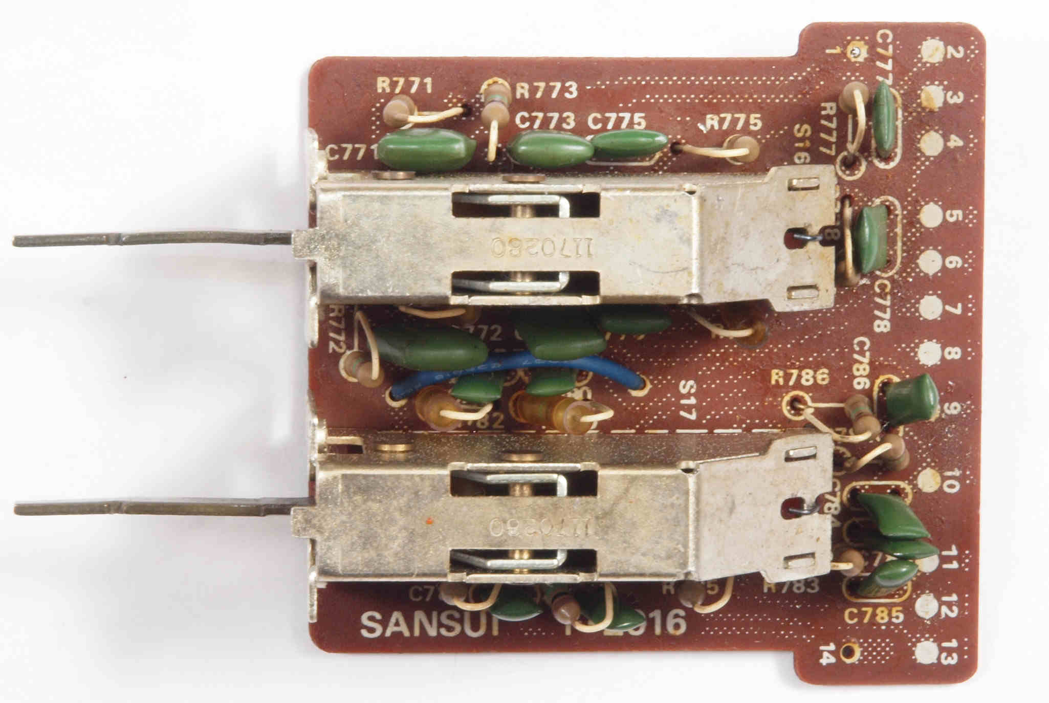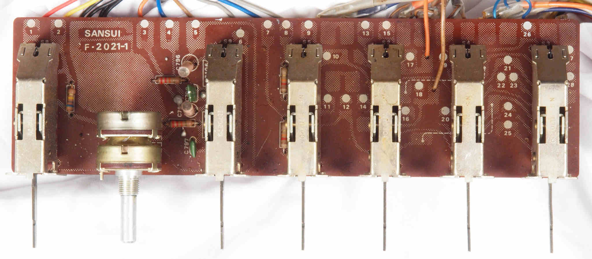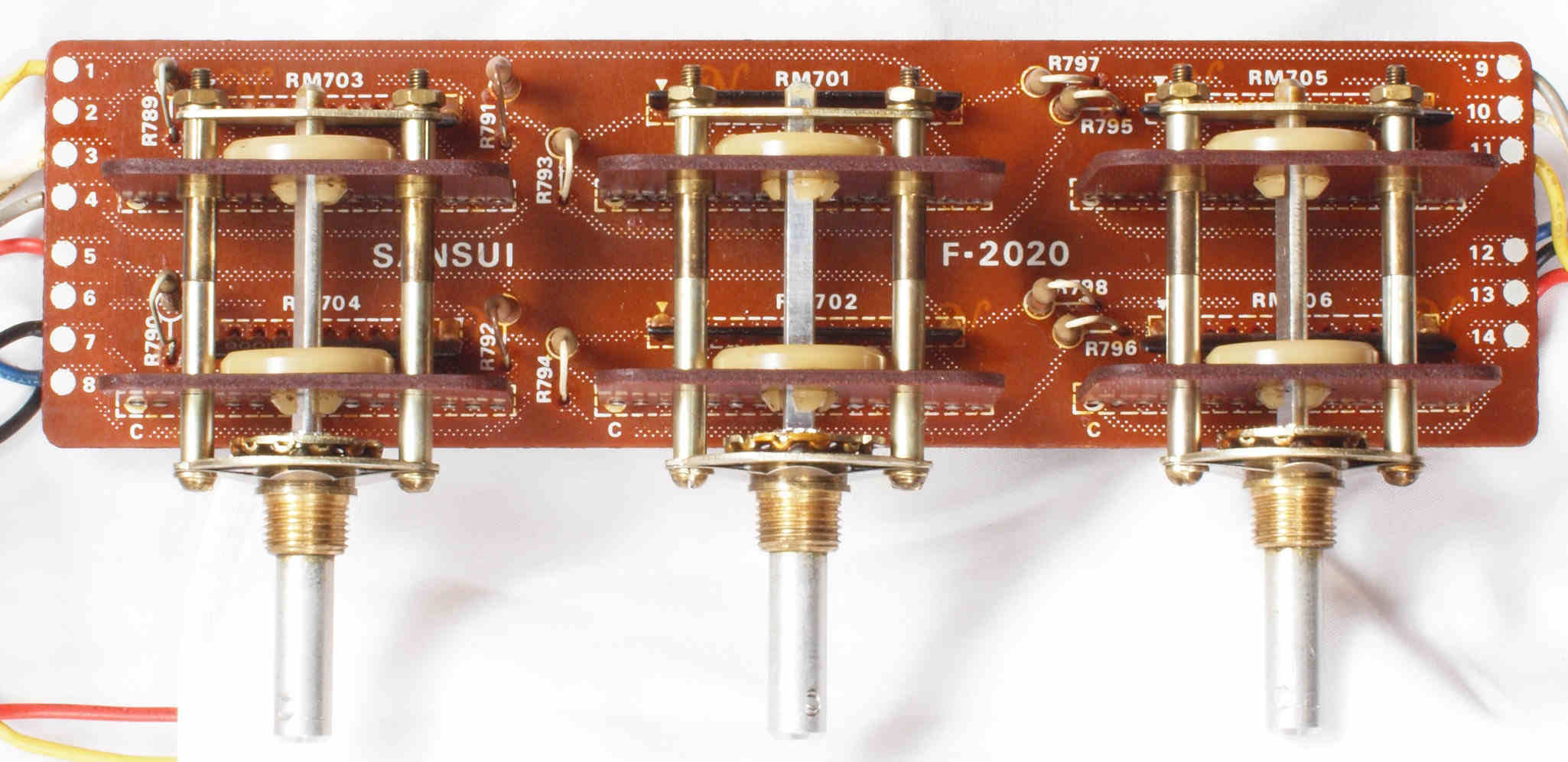 | CJ1. 修理前 TAPE1入力VR、TEAP2入力VR,AUX入力VR基板。 | ||||||||||||||||||||||||||||||||||||||||||