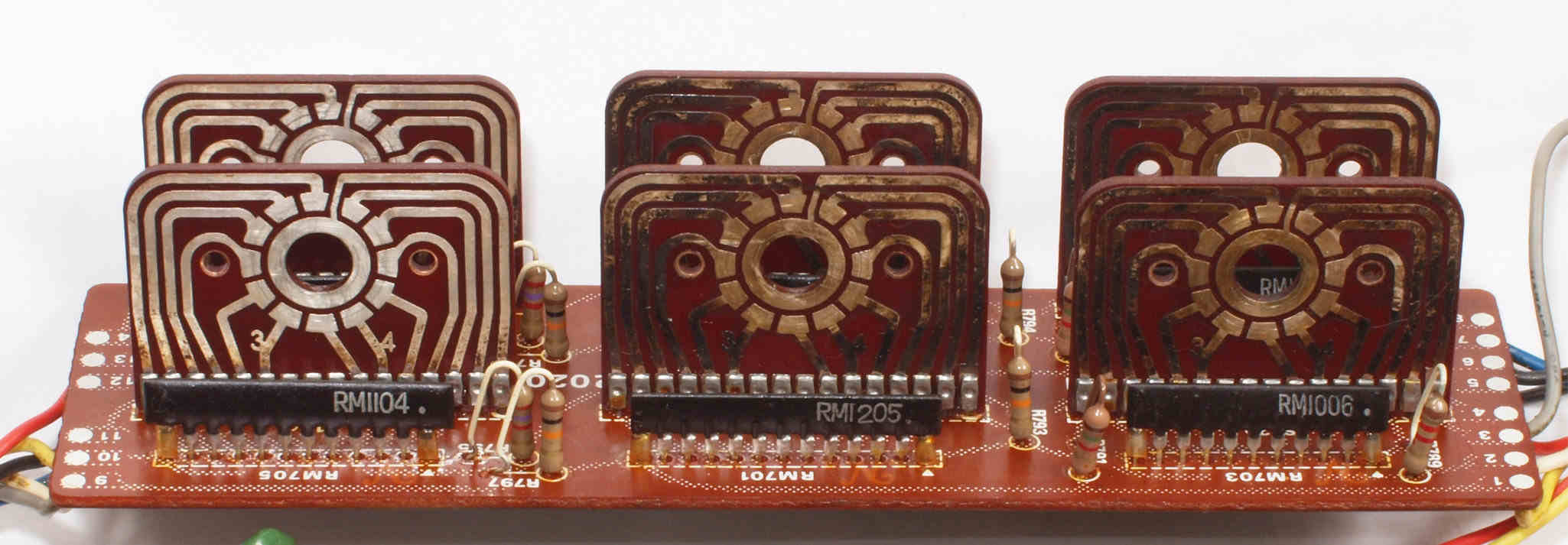 | C73. 修理中 TONE−VR基板。 左=清掃後、右2個=清掃前。 | ||||||||||||||||||||||||||||||||||||||||||
