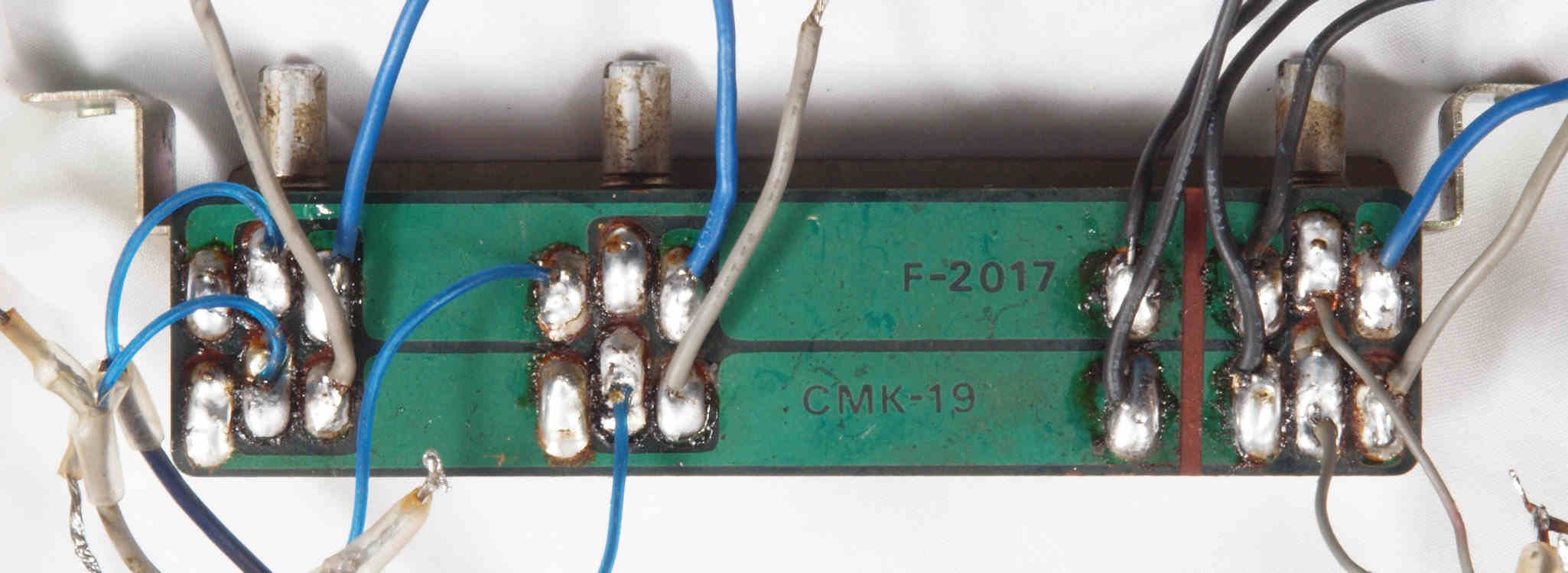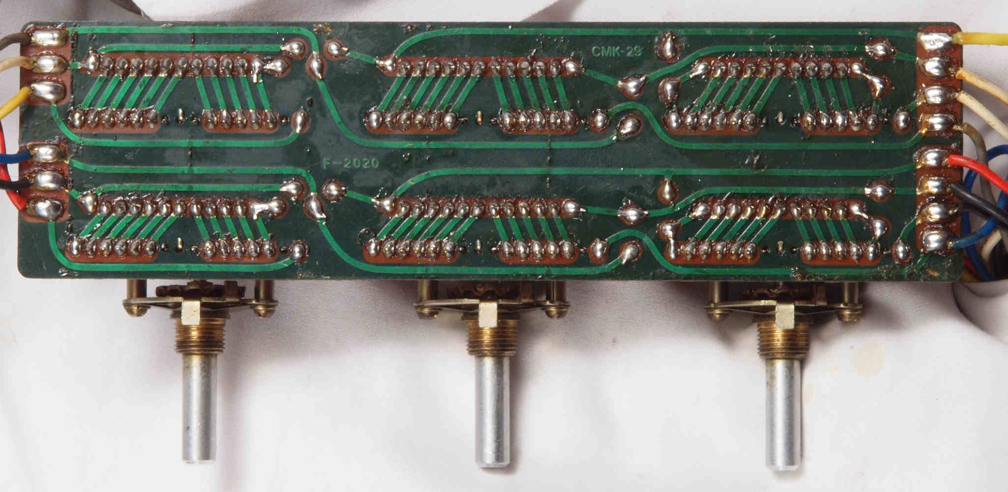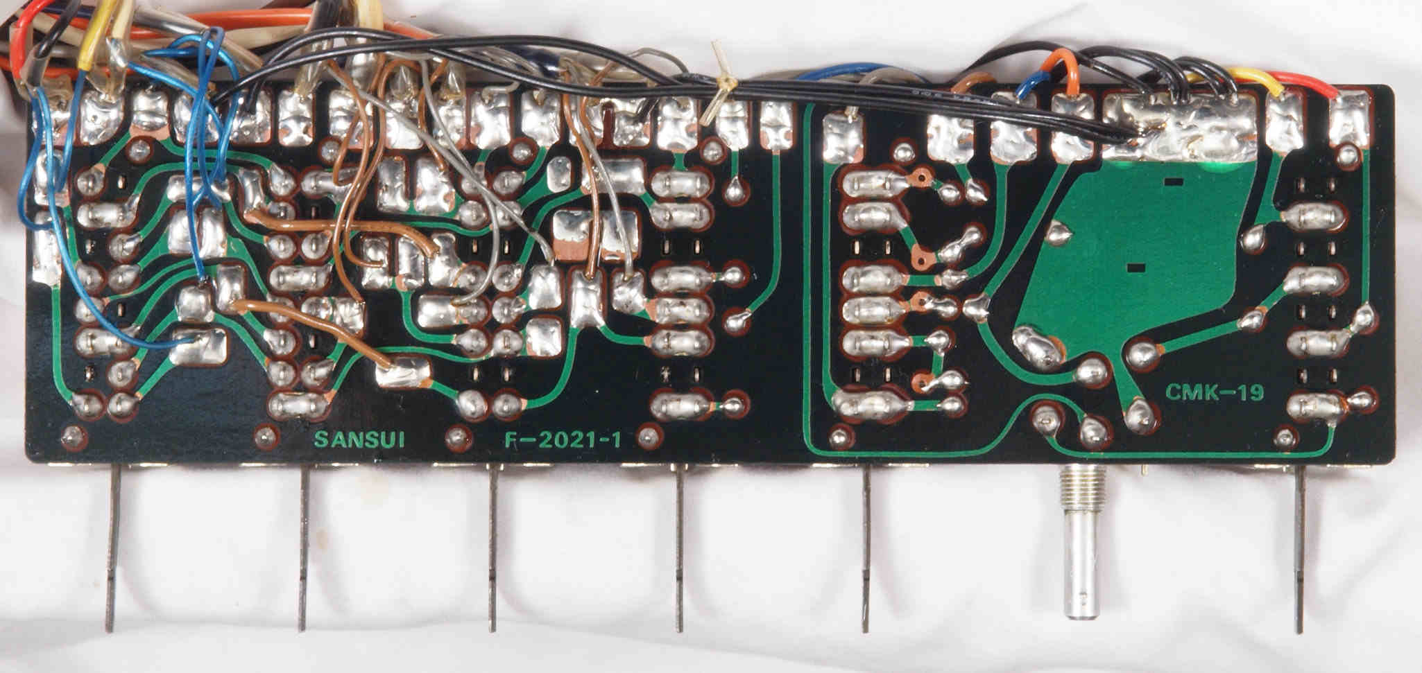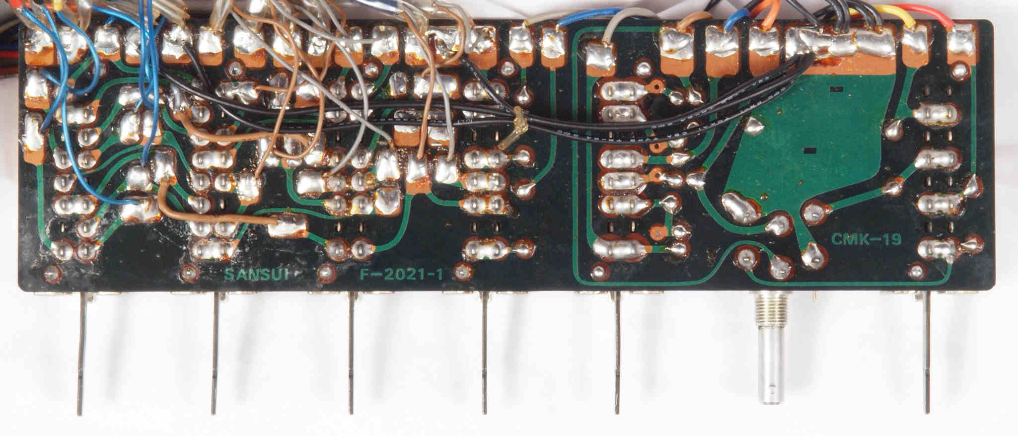 | CJ4. 完成TAPE1入力VR、TEAP2入力VR,AUX入力VR基板裏。 全ての半田をやり直して洗浄し、コート液を塗布。 | ||||||||||||||||||||||||||||||||||||||||||