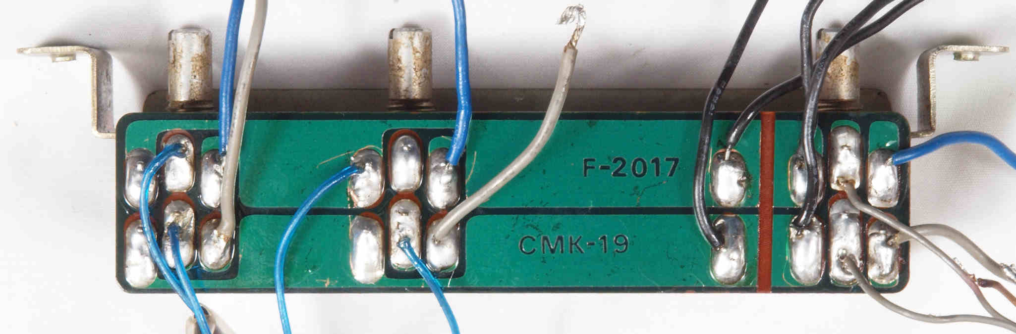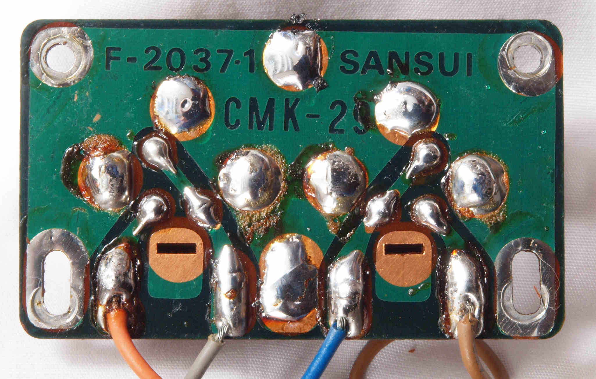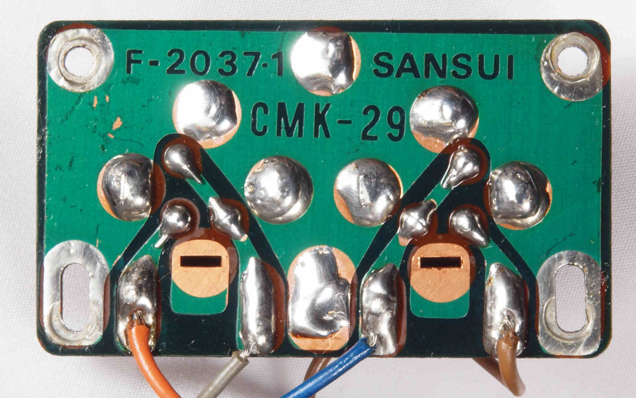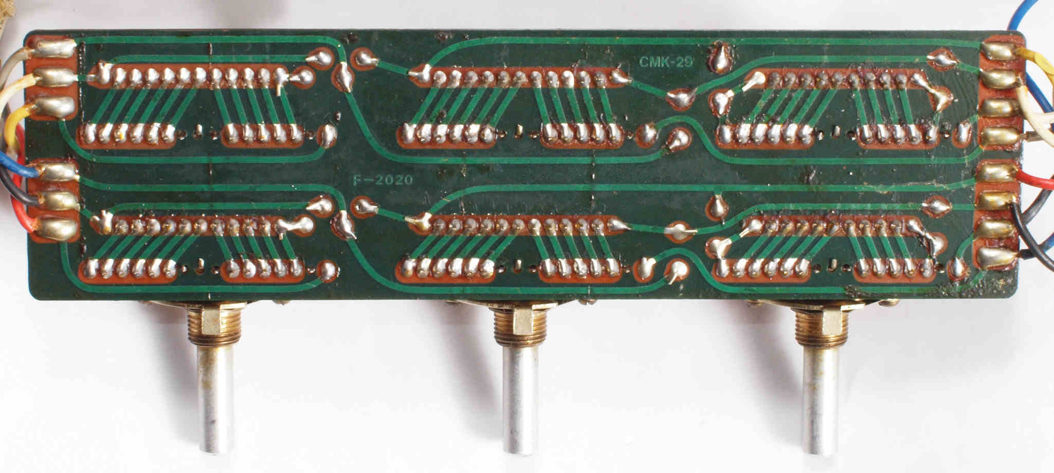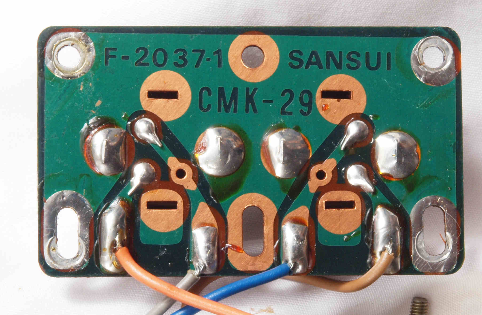 | CJ4. 完成TAPE1入力VR、TEAP2入力VR,AUX入力VR基板裏。 全ての半田をやり直して洗浄し、コート液を塗布。 | ||||||||||||||||||||||||||||||||||||||||||