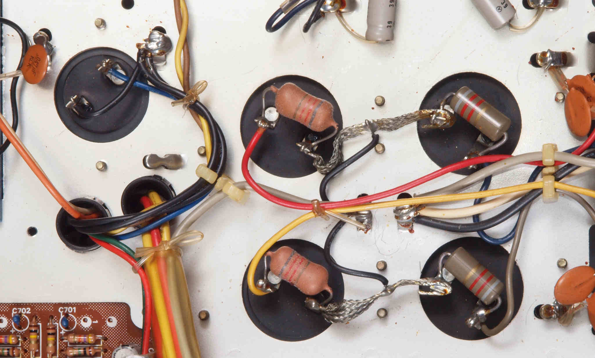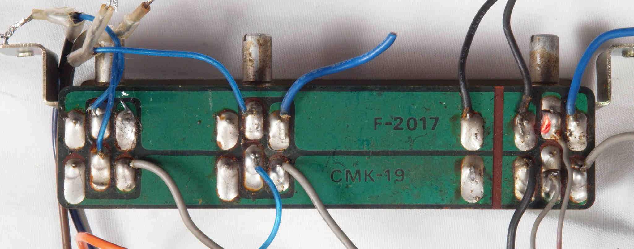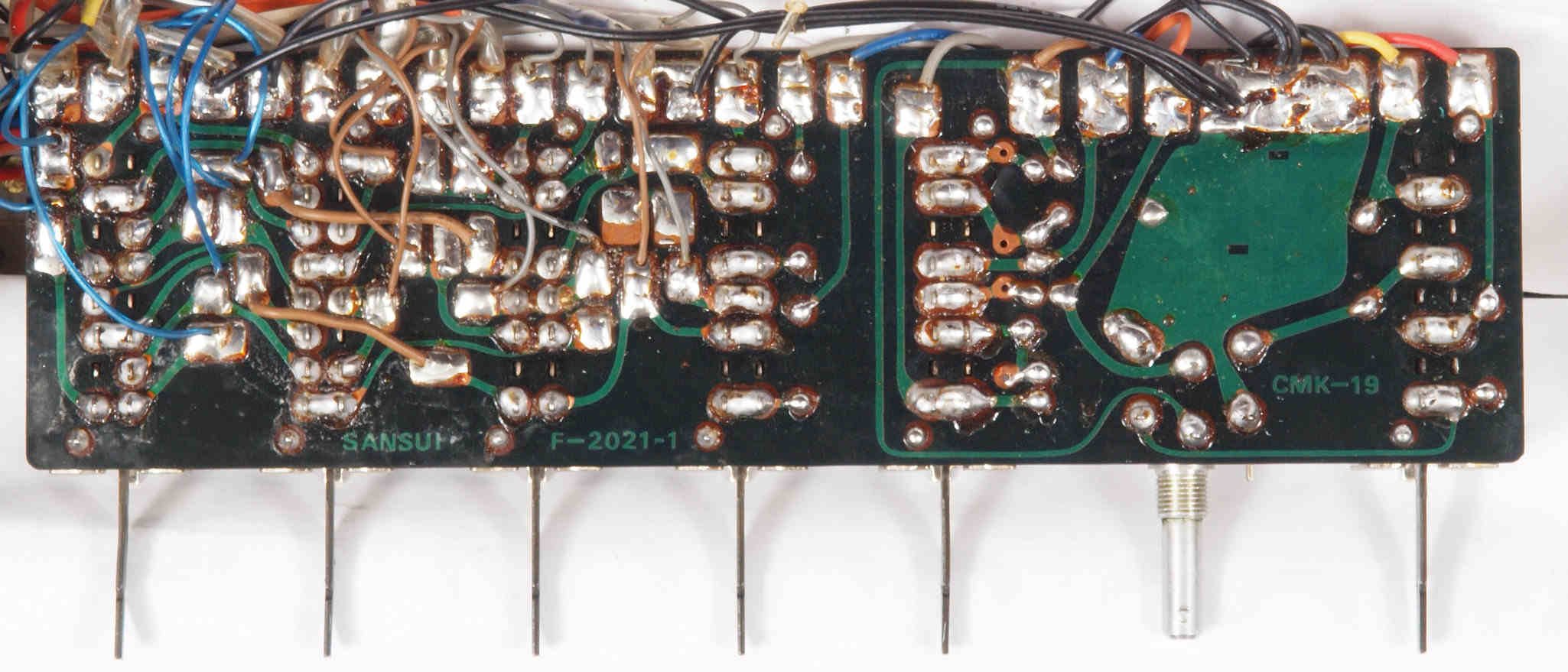 | CJ2. 修理前 TAPE1入力VR、TEAP2入力VR,AUX入力VR基板裏。 | ||||||||||||||||||||||||||||||||||||||||||
