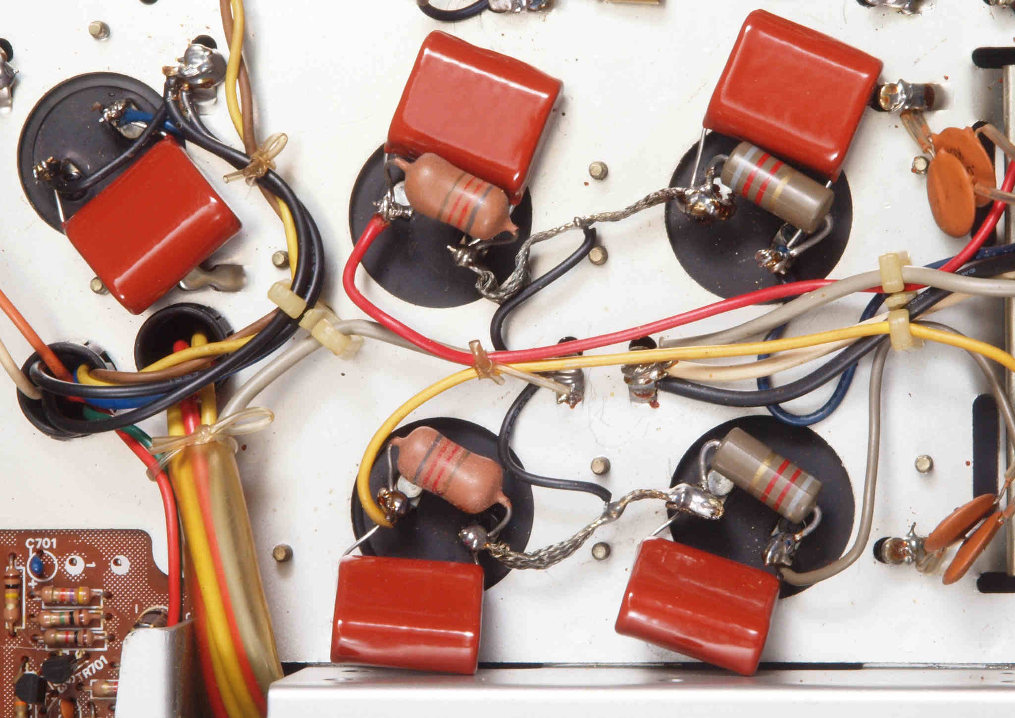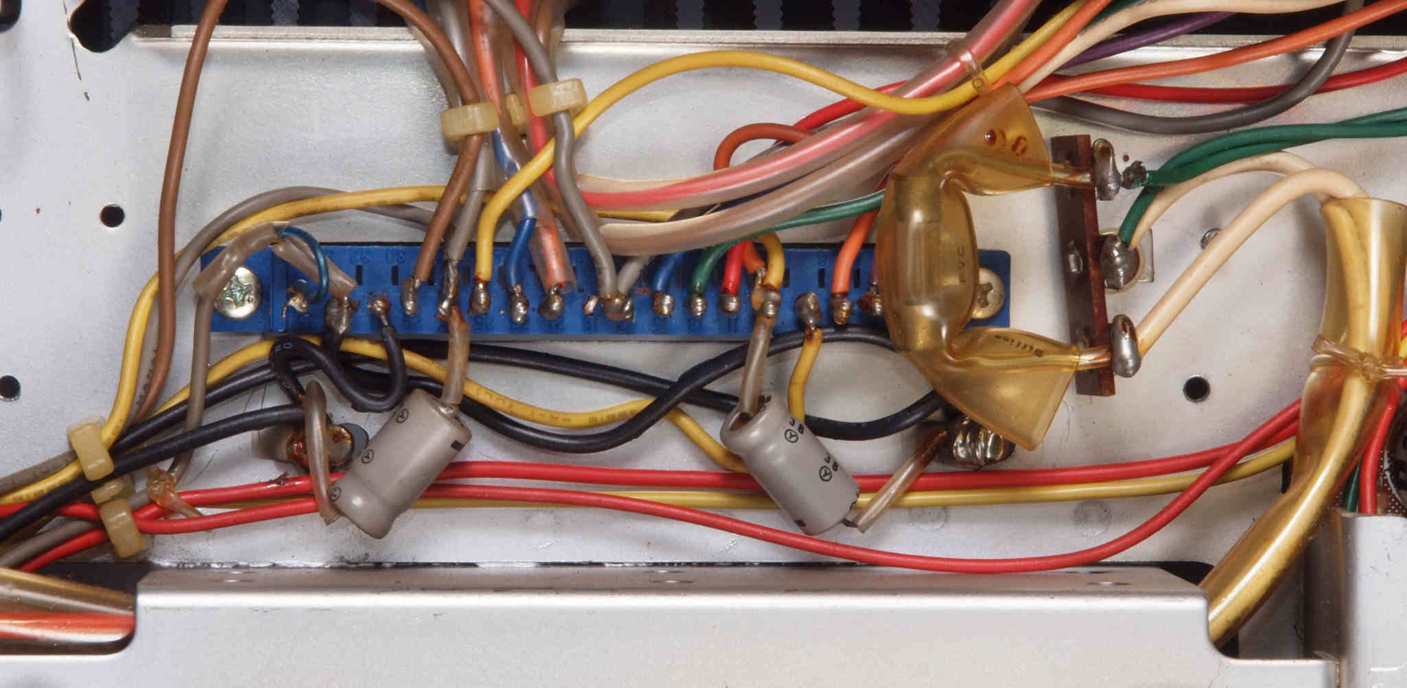 | CG2. 修理後 電源ブロック電解コンデンサー下周り。 フイルムコンデンサー5個追加。 | ||||||||||||||||||||||||||||||||||||||||||
