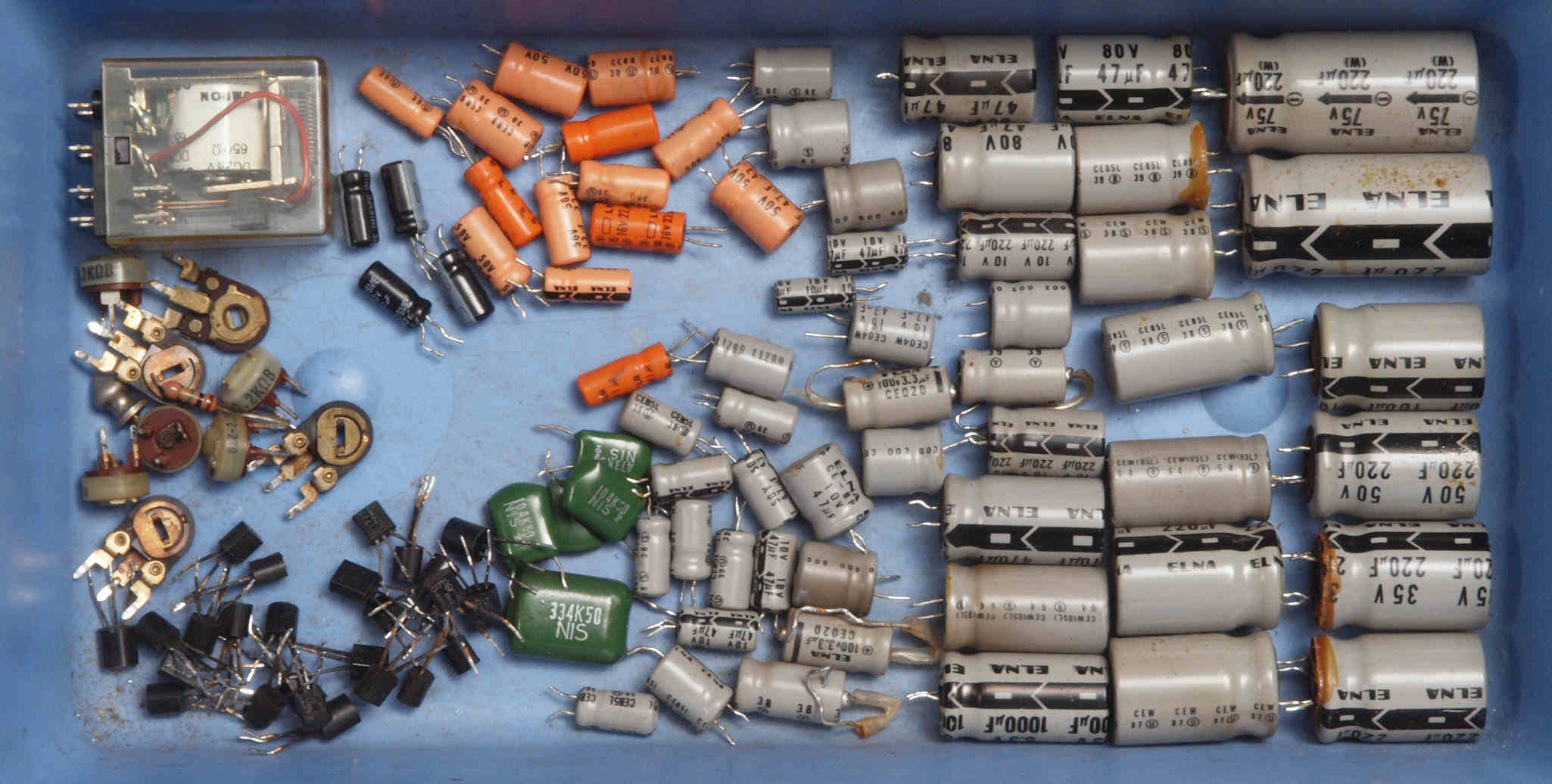 | A71. 点検中 使用する電解コンデンサーの比較。 原則電源回りにKZを使用しますが、大きさ・電気性能が異なるので、使用出来ない場所があります 左=nichiconKZ、中=nichiconFG(FinGold)、右=nichiconFX |