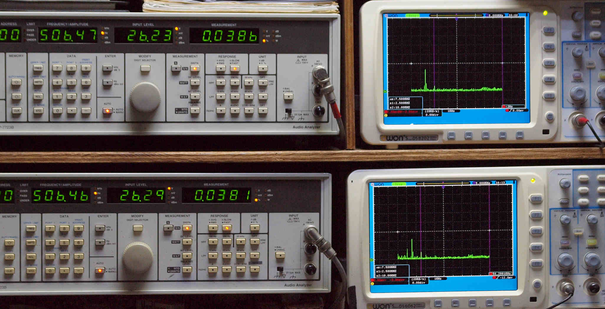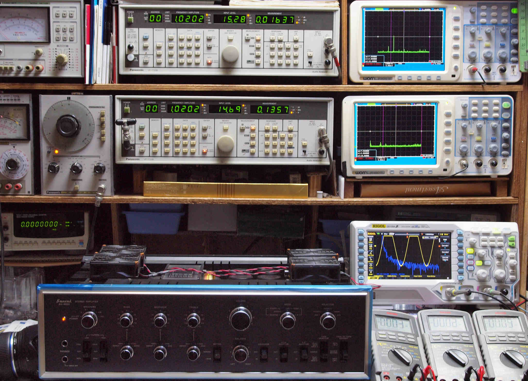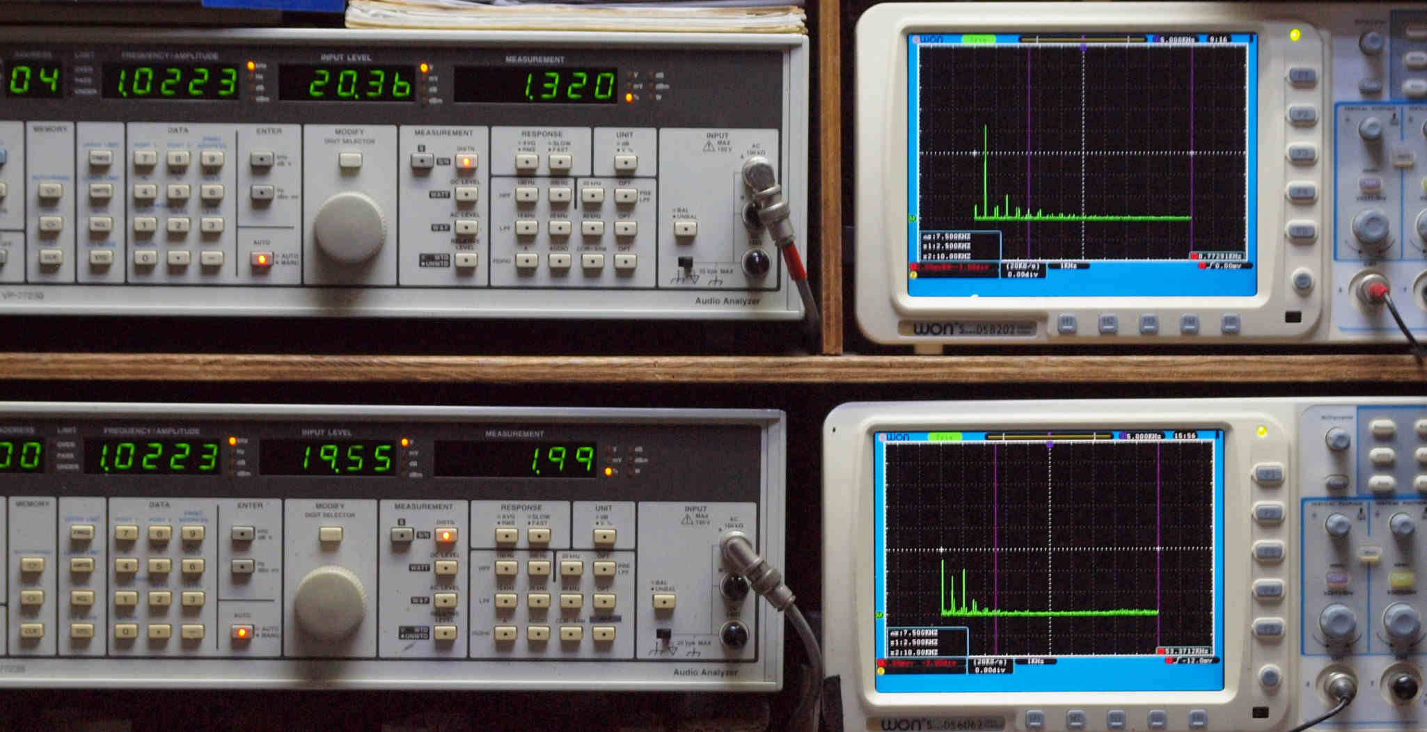 | E. 測定・調整。 画像をクリックすると、大きく(横幅2050ドット)表示されます。 E0. 出力・歪み率測定・調整 「見方」。 上段中 右側SP出力を「Audio Analyzer Panasonic VP−7723B」により測定。 表示LED、 左端=メモリーNo、 中左=周波数測定、 中右=出力電圧測定、 右端=歪み率測定。 上段右端 VP−7723Bの基本波除去出力を「owon SDS8202(200MHZ)」で「FFT分析」表示。 下段中 左側SP出力を「Audio Analyzer Panasonic VP−7723B」により測定。 表示LED、 左端=メモリーNo、 中左=周波数測定、 中右=出力電圧測定、 右端=歪み率測定。 下段右端 VP−7723Bの基本波除去出力を「owon SDS6062(200MHZ)」で「FFT分析」表示。 下段左端 オーディオ発振器 VP−7201A より50Hz〜100kHzの信号を出し(歪み率=約0.003%)、ATT+分配器を通し、AMPに入力。 よって、ダイアル設定出力レベルより低くなります。測定機器の仕様や整備の様子はこちら、「VP−7723B」「VP−7201A」。 FFT画面の見方はこちら。 |