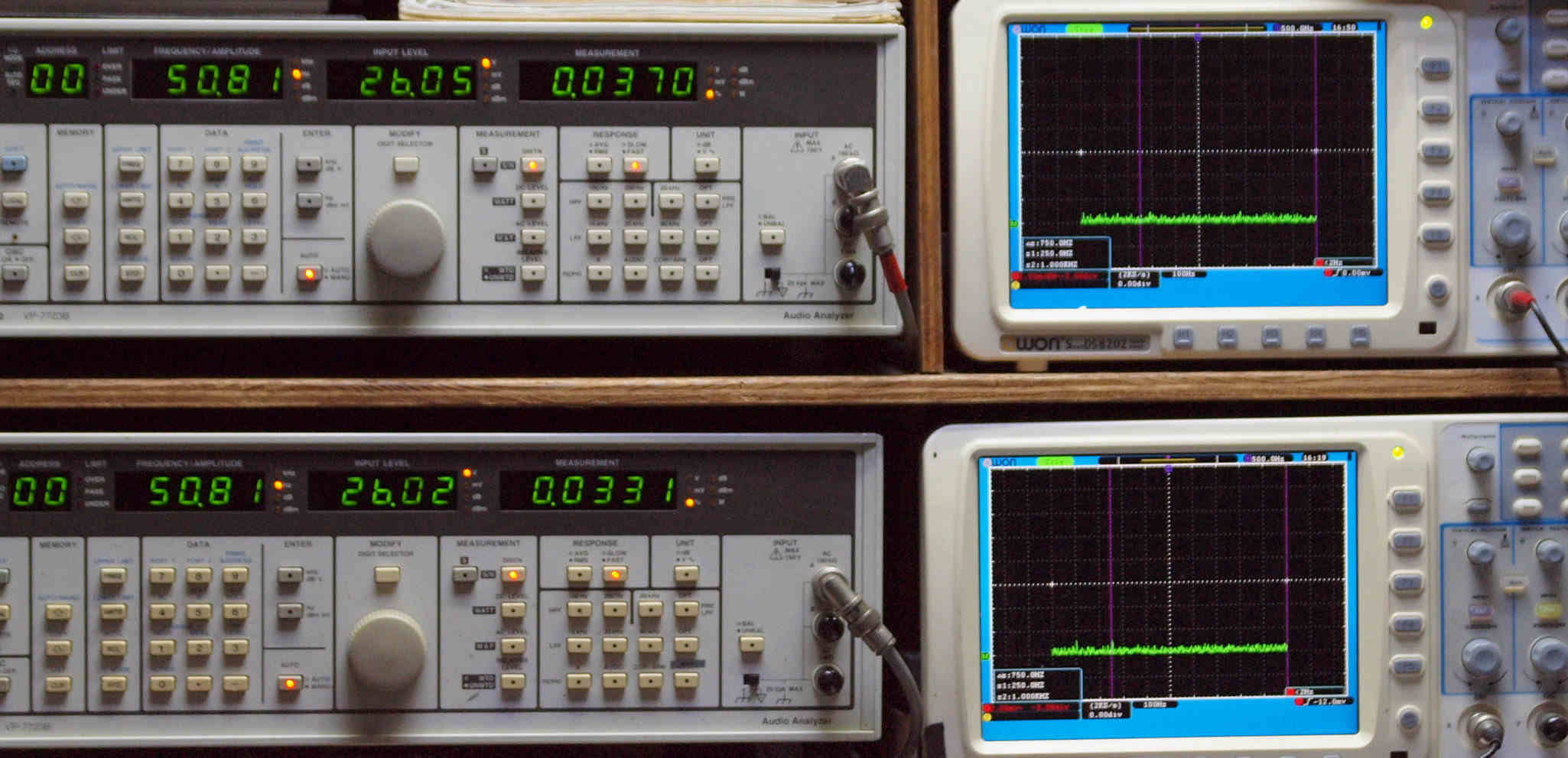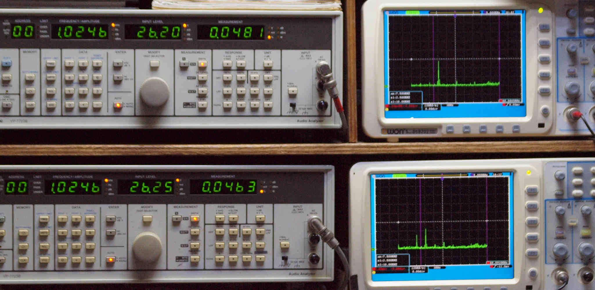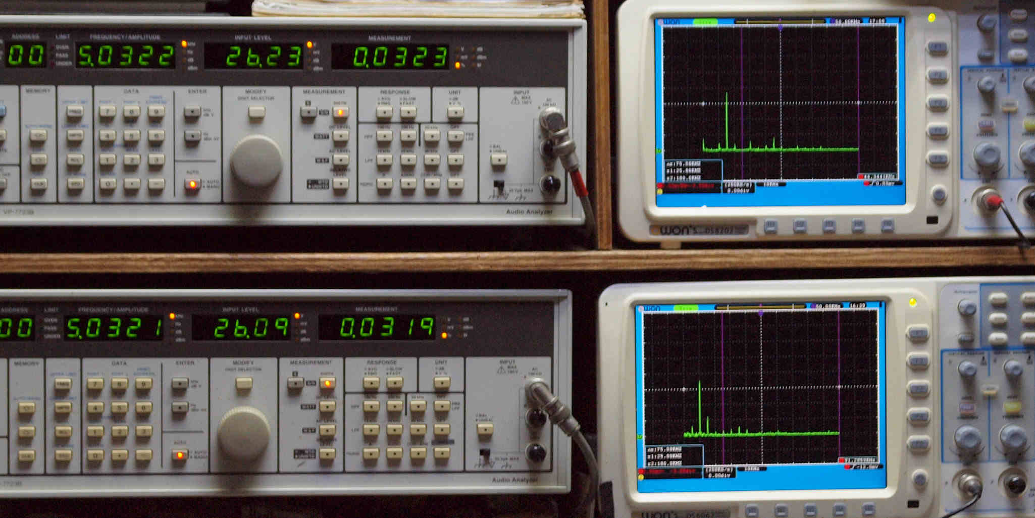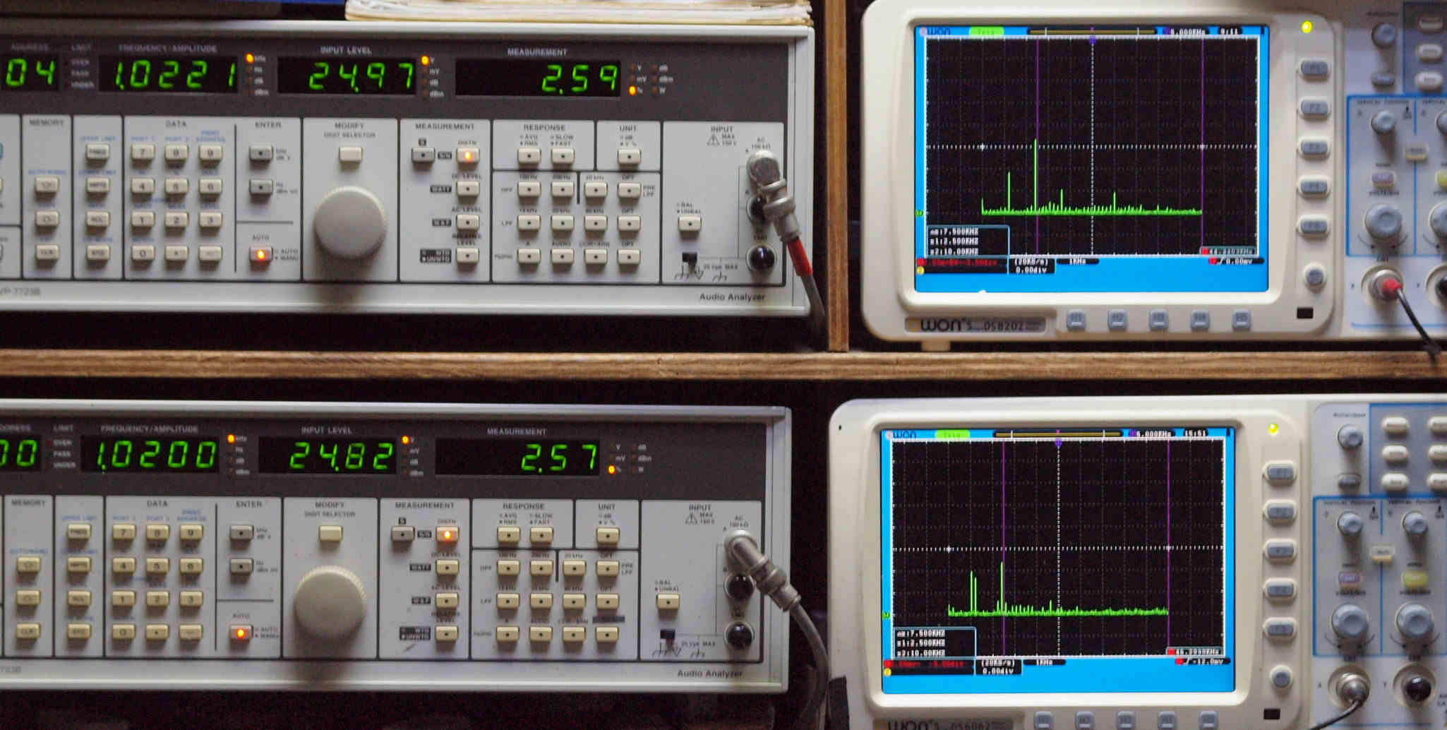 | E. 測定・調整。 画像をクリックすると、大きく(横幅2050ドット)表示されます。 E0. 出力・歪み率測定・調整 「見方」。 上段中 右側SP出力を「Audio Analyzer Panasonic VP−7723B」により測定。 表示LED、 左端=メモリーNo、 中左=周波数測定、 中右=出力電圧測定、 右端=歪み率測定。 上段右端 VP−7723Bの基本波除去出力を「owon SDS8202(200MHZ)」で「FFT分析」表示。 下段中 左側SP出力を「Audio Analyzer Panasonic VP−7723B」により測定。 表示LED、 左端=メモリーNo、 中左=周波数測定、 中右=出力電圧測定、 右端=歪み率測定。 下段右端 VP−7723Bの基本波除去出力を「owon SDS6062(200MHZ)」で「FFT分析」表示。 下段左端 オーディオ発振器 VP−7201A より50Hz〜100kHzの信号を出し(歪み率=約0.003%)、ATT+分配器を通し、AMPに入力。 よって、ダイアル設定出力レベルより低くなります。測定機器の仕様や整備の様子はこちら、「VP−7723B」「VP−7201A」。 FFT画面の見方はこちら。 |