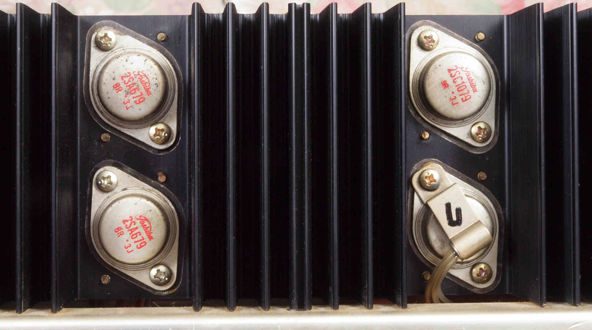 | C142. 修理中 L側 終段終段トランジスター。前回の修理時、止めビス1本がネジ山つぶれ。 | ||||||||||||||||||||||||||||||||||||||||||